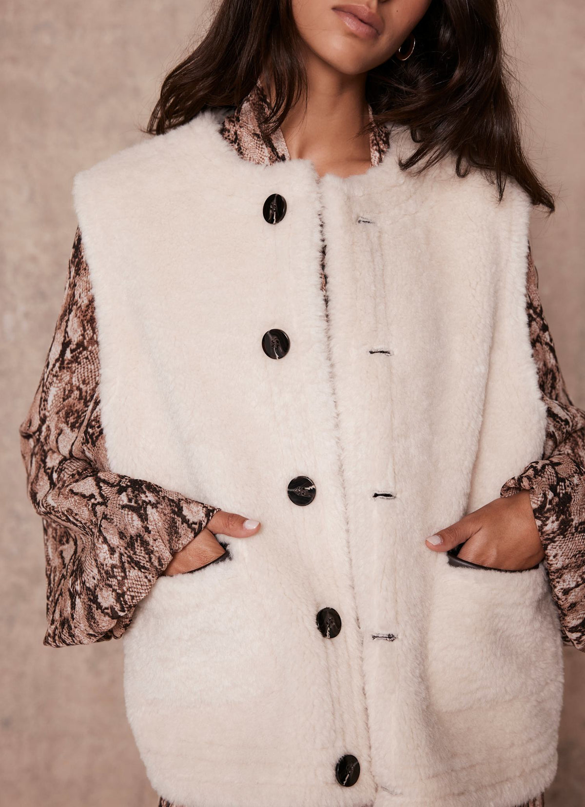 - Brown reversible borg sleeveless gilet featuring square pockets and button fastening through the front.