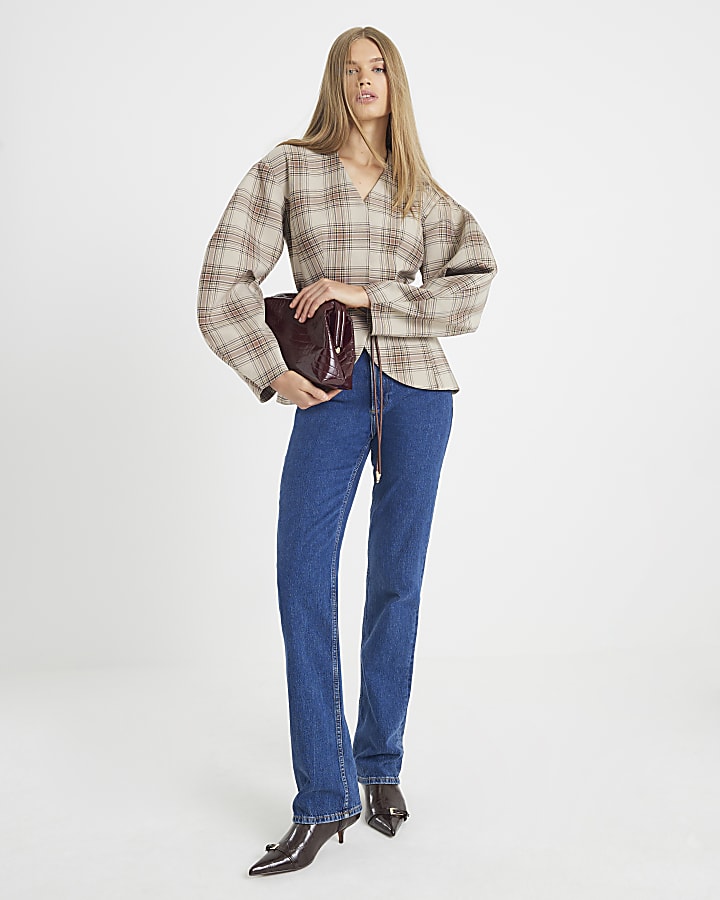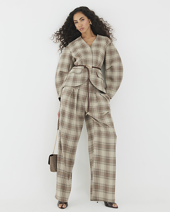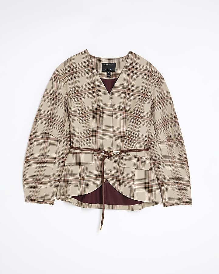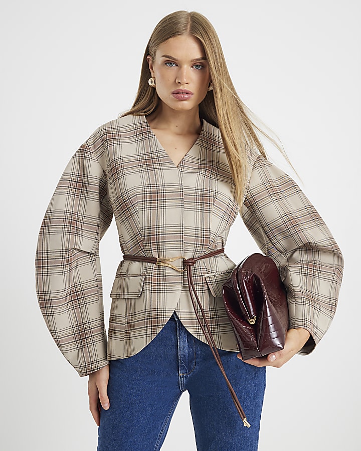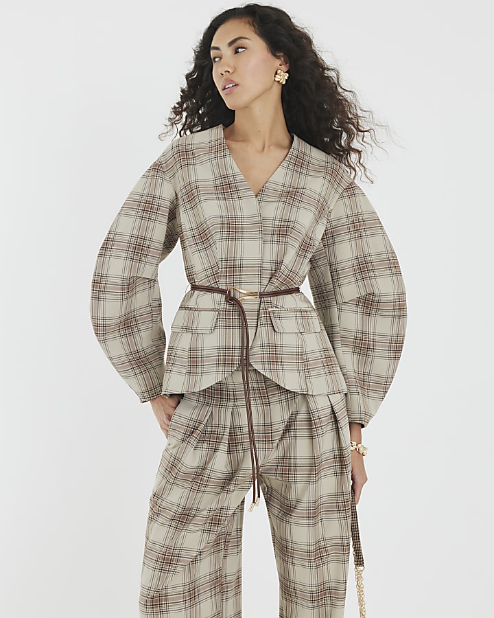 Brown Check Print Cocoon Sleeve Belted Blazer