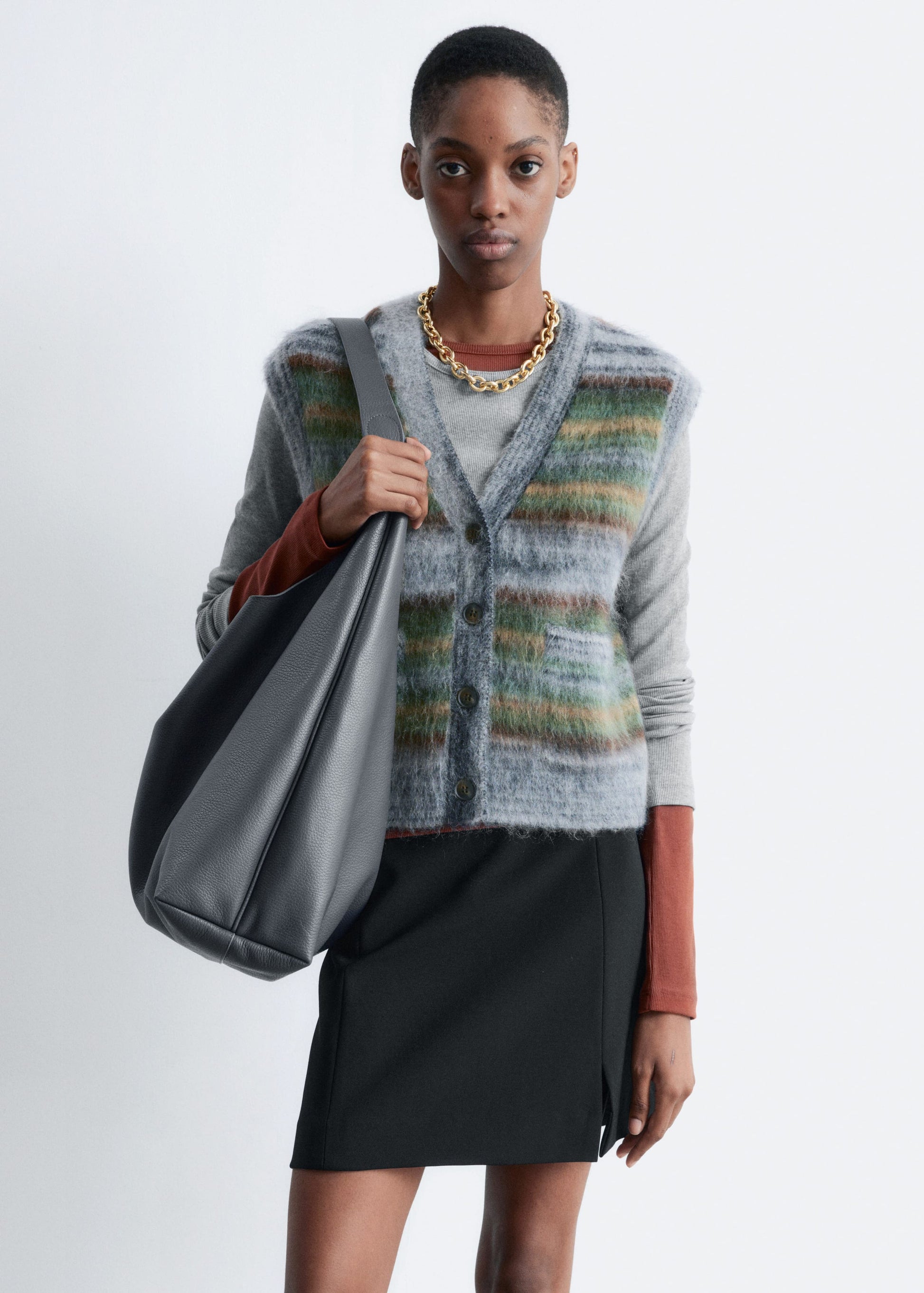 This vest is knitted from a mohair and wool blend with a brushed, tacile finish. It features a V-neckline, ribbed trims, and two front patch pockets. Finished with buttons down the front. Layer it over shirts and T-shirts.