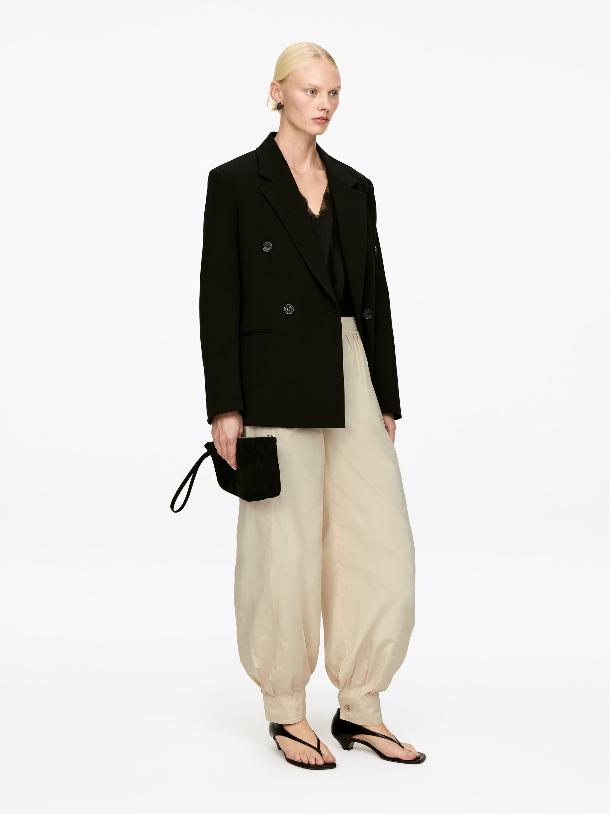 Pleated trousers with a bubble hem. This is an unlined style with a zip fly, hook-and-bar fastening, and buttons at the hem.