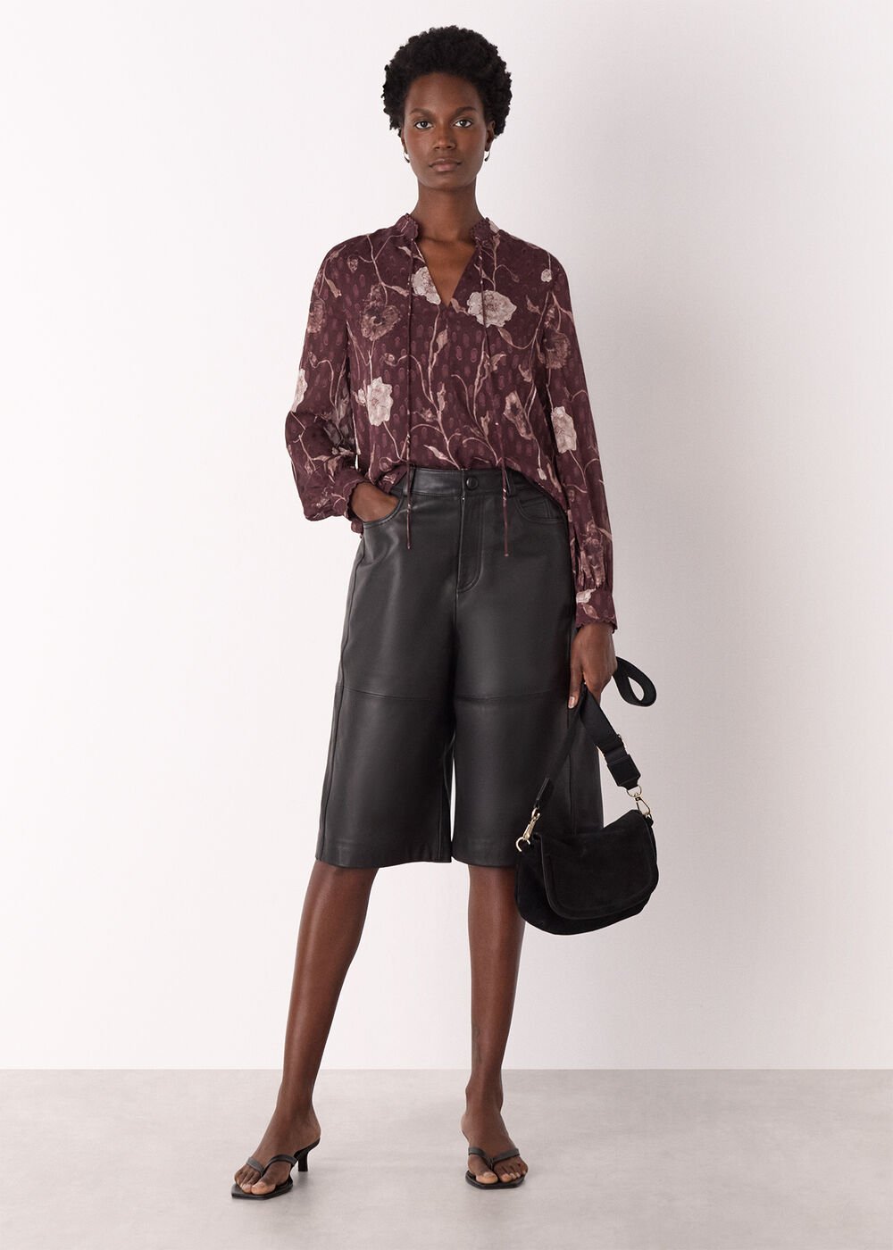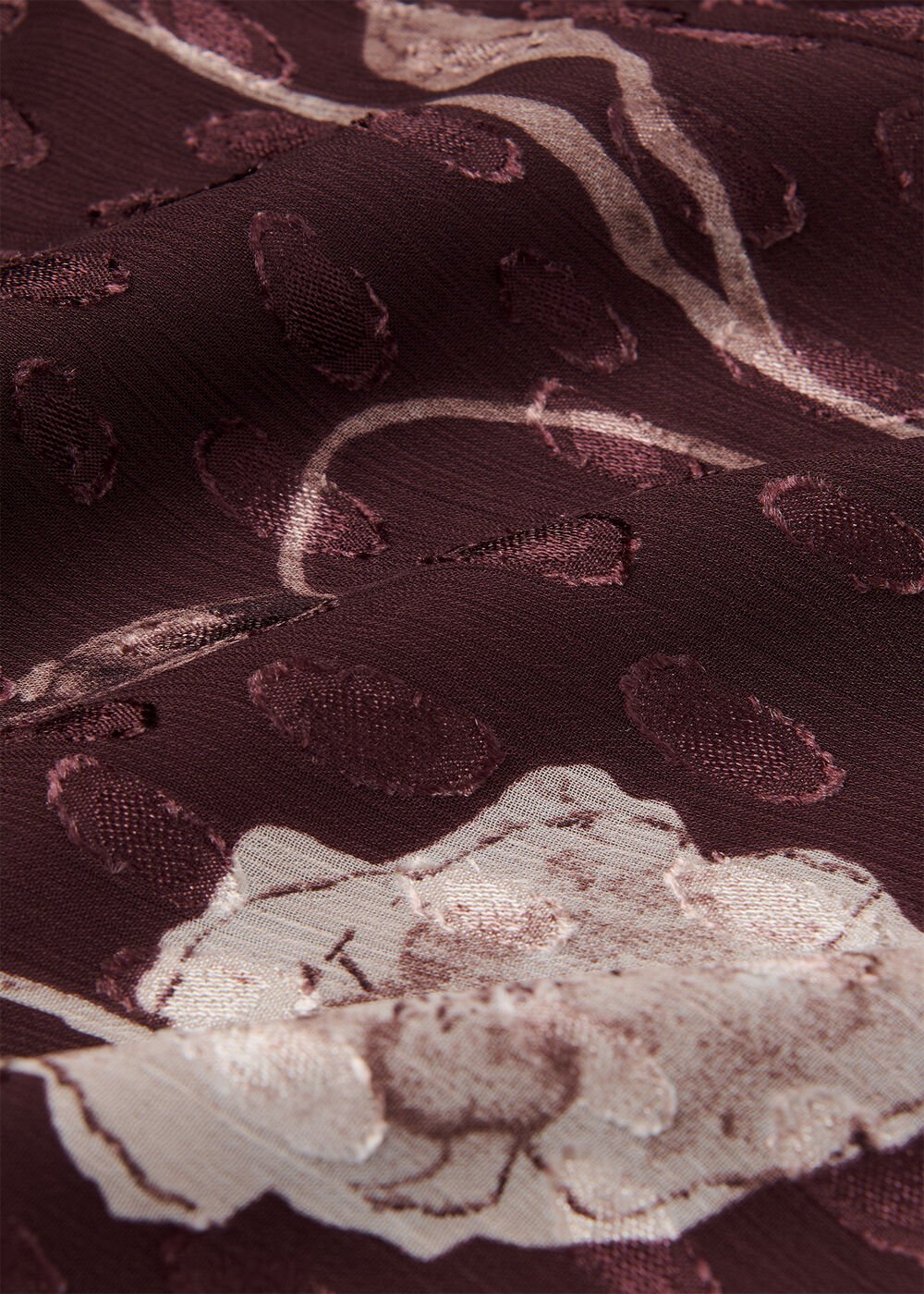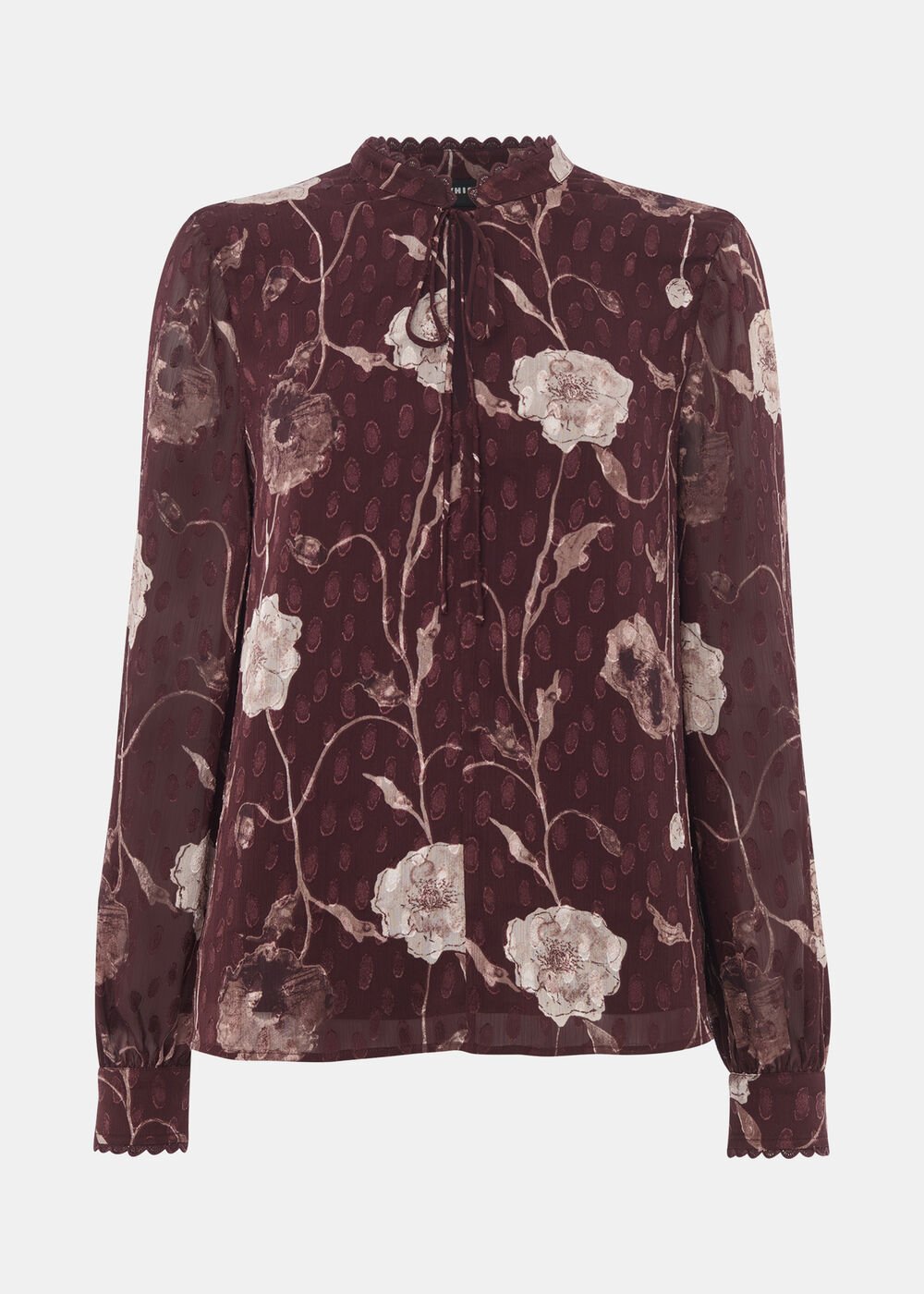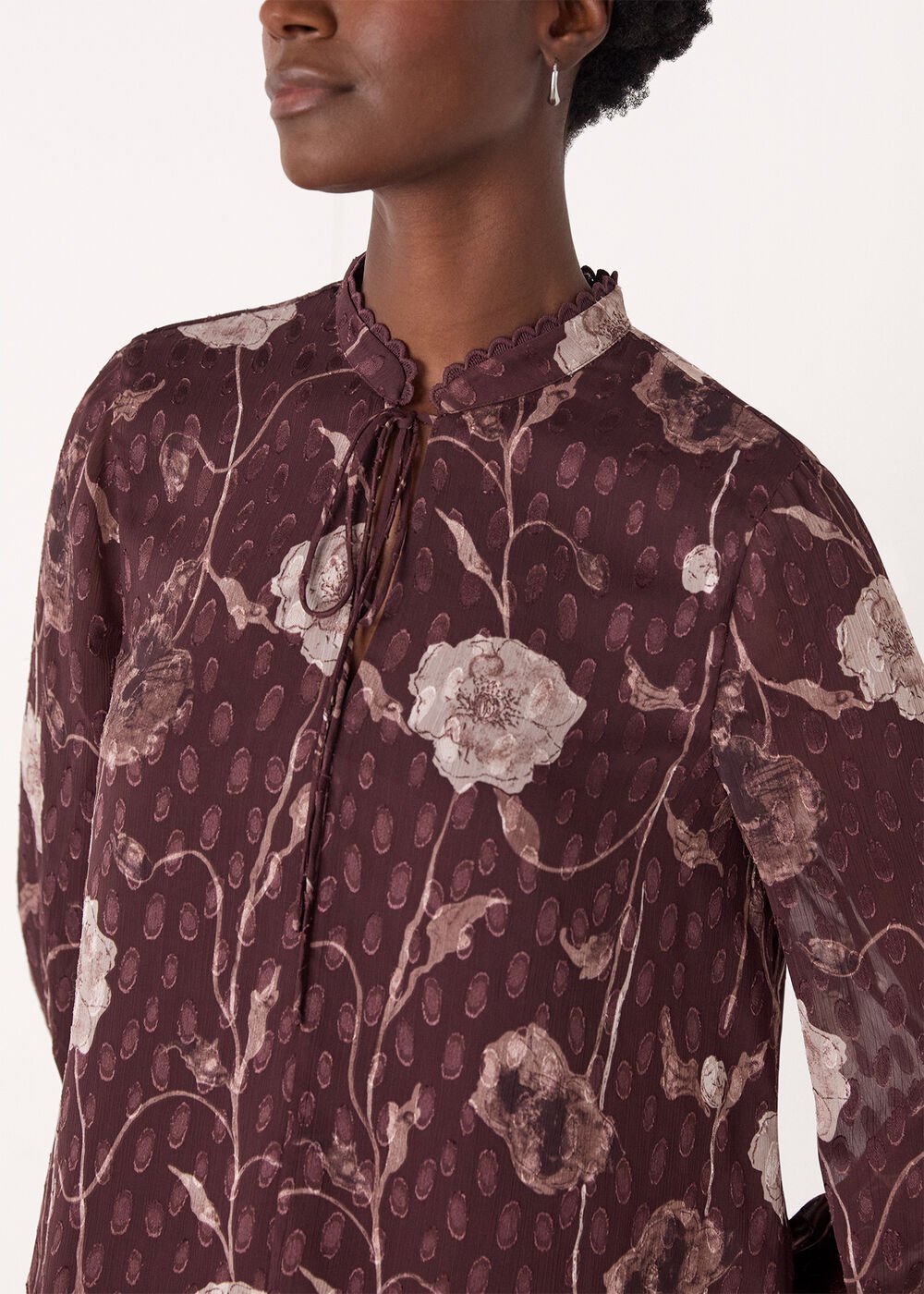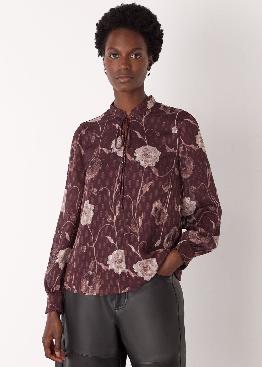 Our Floral Dobby Blouse is designed to bring effortless elegance to your looks, with its deep burgundy hue and delicate floral prints. Its perfect for both special occasions and elevated everyday wear, with its flowy, draping fabric, sheer sleeves and frilled collar. Pair it with tailored trousers for a polished look, or style it with denim for a modern-casual look.