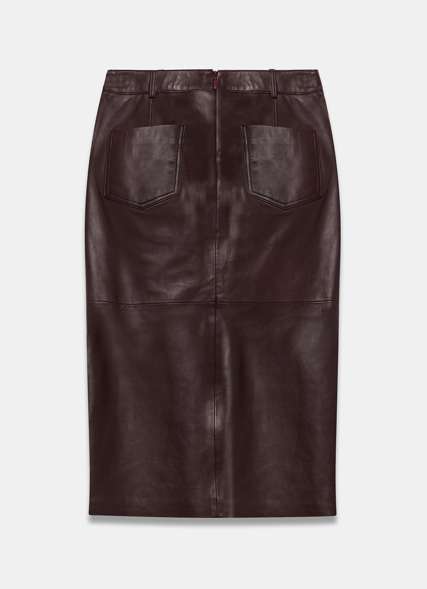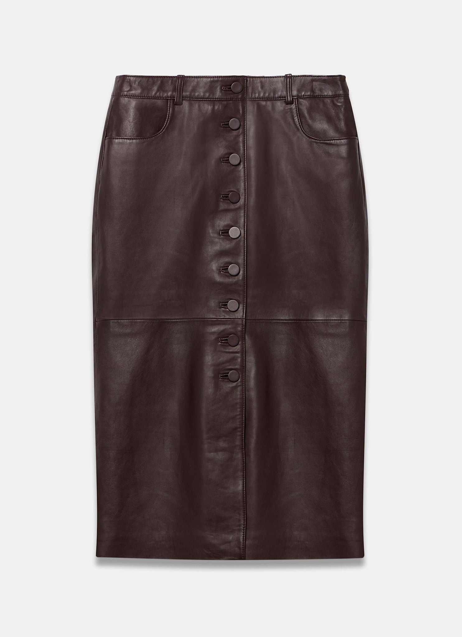 - Burgundy tone A-line skirt in a midi silhouette featuring belt loops, button detailing and a zip fastening through the back.