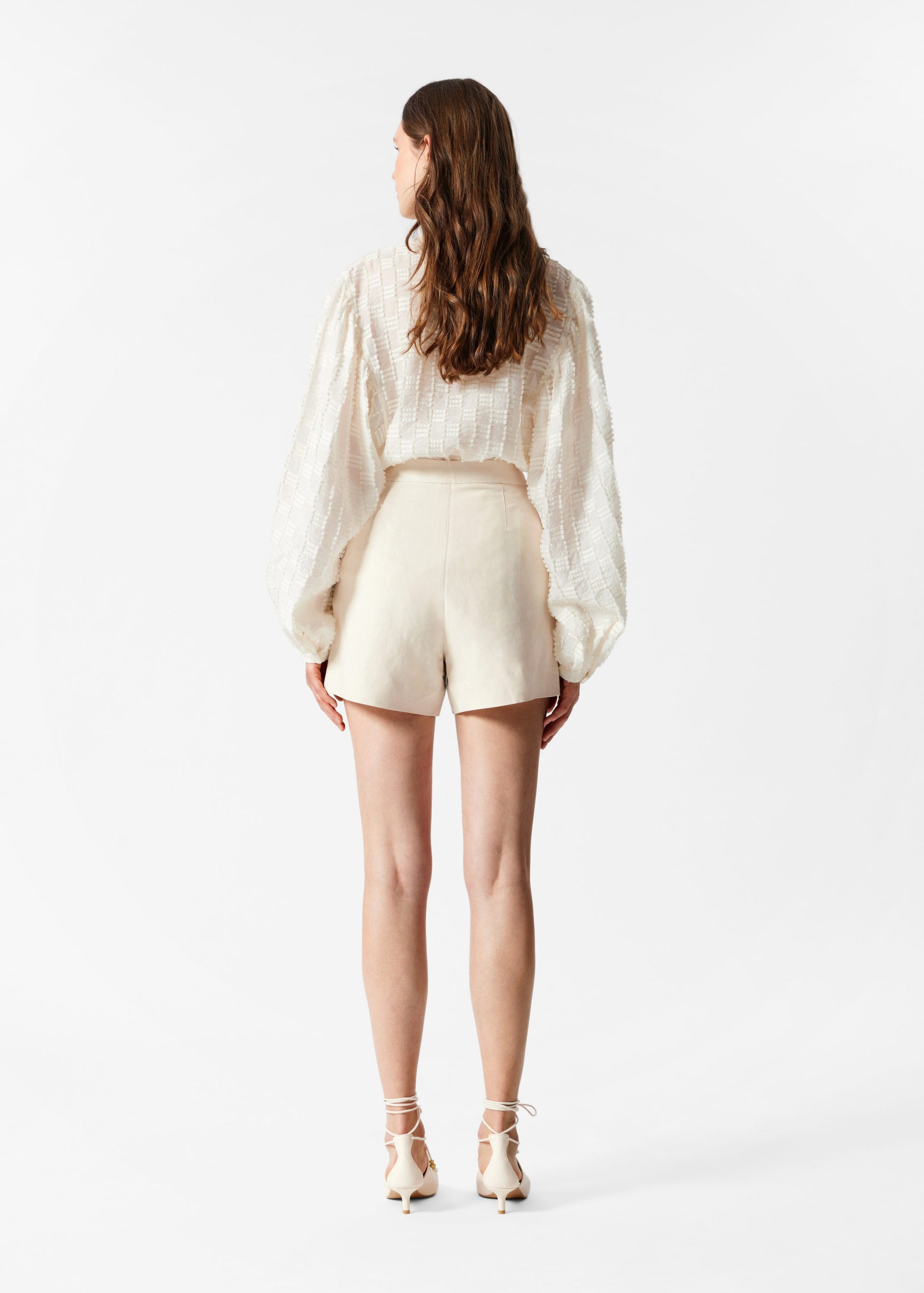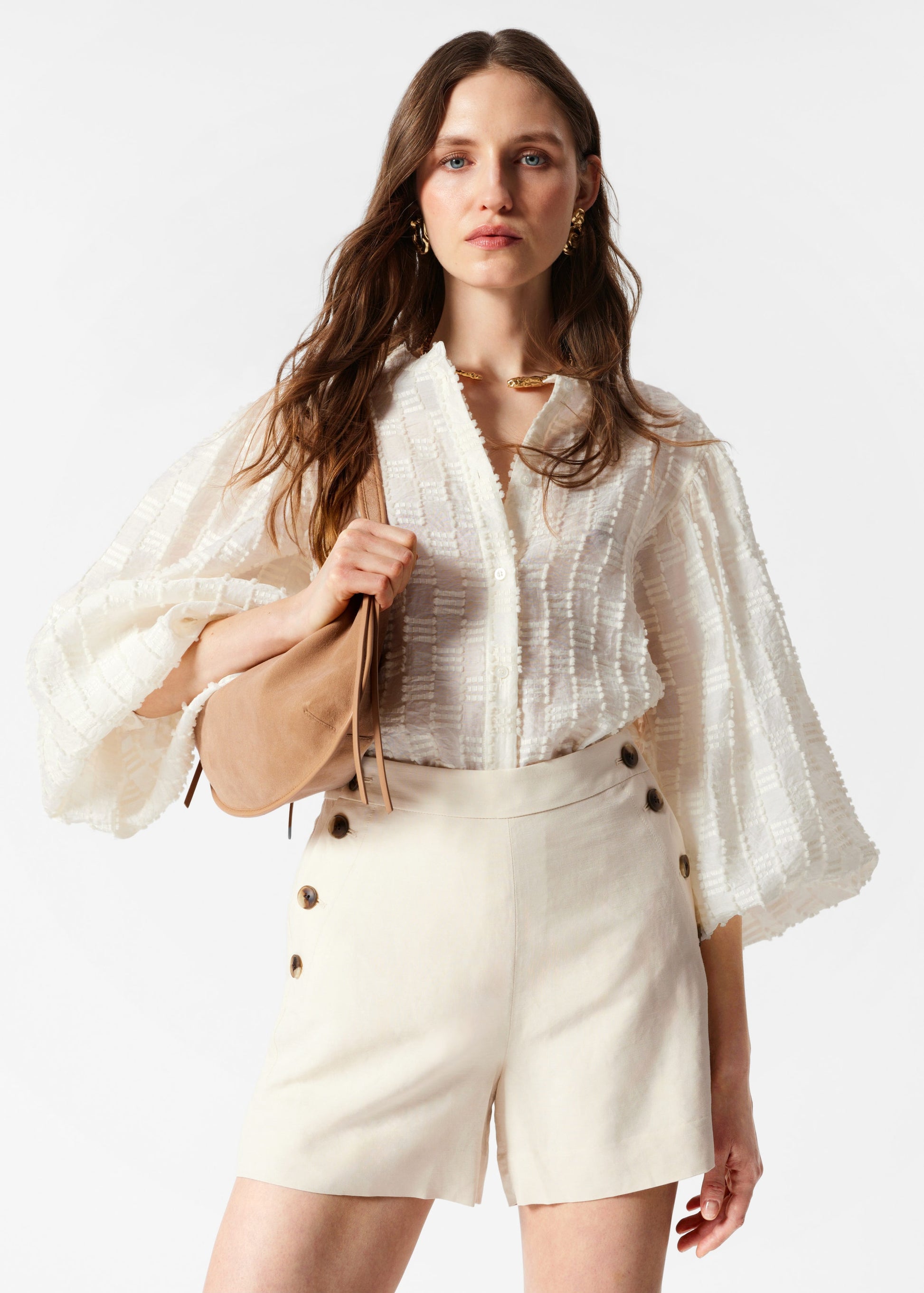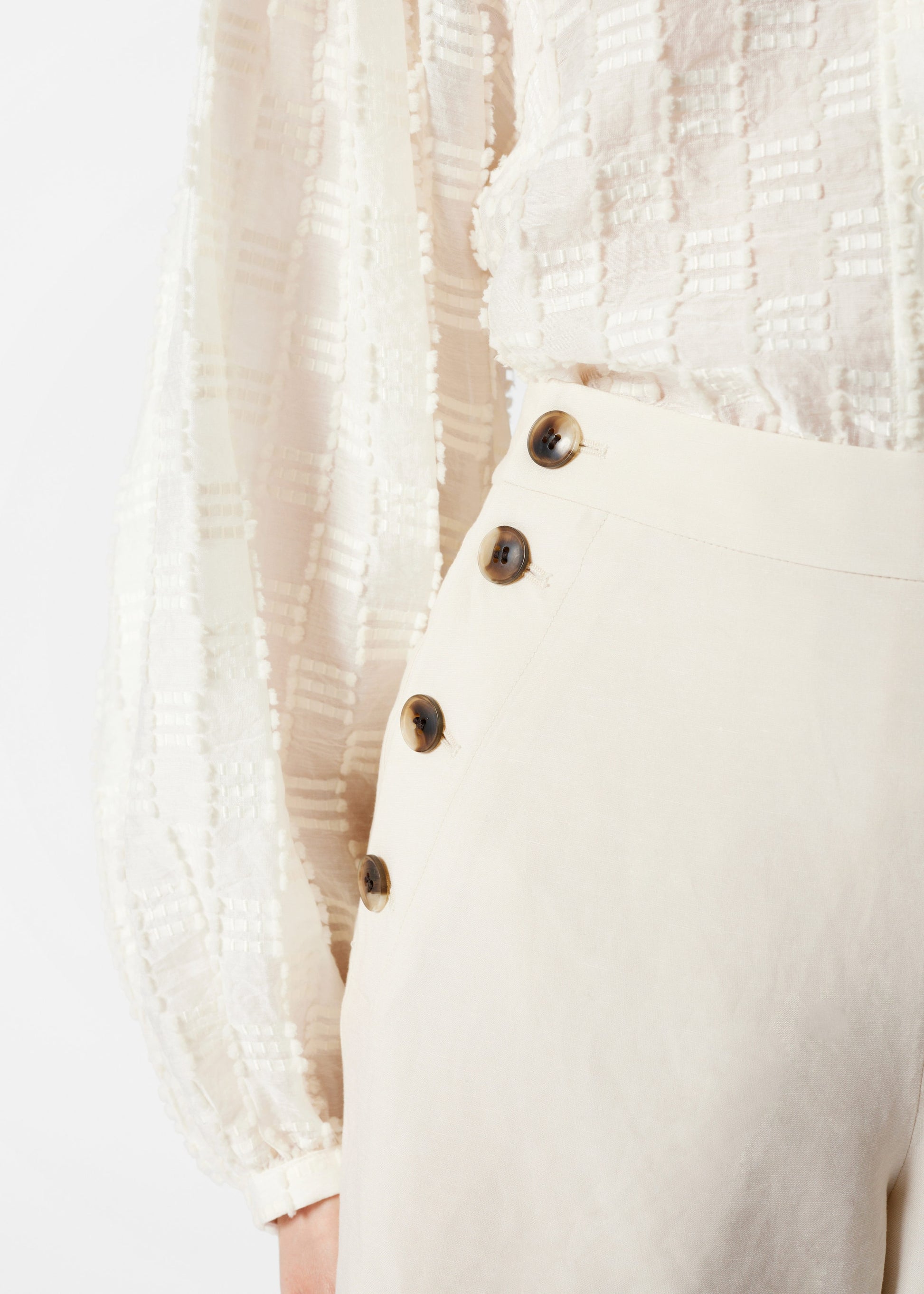 These high-waisted sailor shorts are crafted from a lightweight, breathable linen blend, perfect for warm-weather days. Detailed with button-trimmed side pockets, offering a timeless and preppy feel. Style them with a tonal blouse for an effortless summer ensemble.