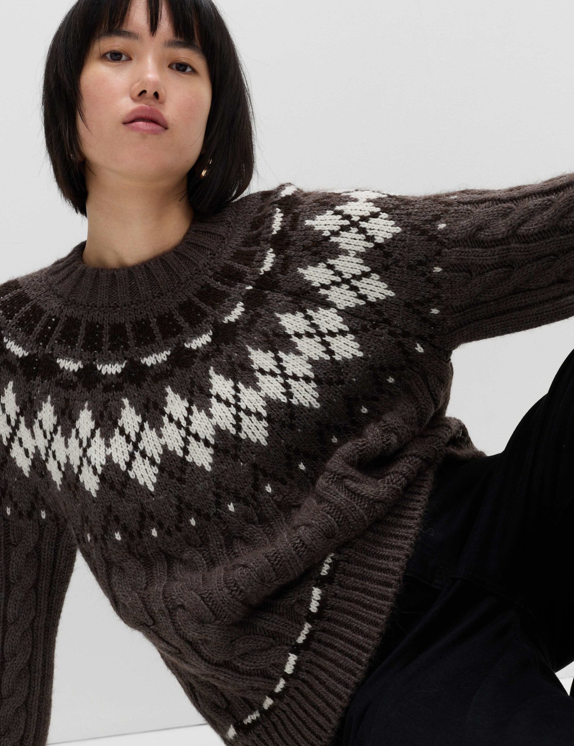 With a vibrant Fair Isle design on the yoke, this cosy jumper has a traditional feel. It's made in a comfy regular fit, with a timeless crew neckline. The cable knit texture creates a chunky look, while ribbed trims add a neat finish.
