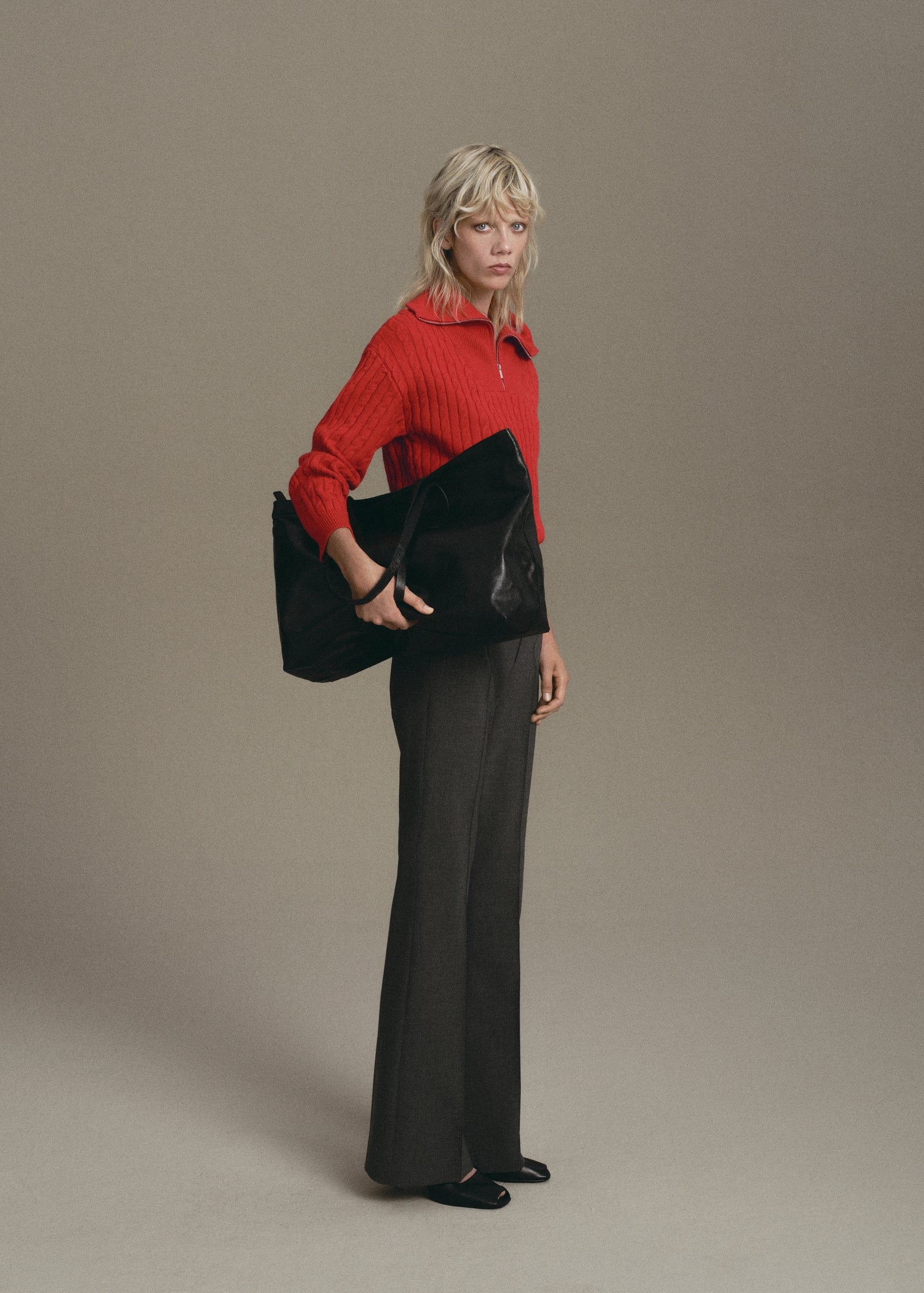 Knitted braided fabric. Straight Design. High neck with zip closure. Long sleeves.
