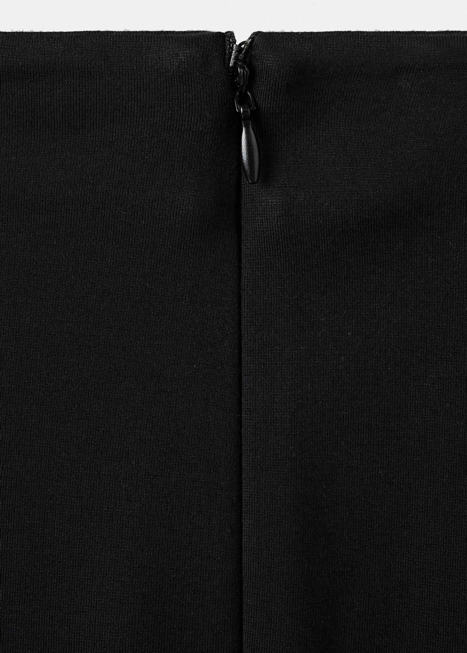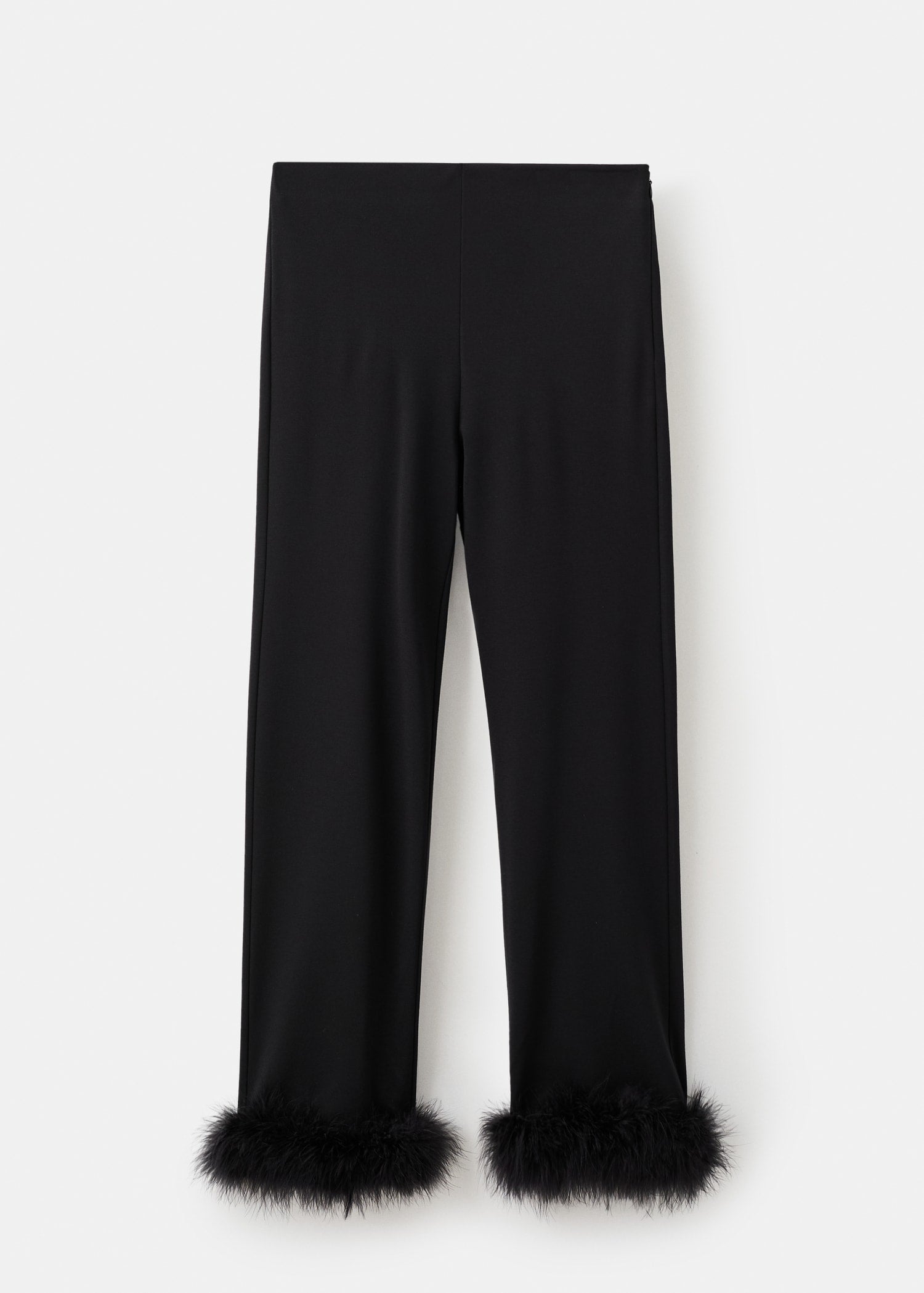 Capri design. Mid-rise. Feather trim at the hem. Side zip closure. Total look.