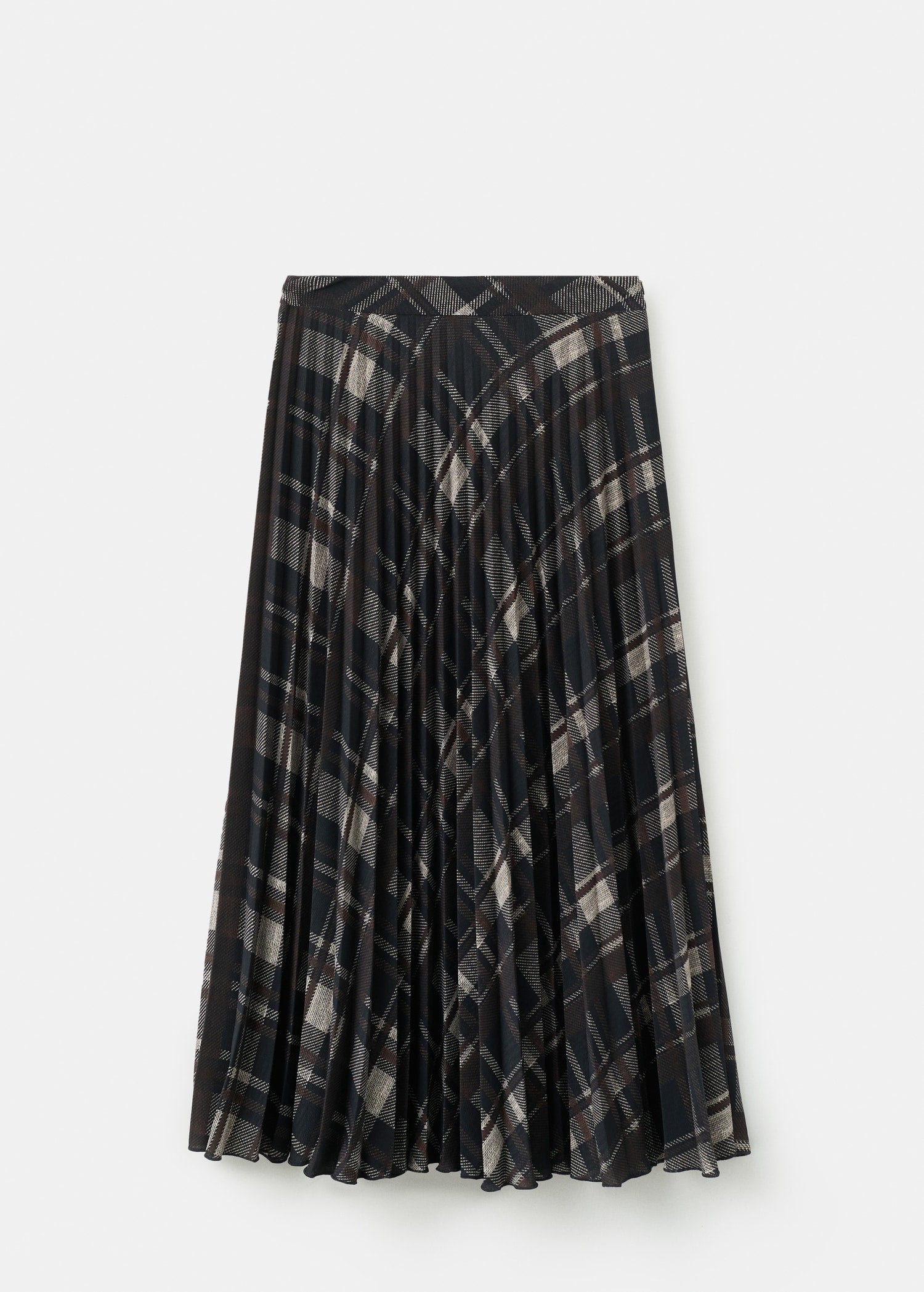 Side Closure Location. Long design. A-line design. Checked print. Tartan print. Mid-rise. Side zip closure.