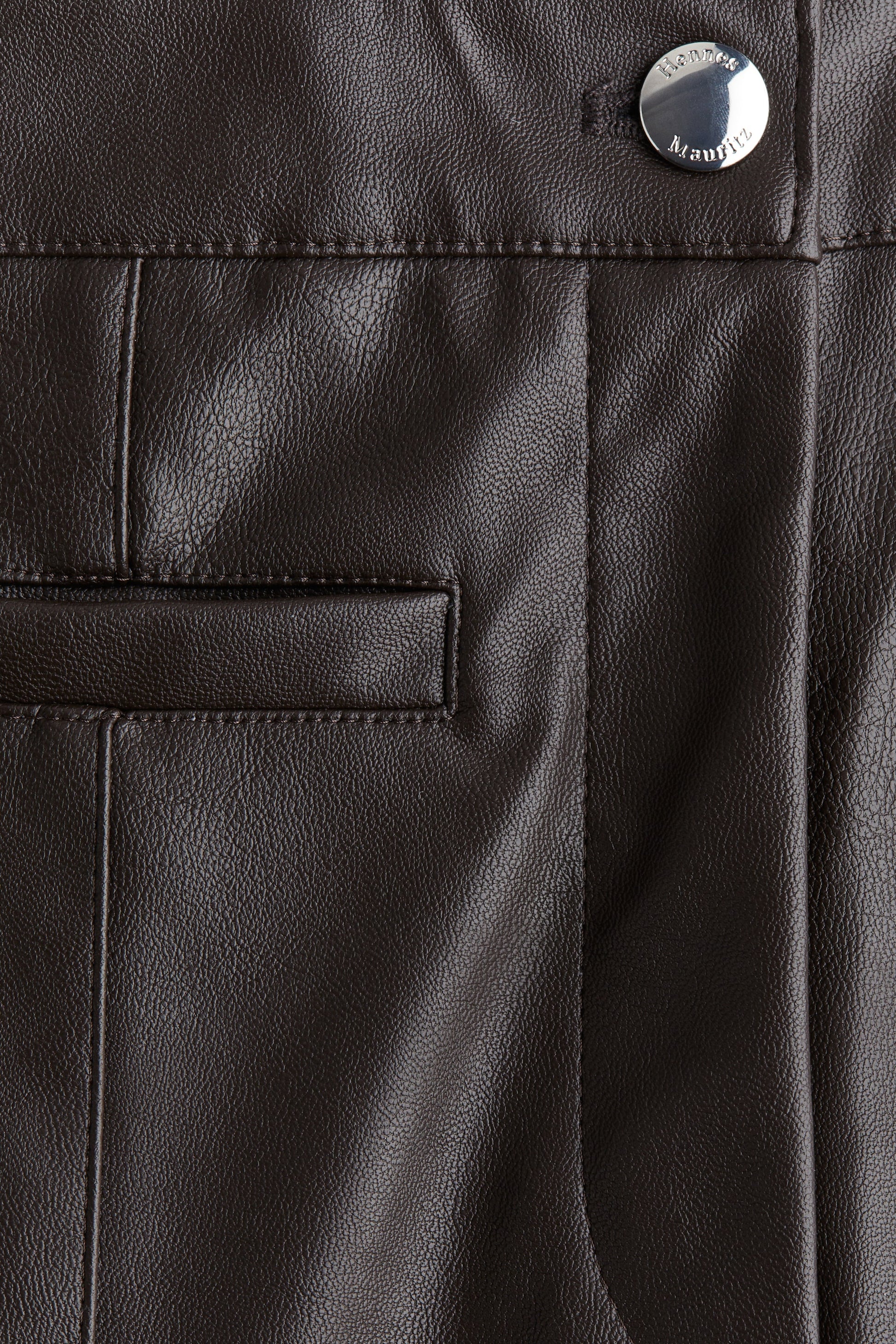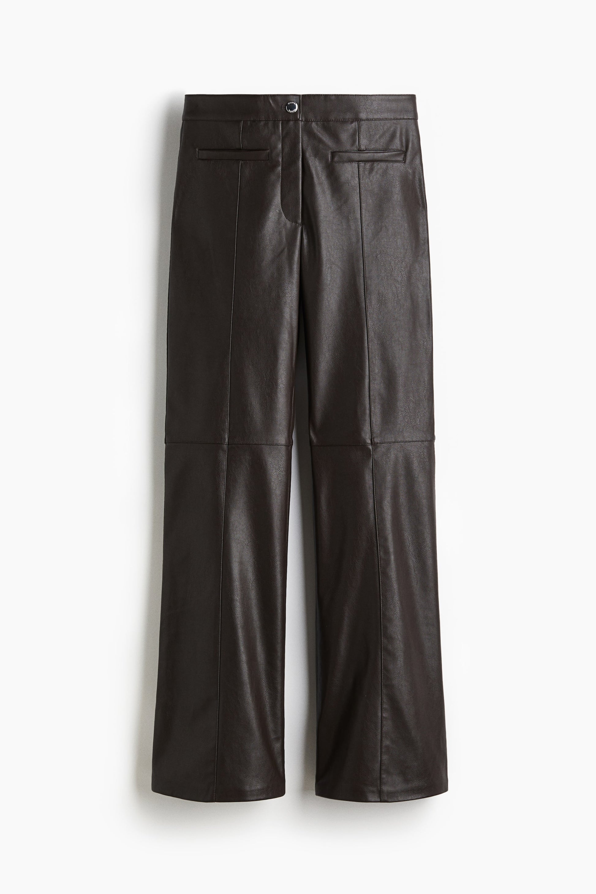 Trousers in coated fabric featuring a regular waist with a zip fly and button. Fake welt pockets at the front and gently flared legs with sewn-in creases down the front and back.