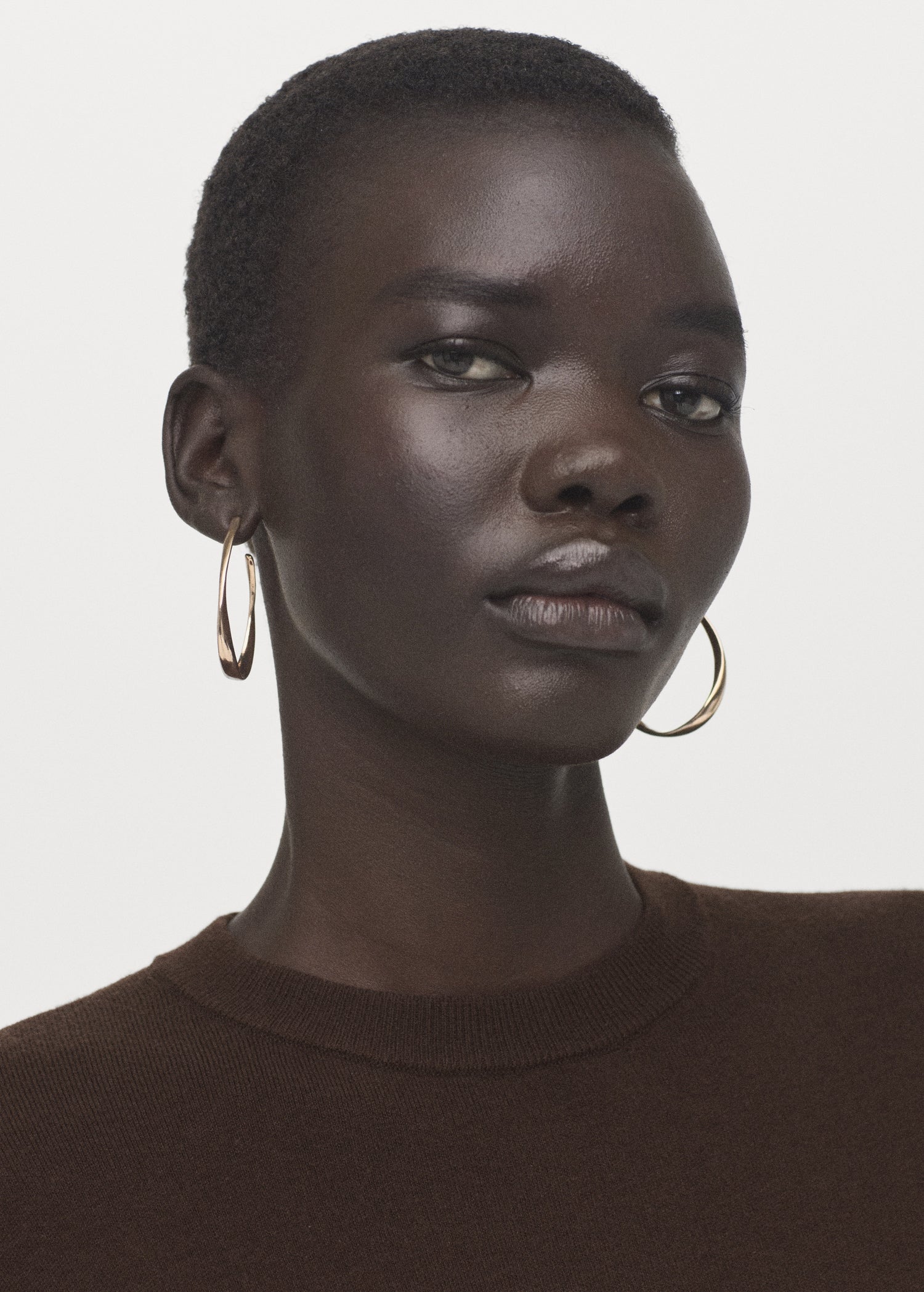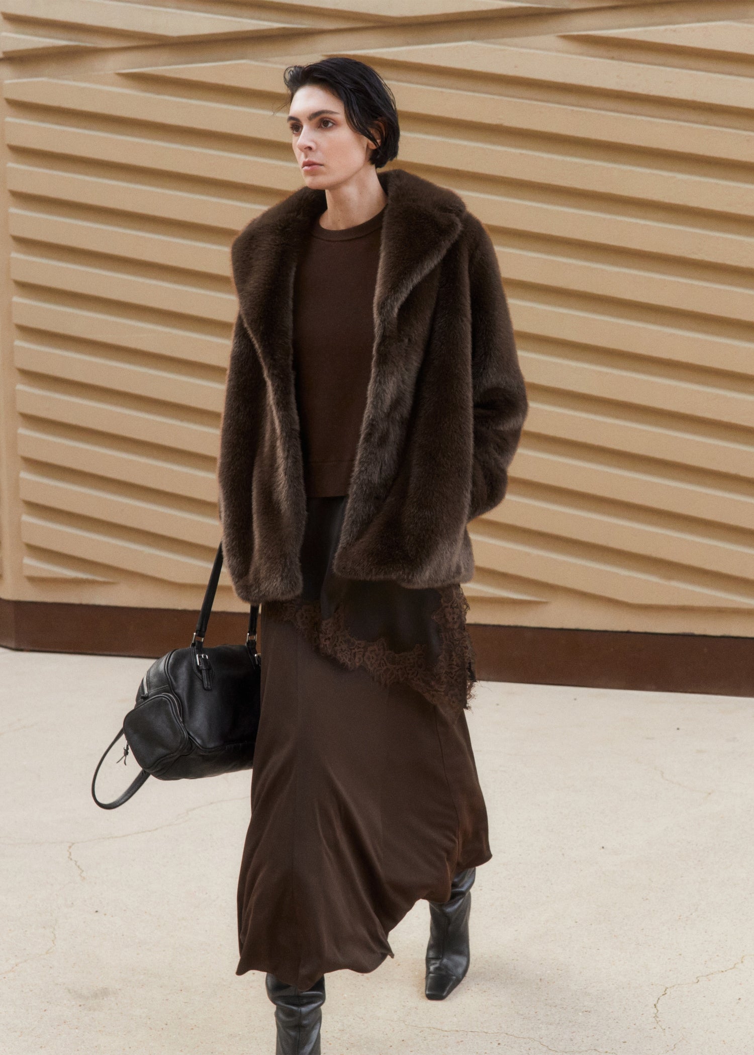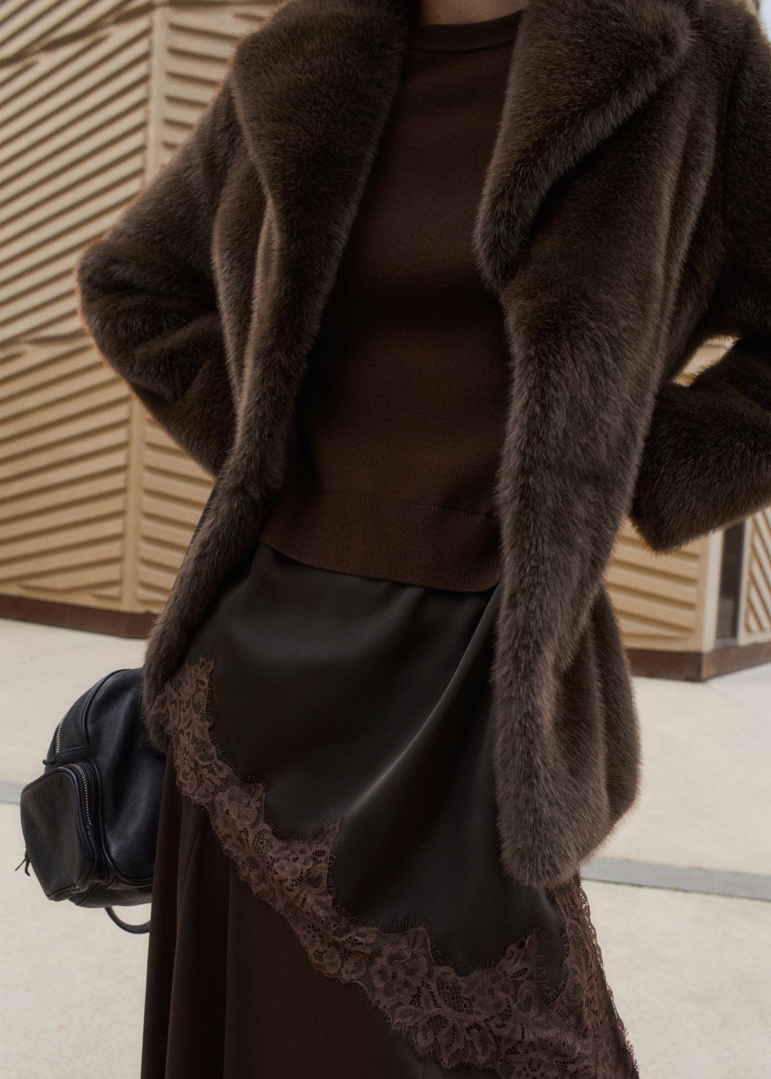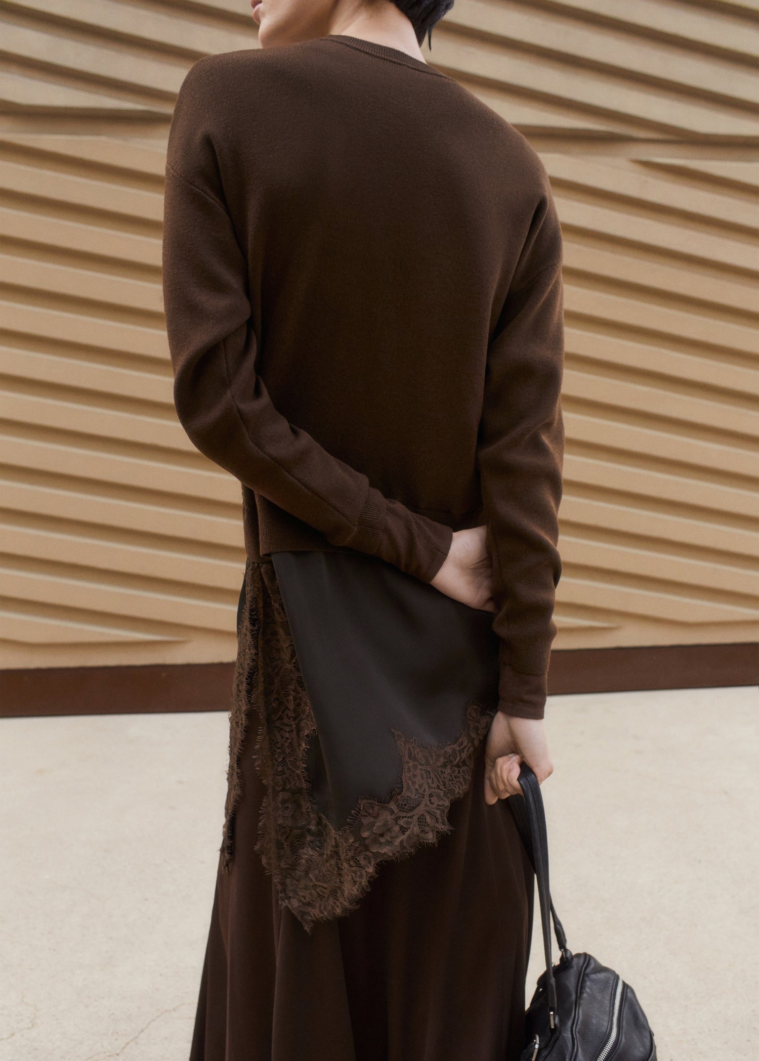 Fine-knit fabric. Straight design. Round neck. Long sleeve. asymmetric lace hem. Side slits.