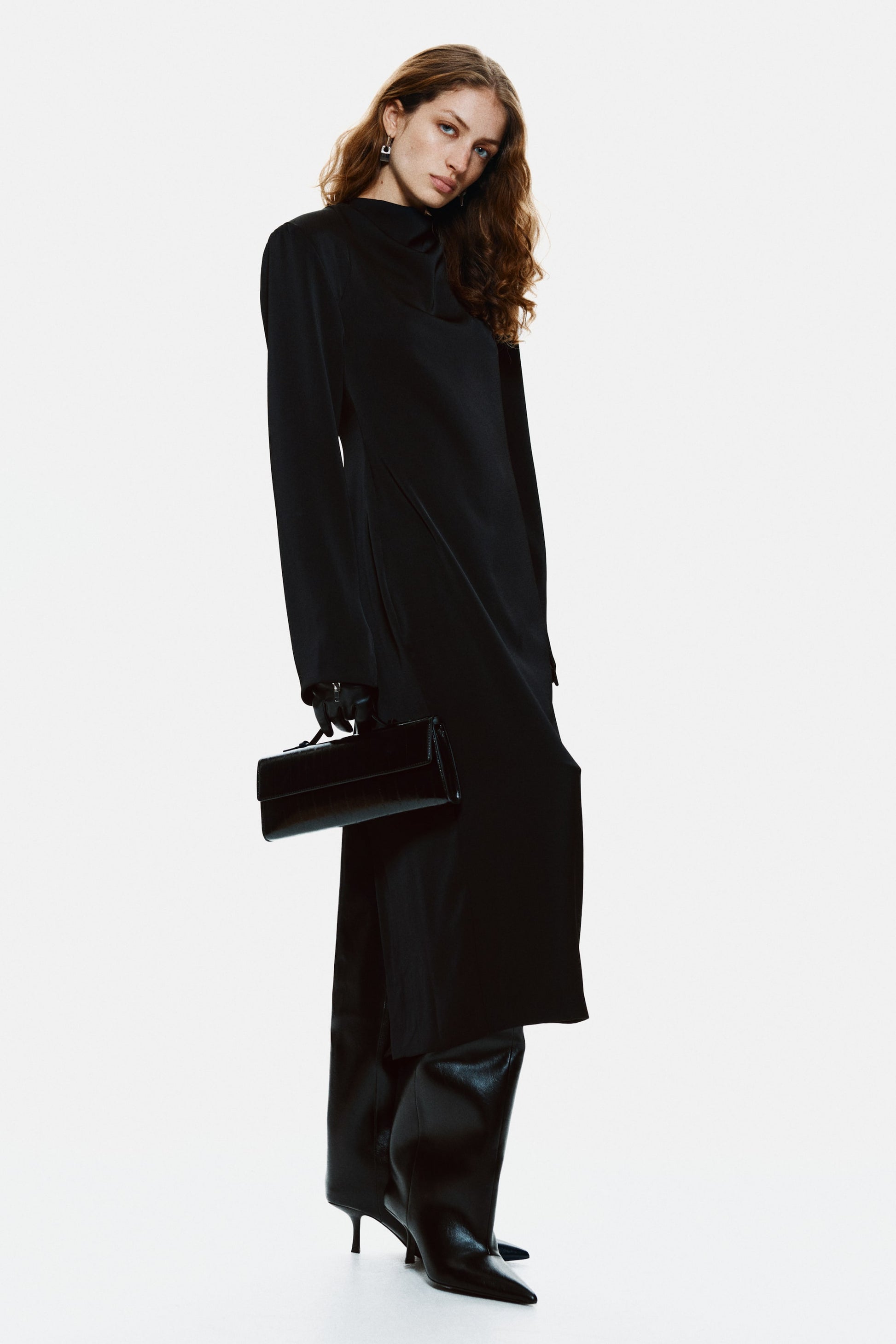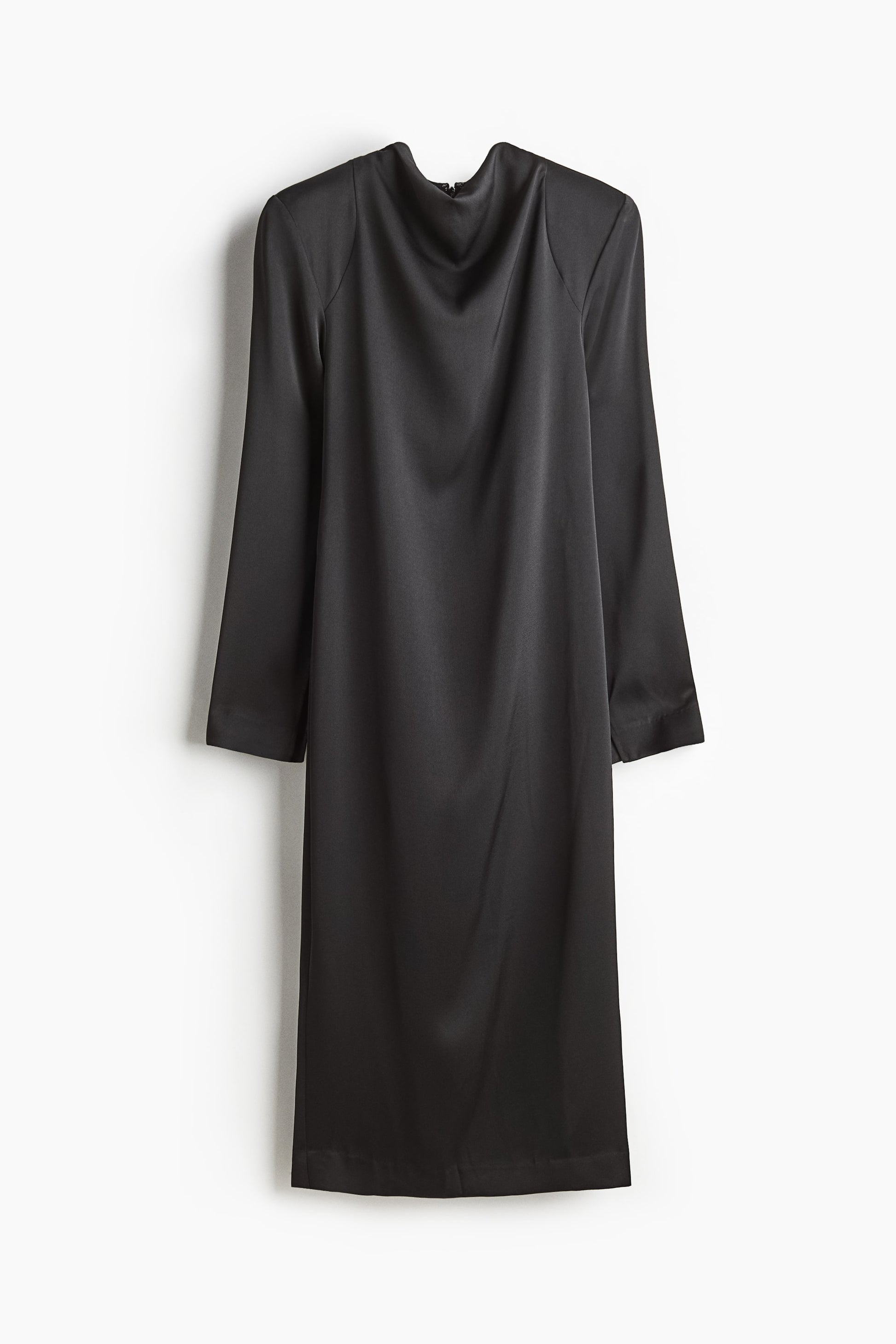Calf-length dress in softly draping satin with a cowl neckline and a concealed zip and hook-and-eye fastener at the back. Shoulder pads and long sleeves with a slit at the cuffs. Straight-cut hem with a slit at the back. Unlined.