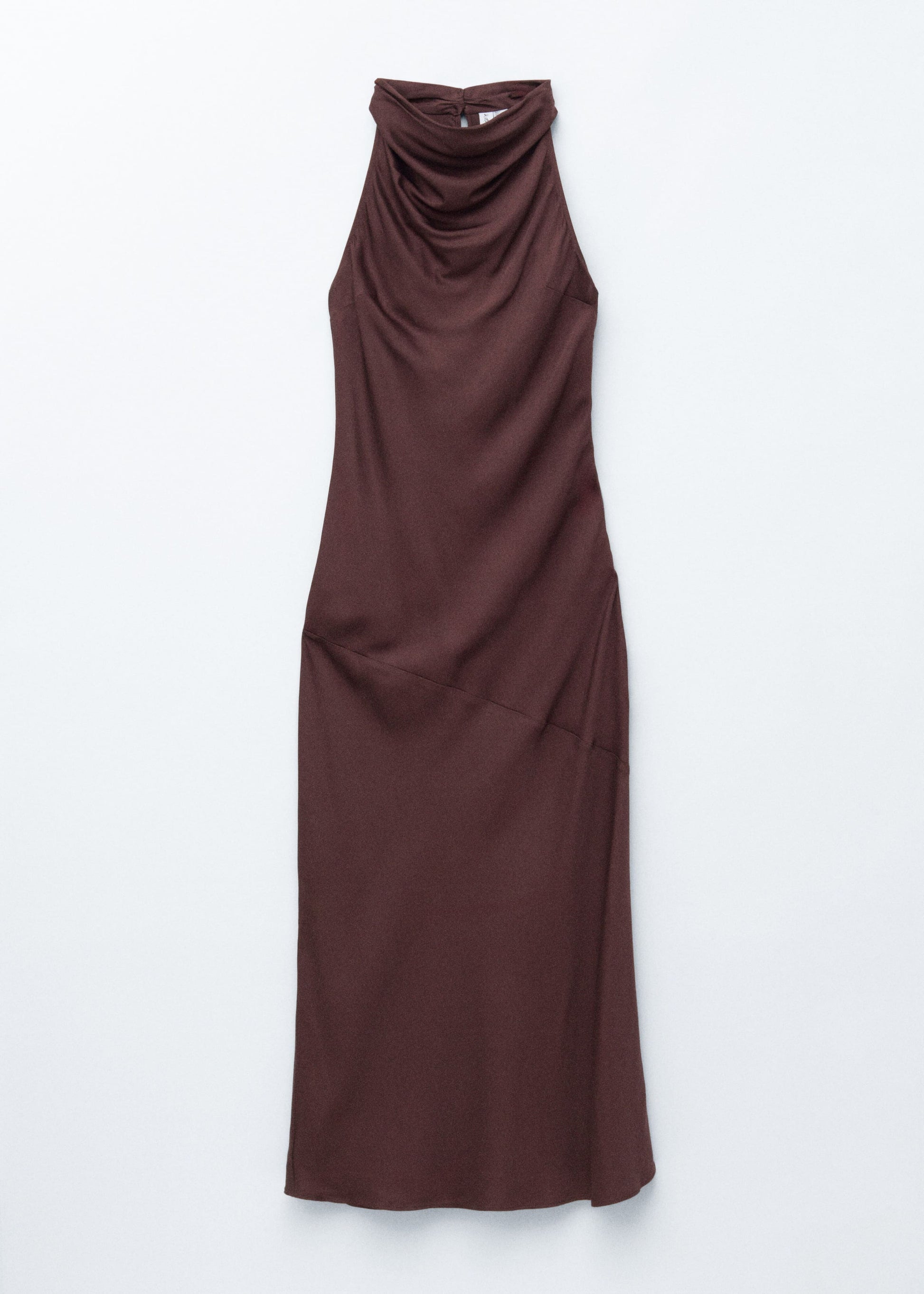 Made from soft satin, this midi dress features a high neck with a draped shawl collar and a fitted waist that flows into a gently flared skirt. Finished with a keyhole button closure at the neck and a concealed side zipper.