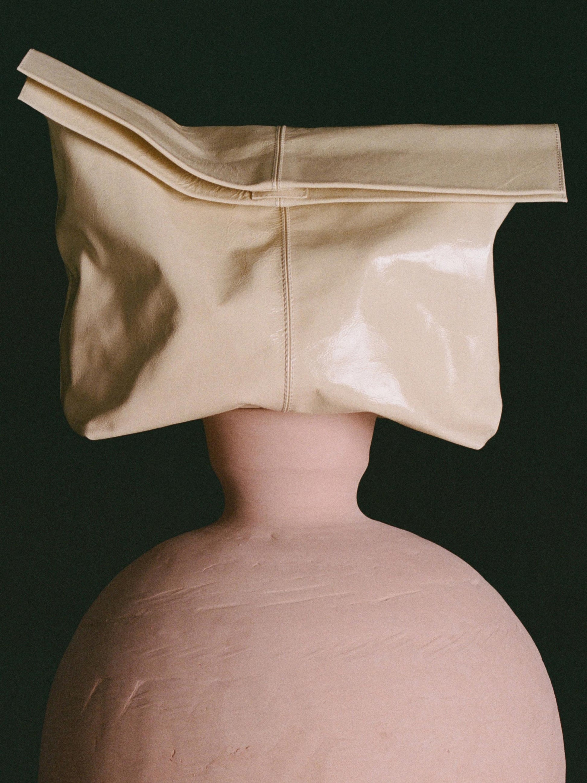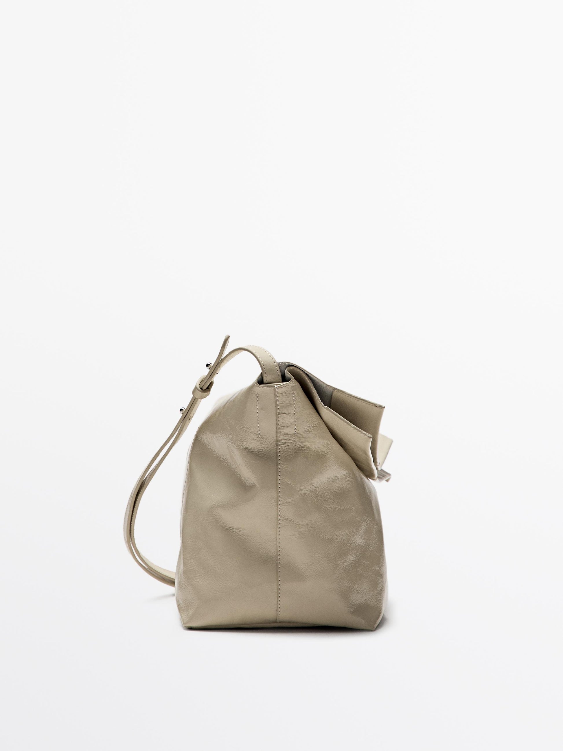 Handbag made of cowhide leather . Magnetic snap-button fastening. Two hand and one adjustable shoulder handle. Adjustable strap. An inside pocket. Crackled leather detail.