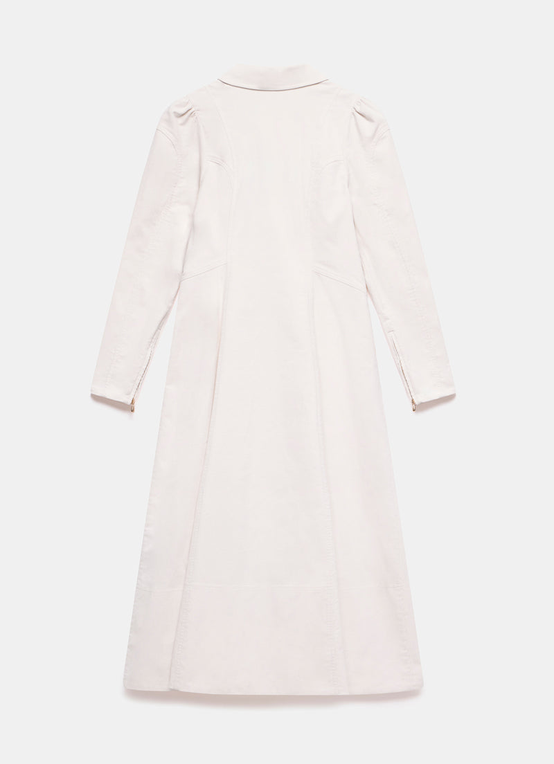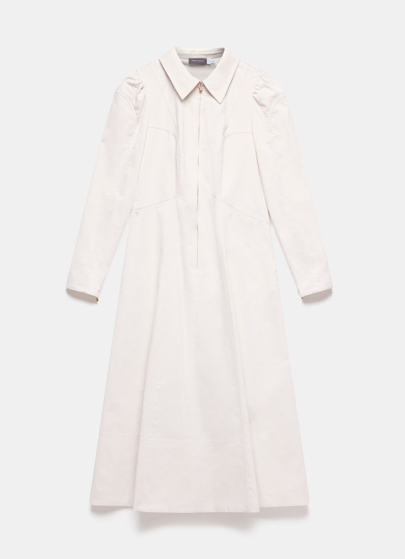 - Cream tone corduroy dress in a midi silhouette featuring a classic collar, waistline paneling, puff shoulders, long sleeves, zipped cuffs with a zip fastening through the front.