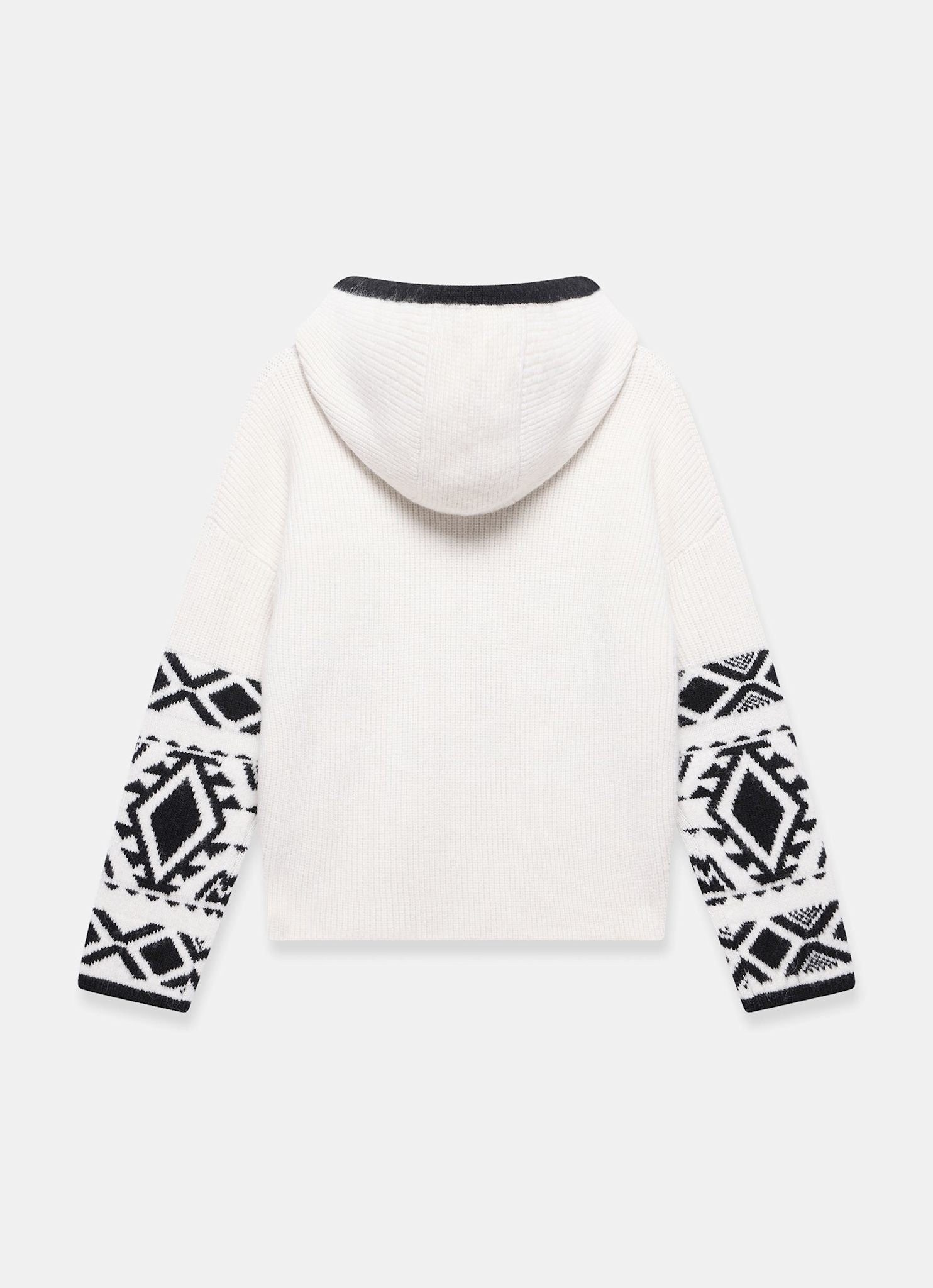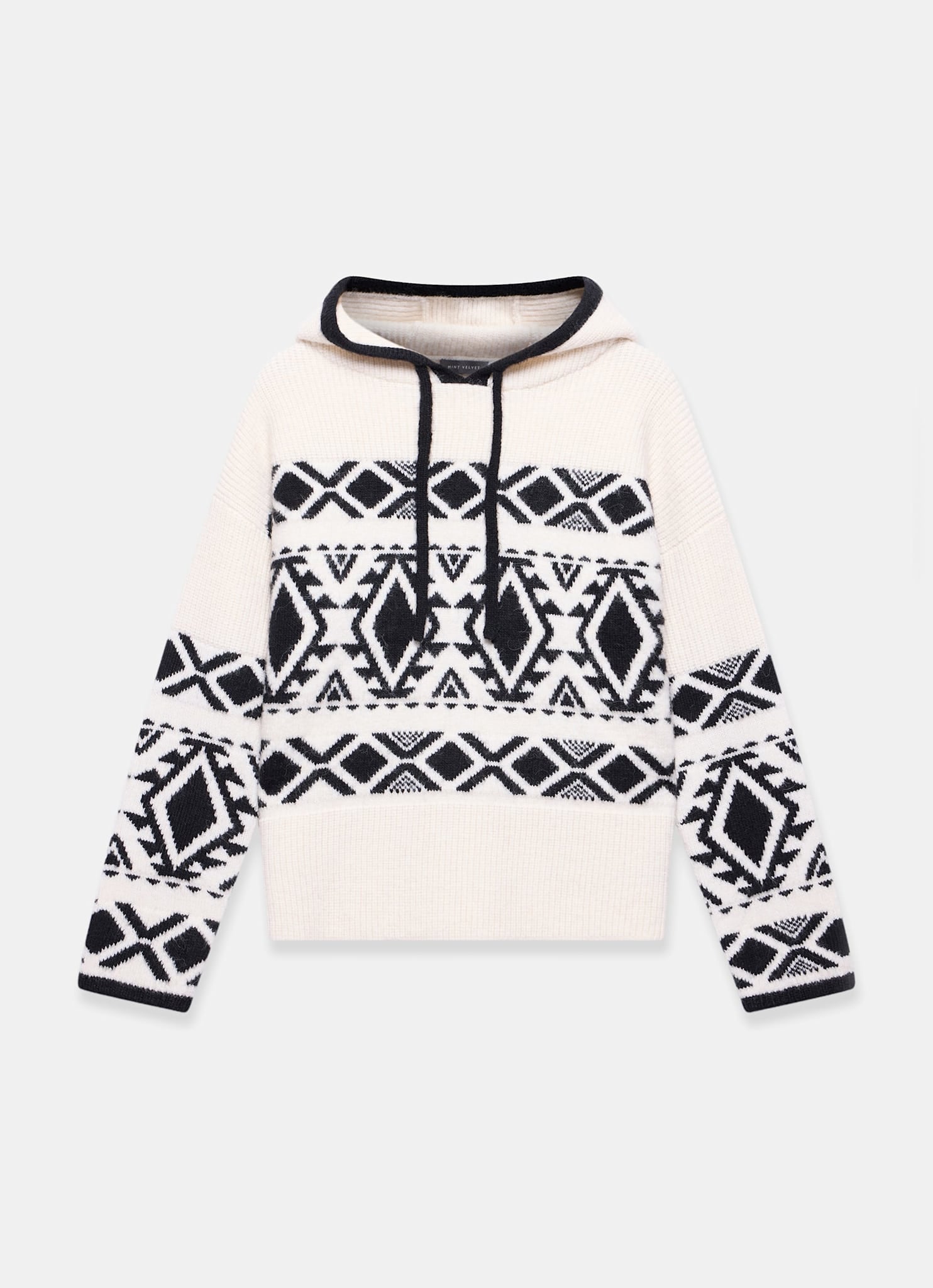 - Cream fair isle knit jumper featuring a hood, long sleeves, contrast trim and a drawstring fastening through the front.