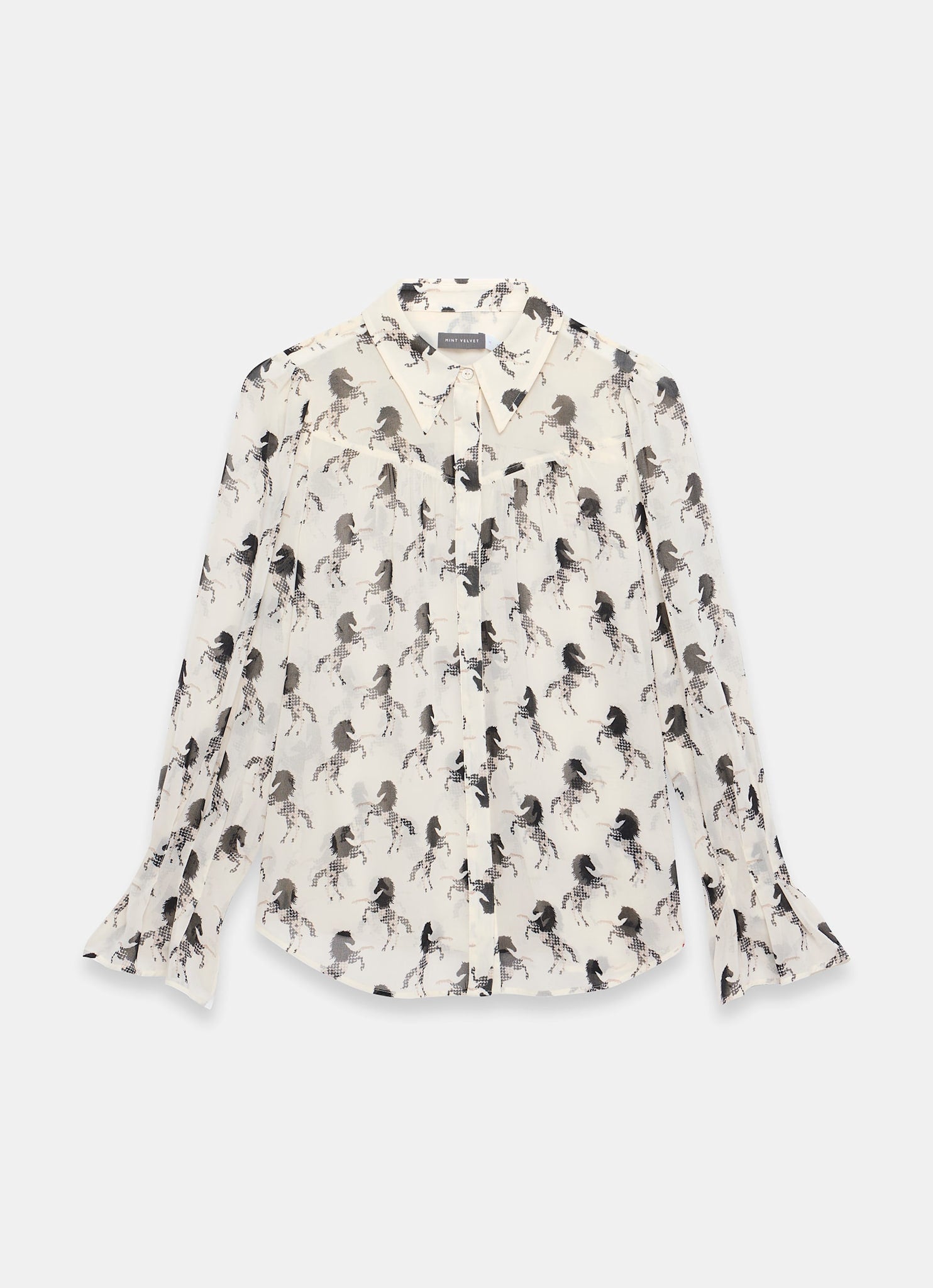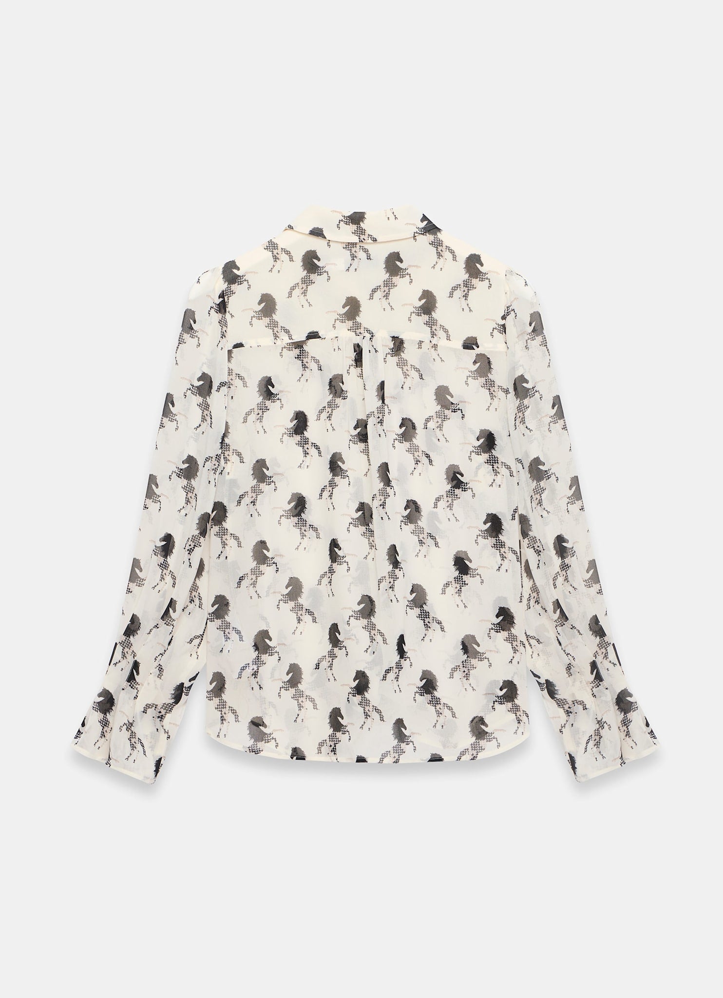 - Cream horse print sheer blouse featuring a classic collar, long sleeves, fluted cuffs, gathered yolk detail, scoop hemline with a concealed button fastening through the front.