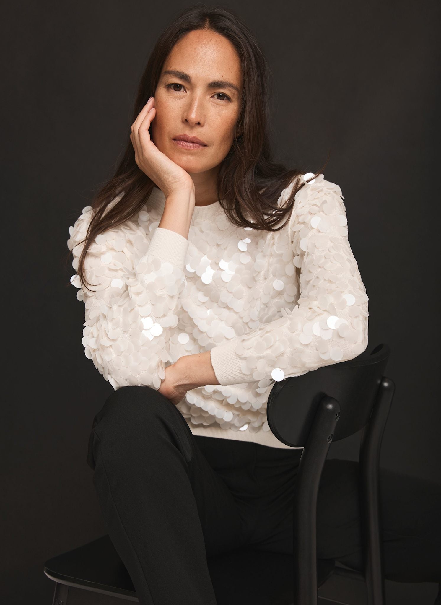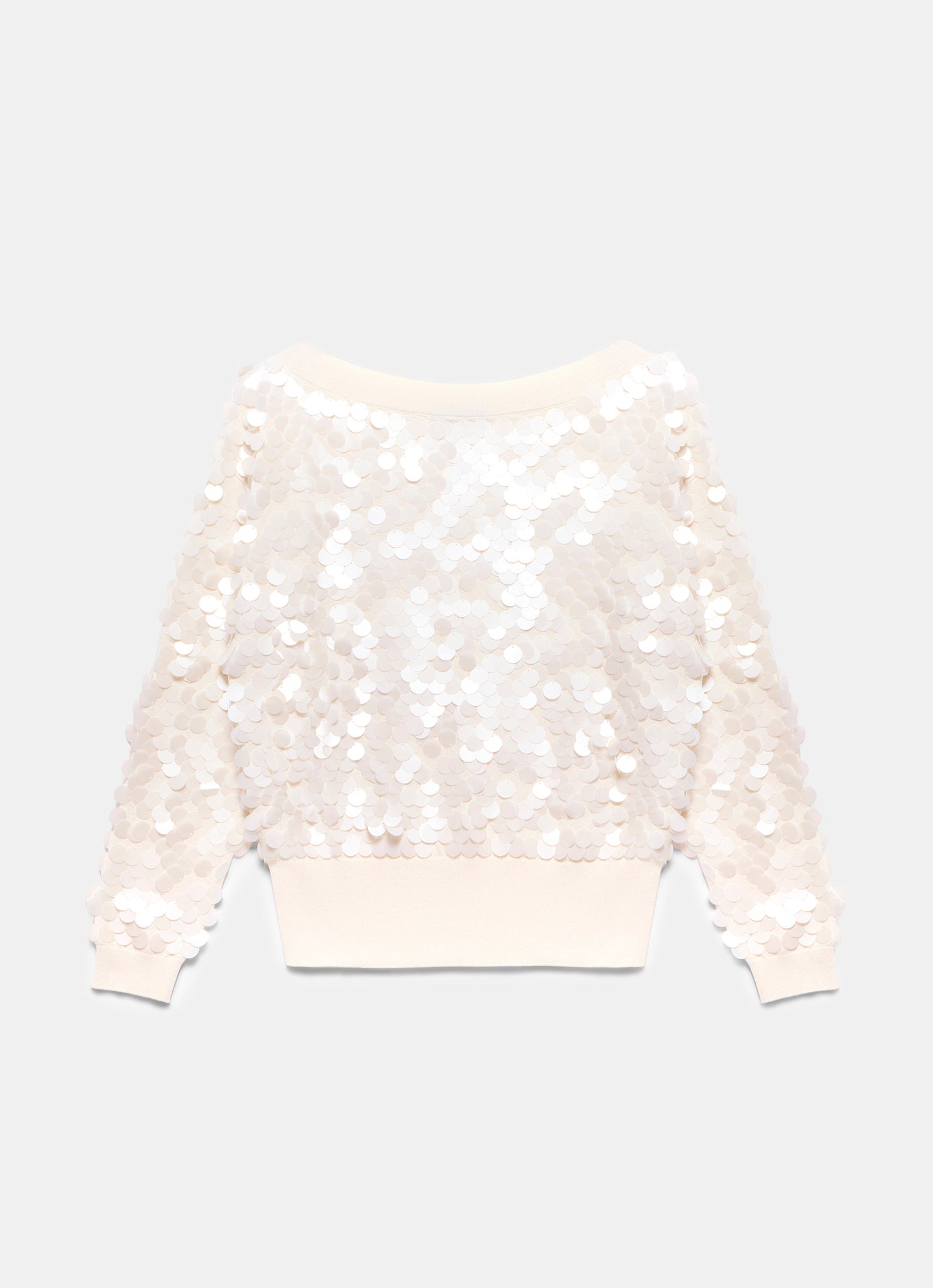 - Cream sequin jumper featuring a wide neckline and long batwing sleeves.