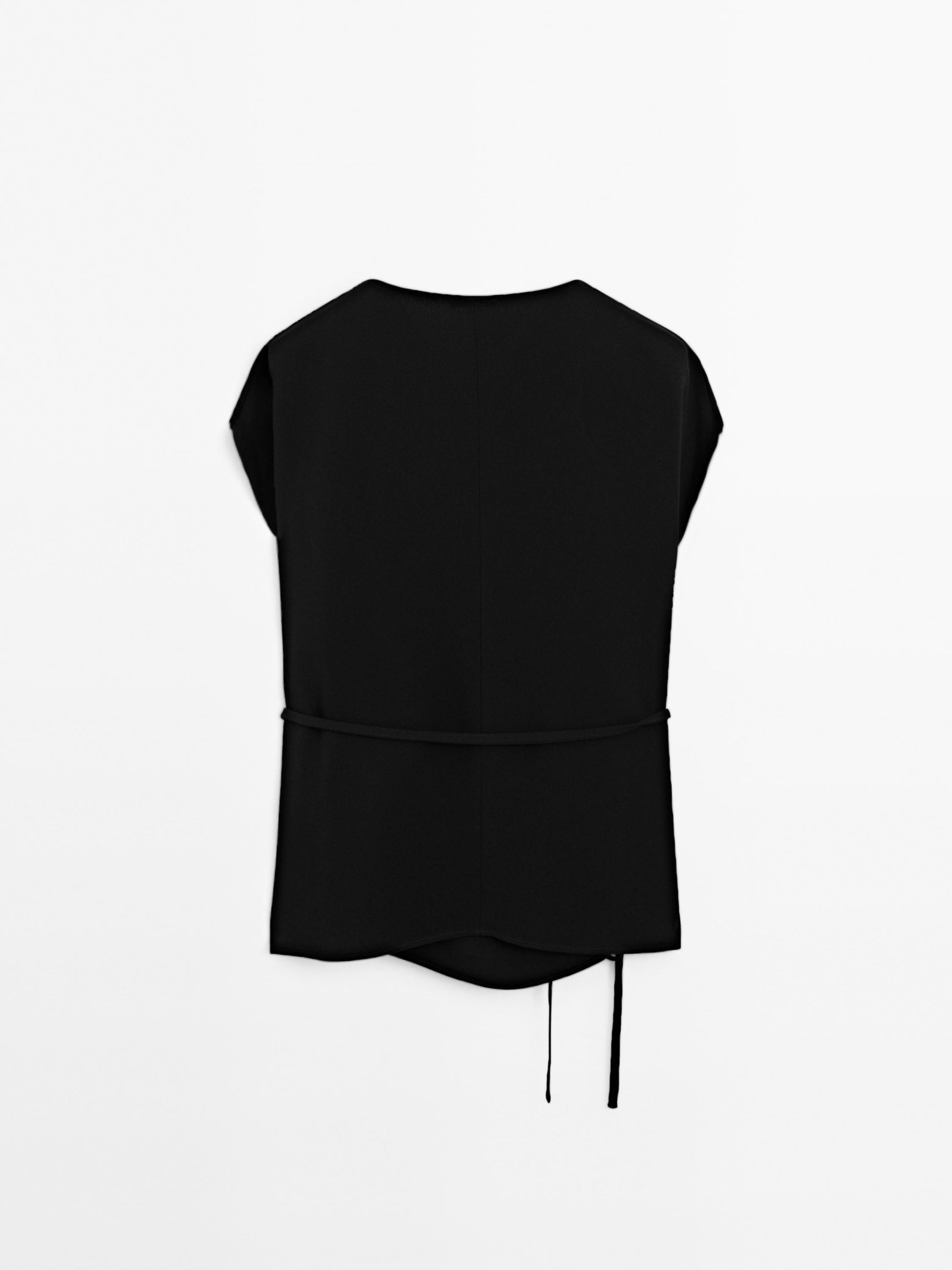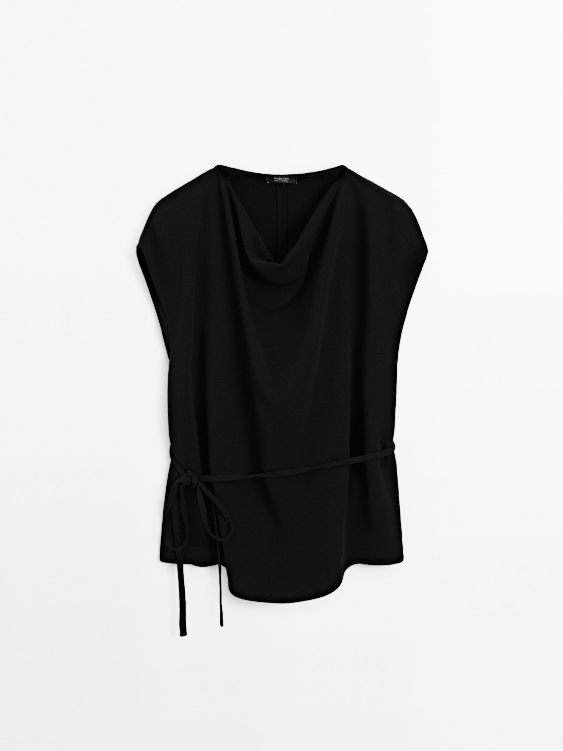 Top with draped neckline made of flowing fabric. Drop-shoulder detail. Crepe fabric. Includes belt.
