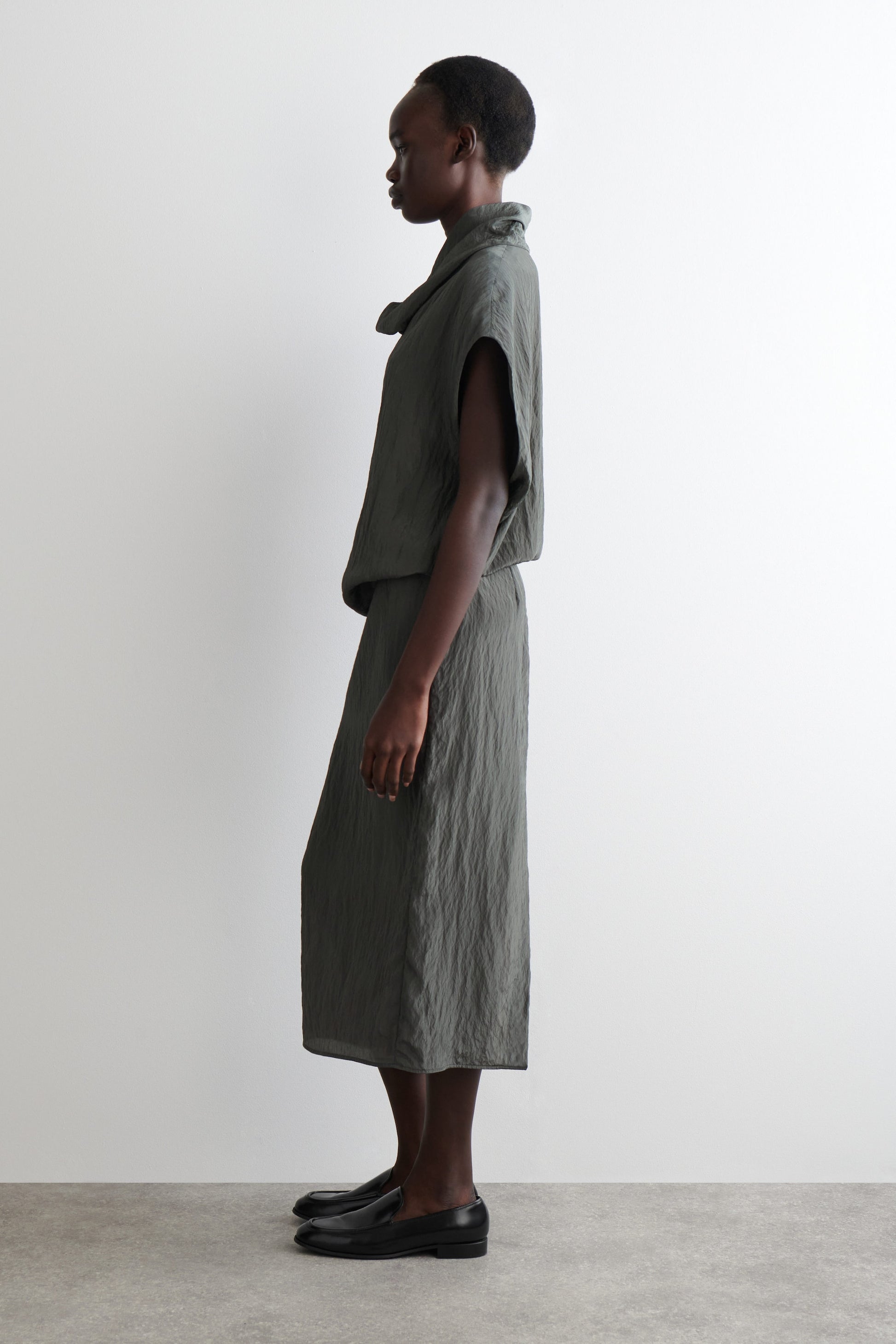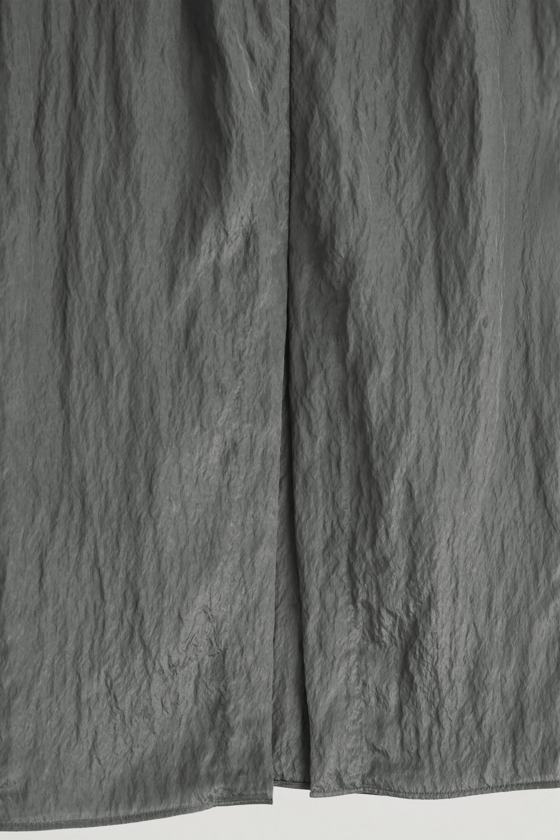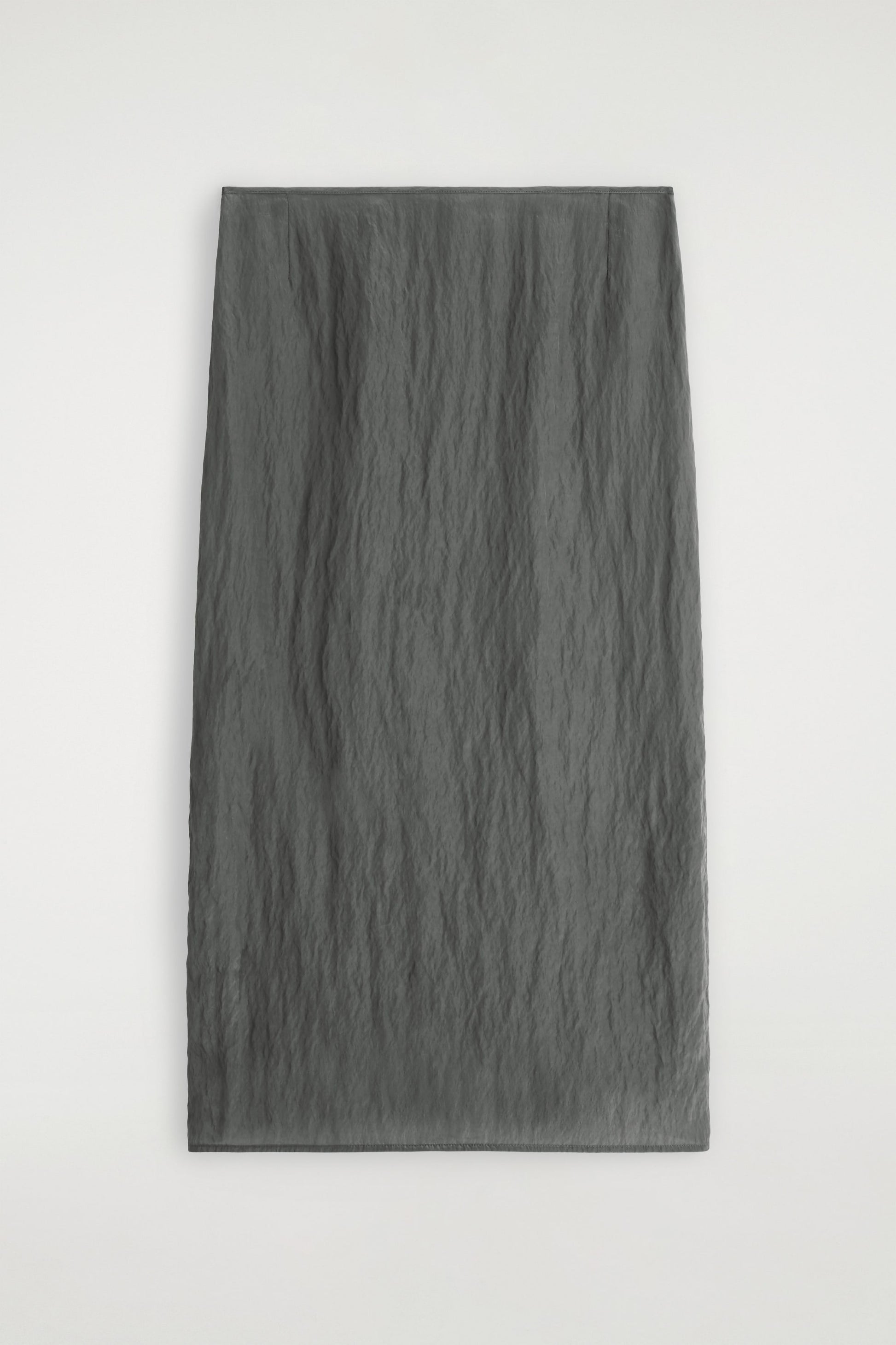 Autumn Winter 2025 takes the modern wardrobe to new heights: the epitome of quiet confidence. A considered take on the classic pencil skirt, this piece is crafted from feather-light crinkled satin and designed with a minimal, straight silhouette and an elongated slit at the back. The inky steel hue spotlights the subtle ripples in the fabric. Style it with the matching top for a tonal look.
