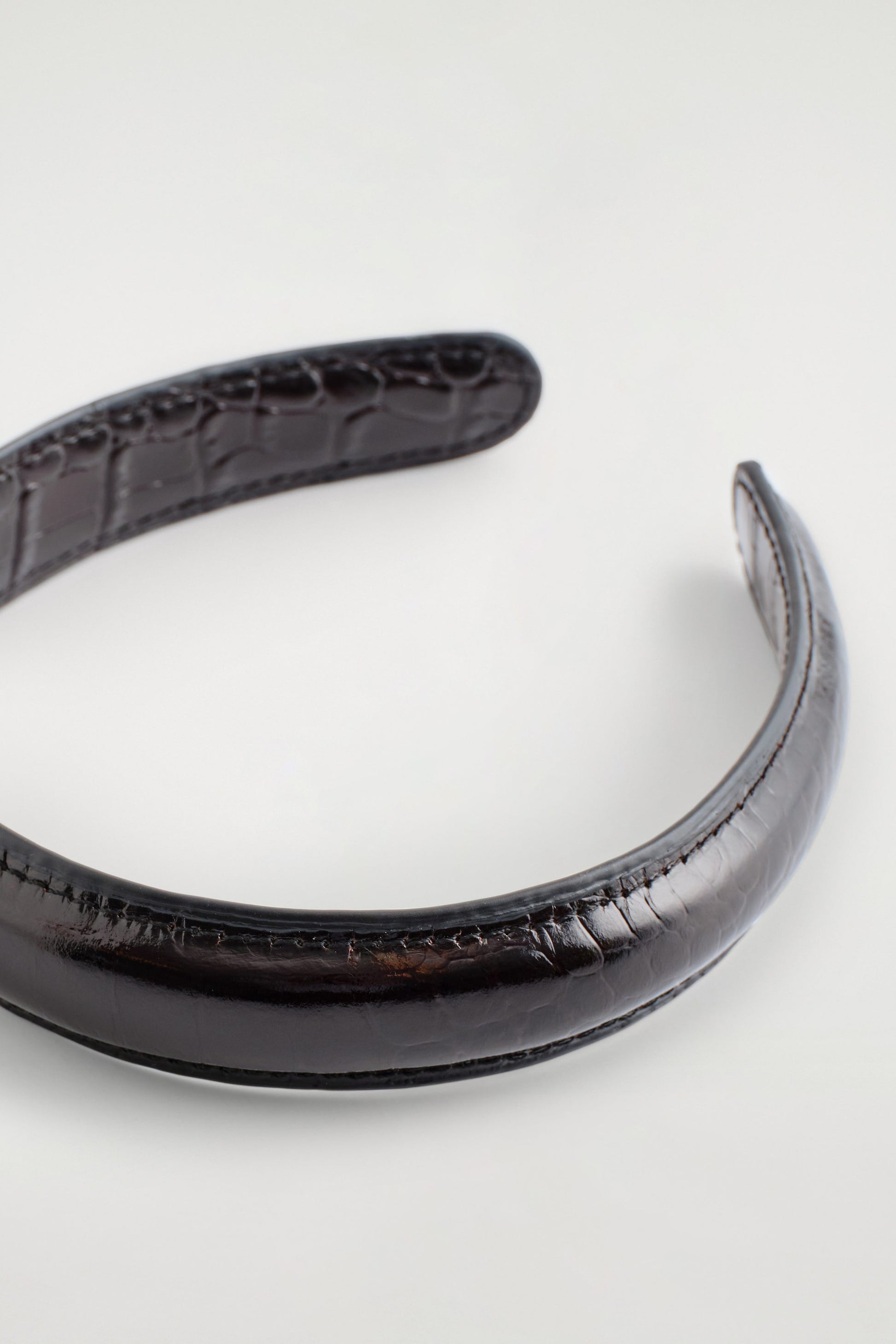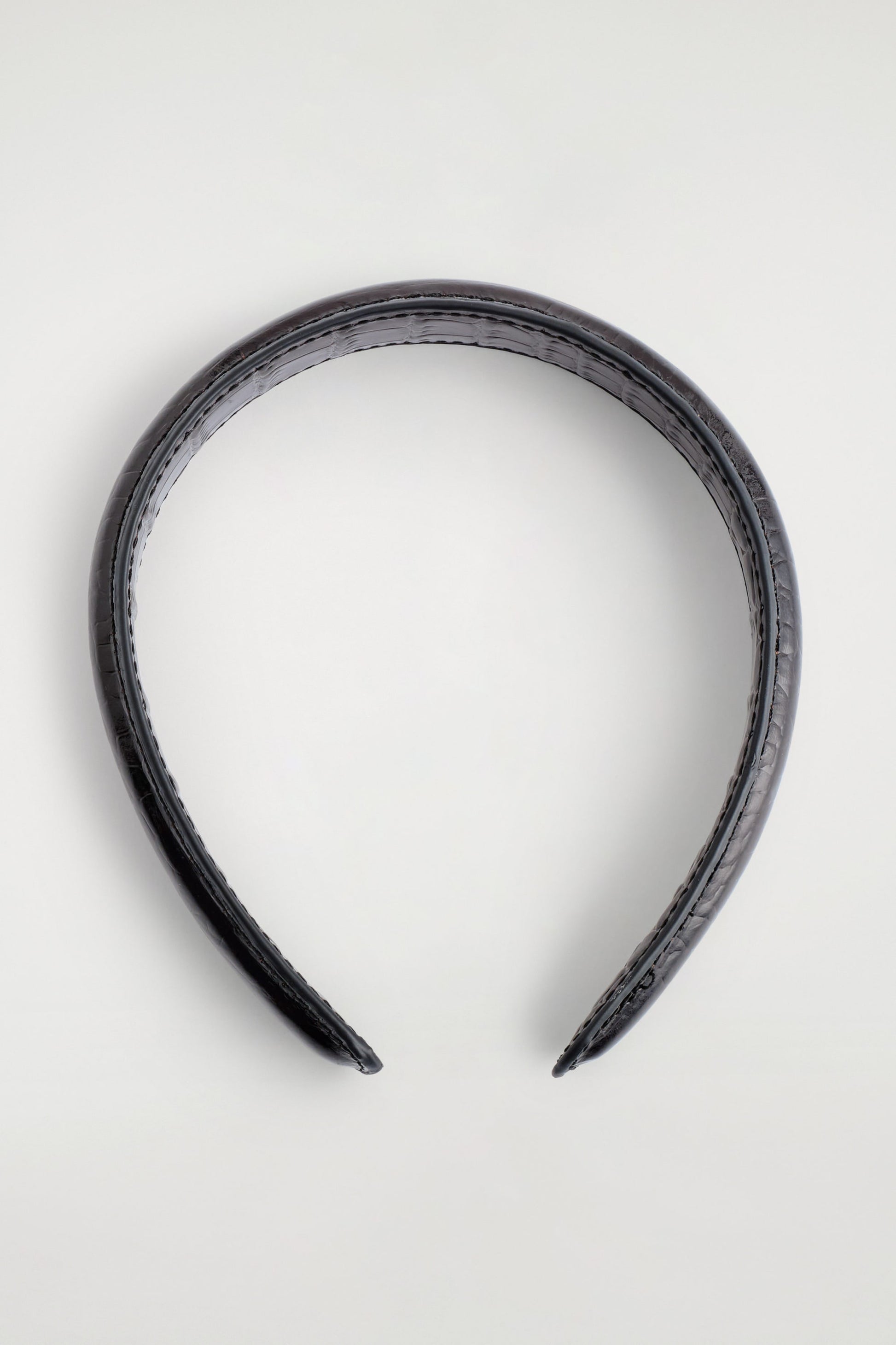 The COS accessories collection explores the dynamic textures of Autumn Winter 2025. This refined headband is crafted from butter-soft leather and embossed with a tactile crocodile-effect motif. Style it with your hair swept back.