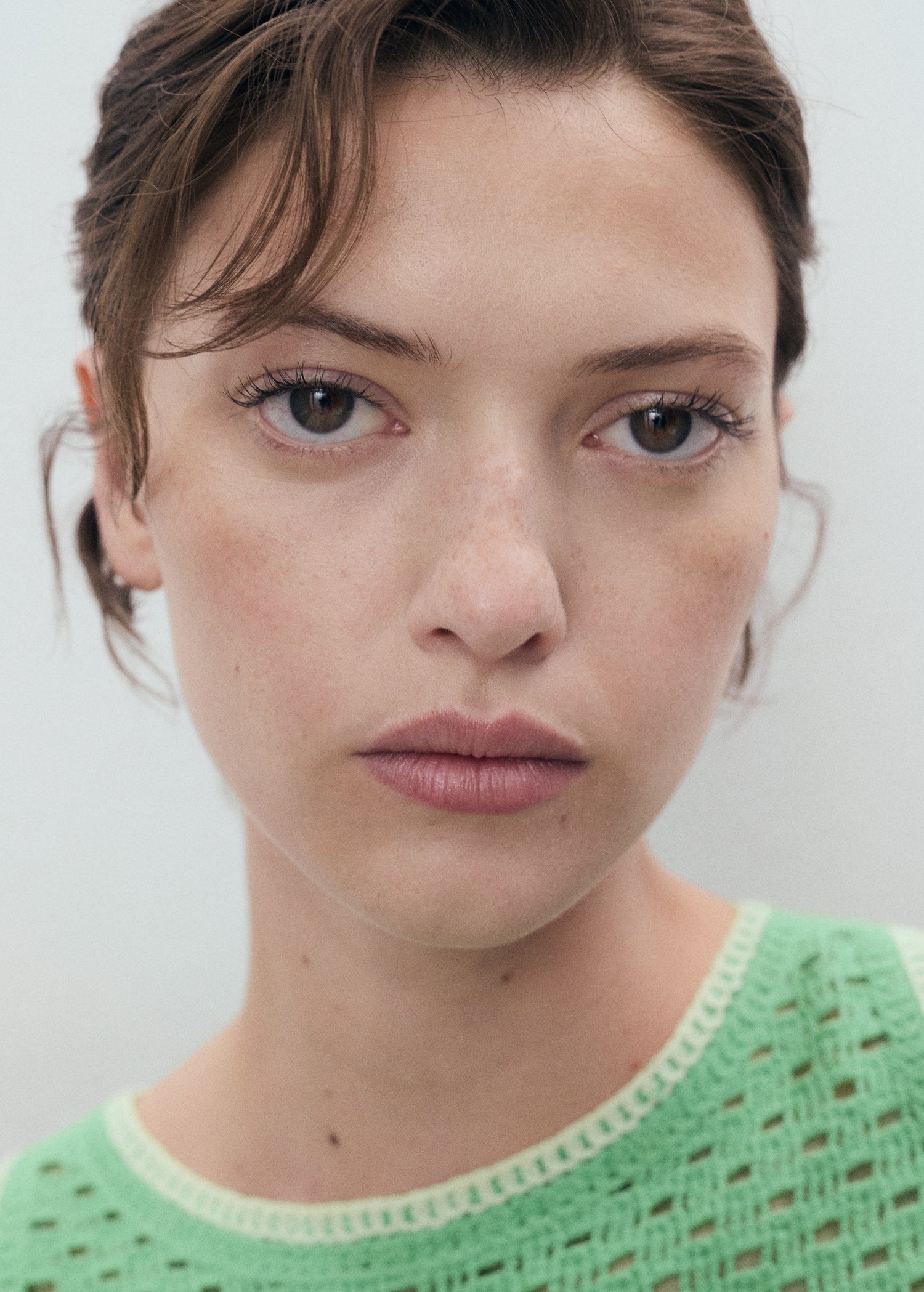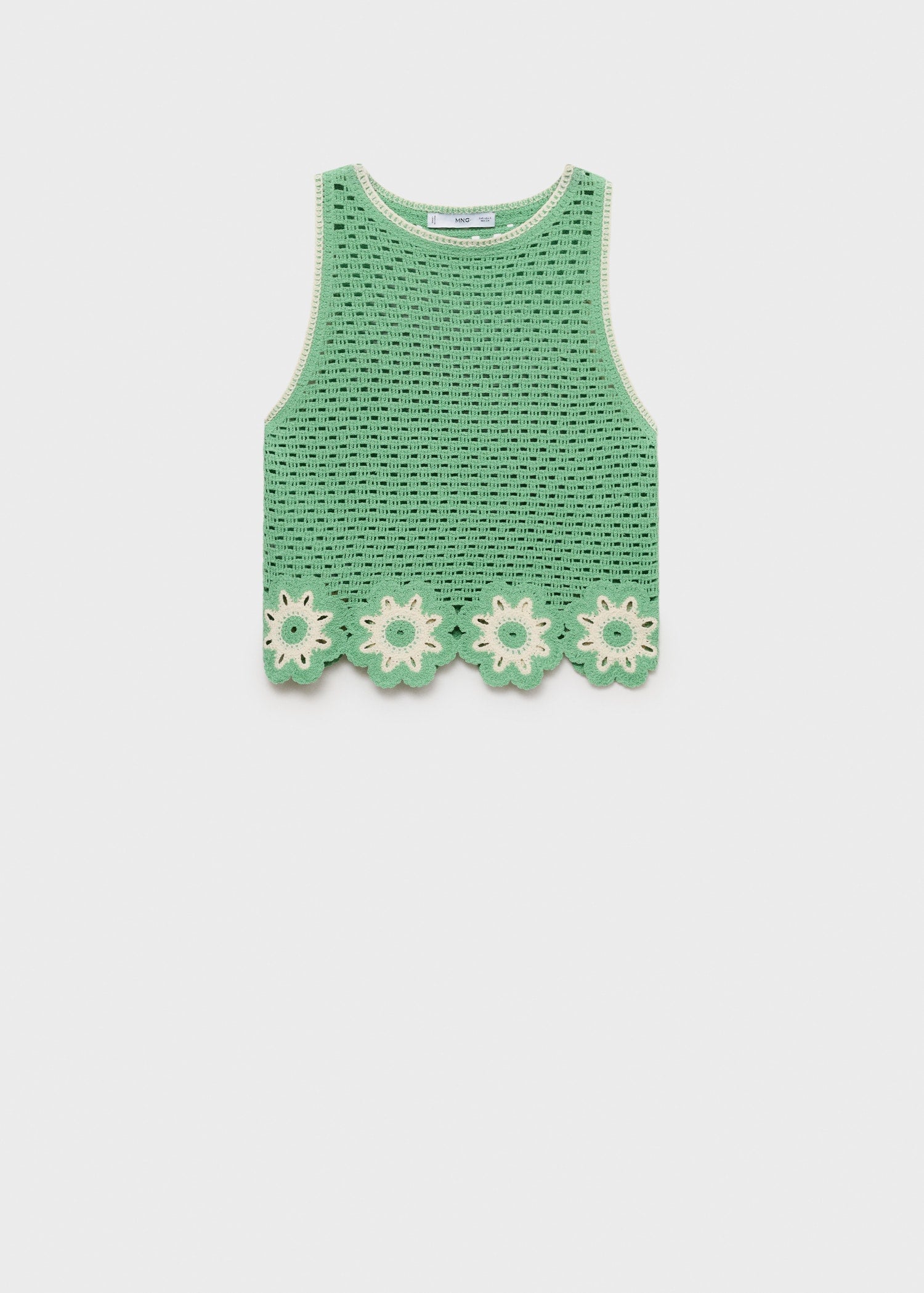This straight design, crafted from a medium-knit fabric, is distinctive for its round neckline and wide straps that enhance the silhouette. The hem, adorned with a floral finish, introduces a distinctive touch that elevates the piece to a unique level of style