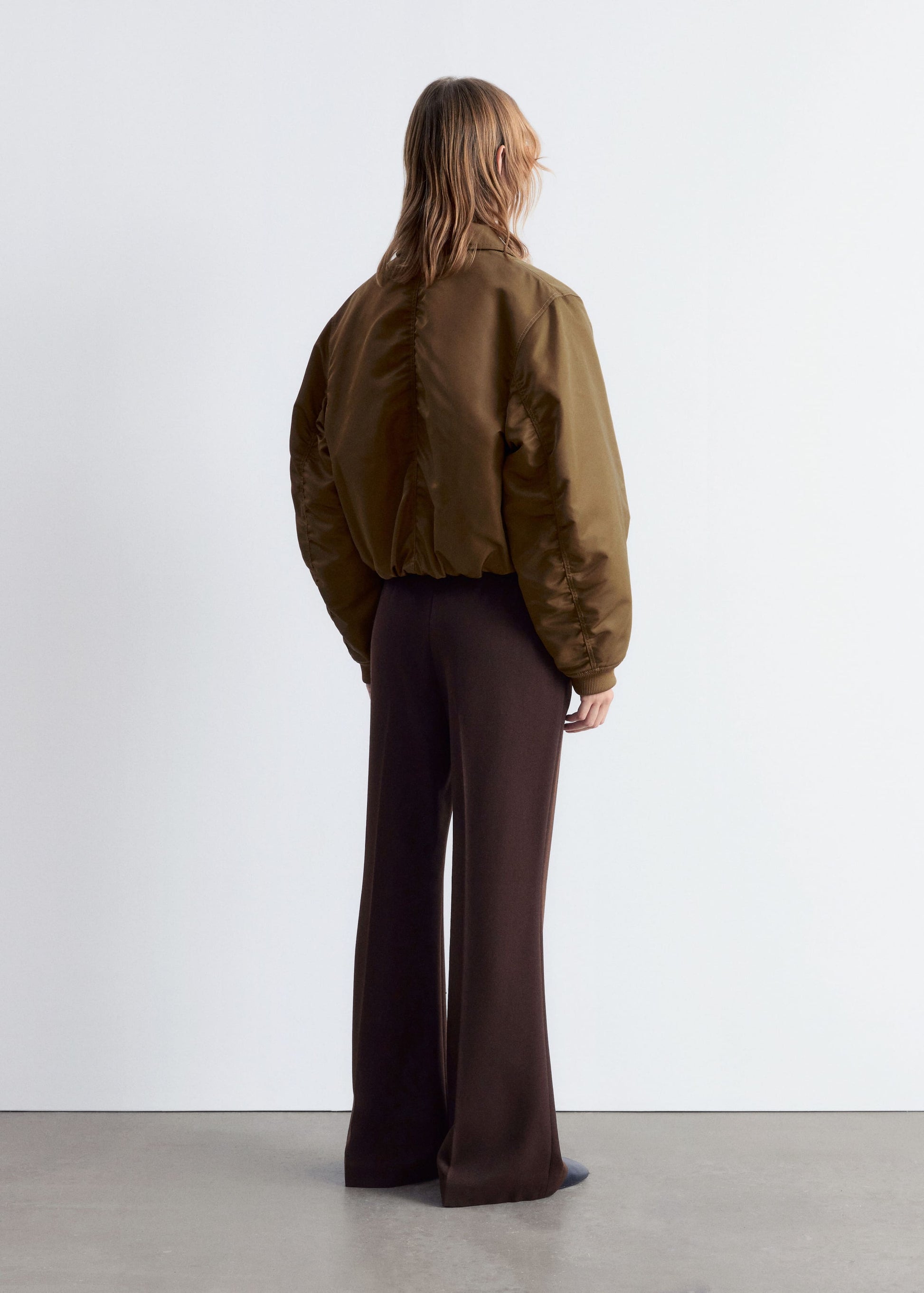 Bomber jacket cut in a boxy, cropped silhouette with all-over light padding, adding warmth and structure. It features a classic collar, light puckering along the seams, ribbed cuffs, and two slanted jet flap pockets with hidden snap buttons.