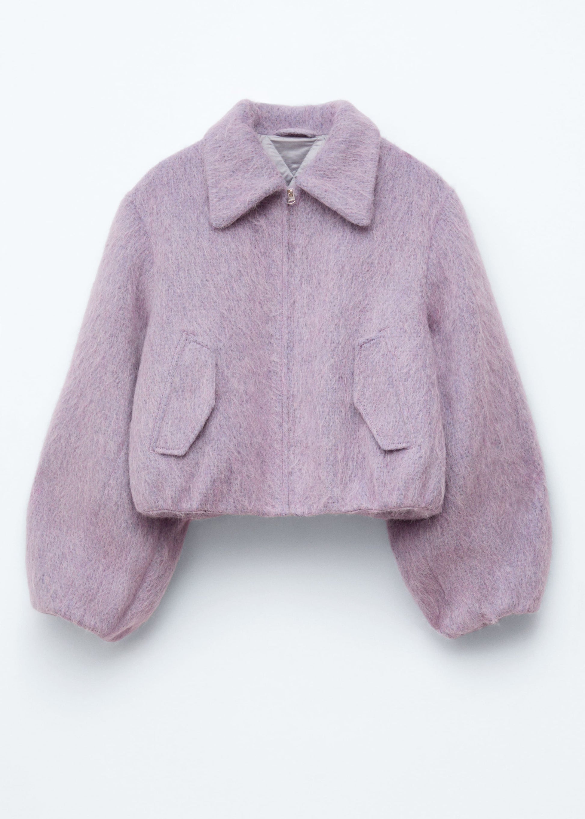 Crafted from a wool blend with a fuzzy, textured finish, this bomber jacket is cut in a cropped, boxy silhouette with light padding. It features a turn-down collar, slanted flap pockets with press buttons, an elastic hem, and a metal zipper at the front.