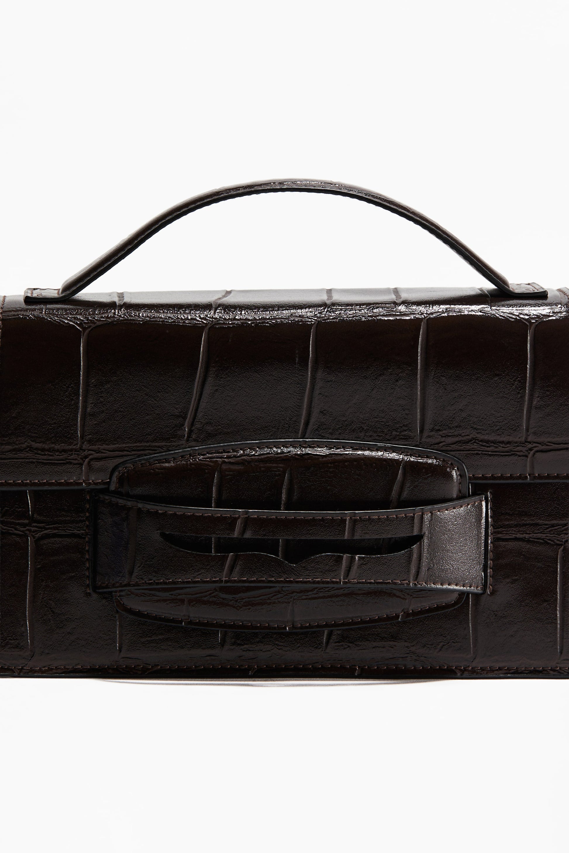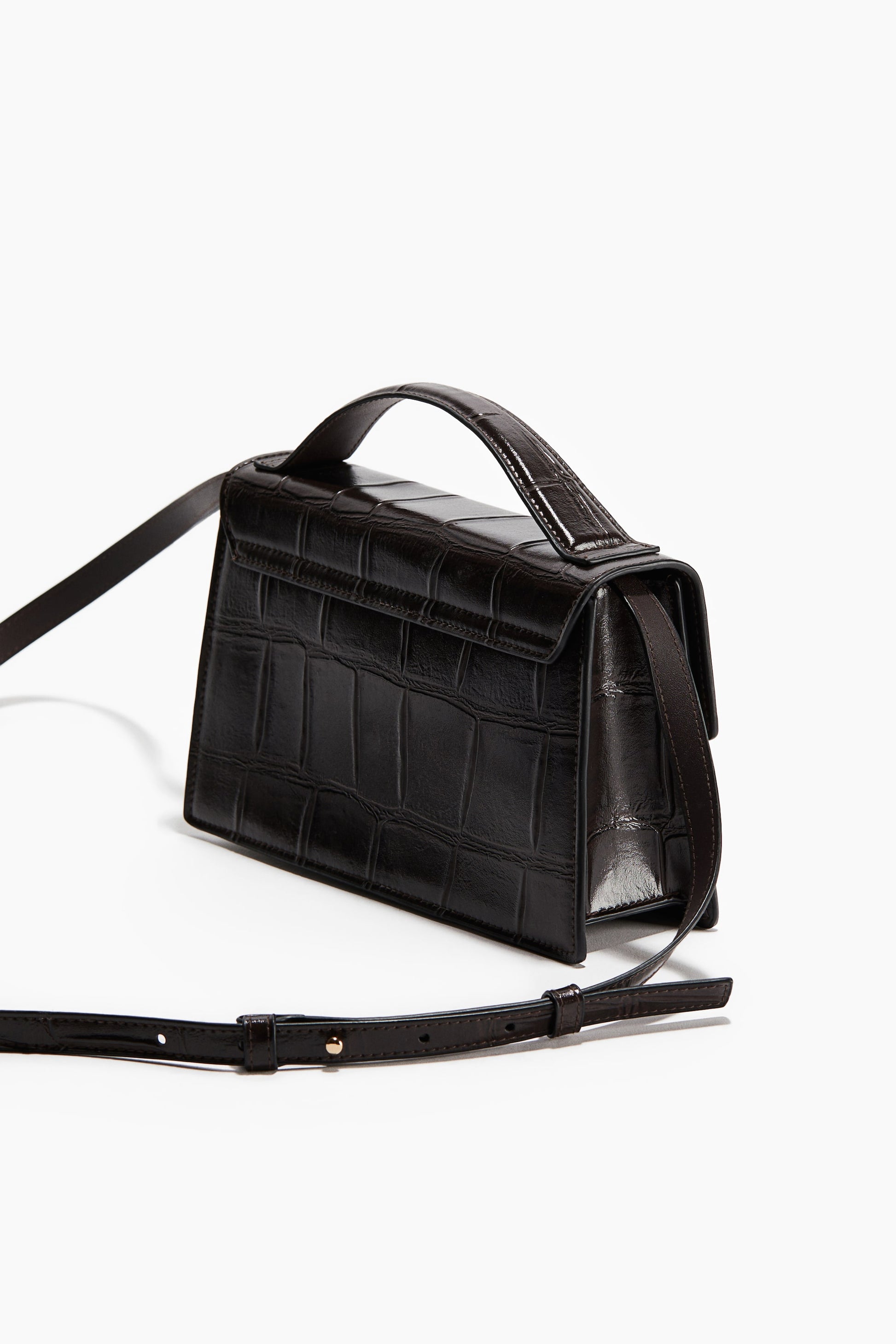 Crossbody bag featuring a flap with a handle on top and a tab fastener at the front. Adjustable shoulder strap. Lined.