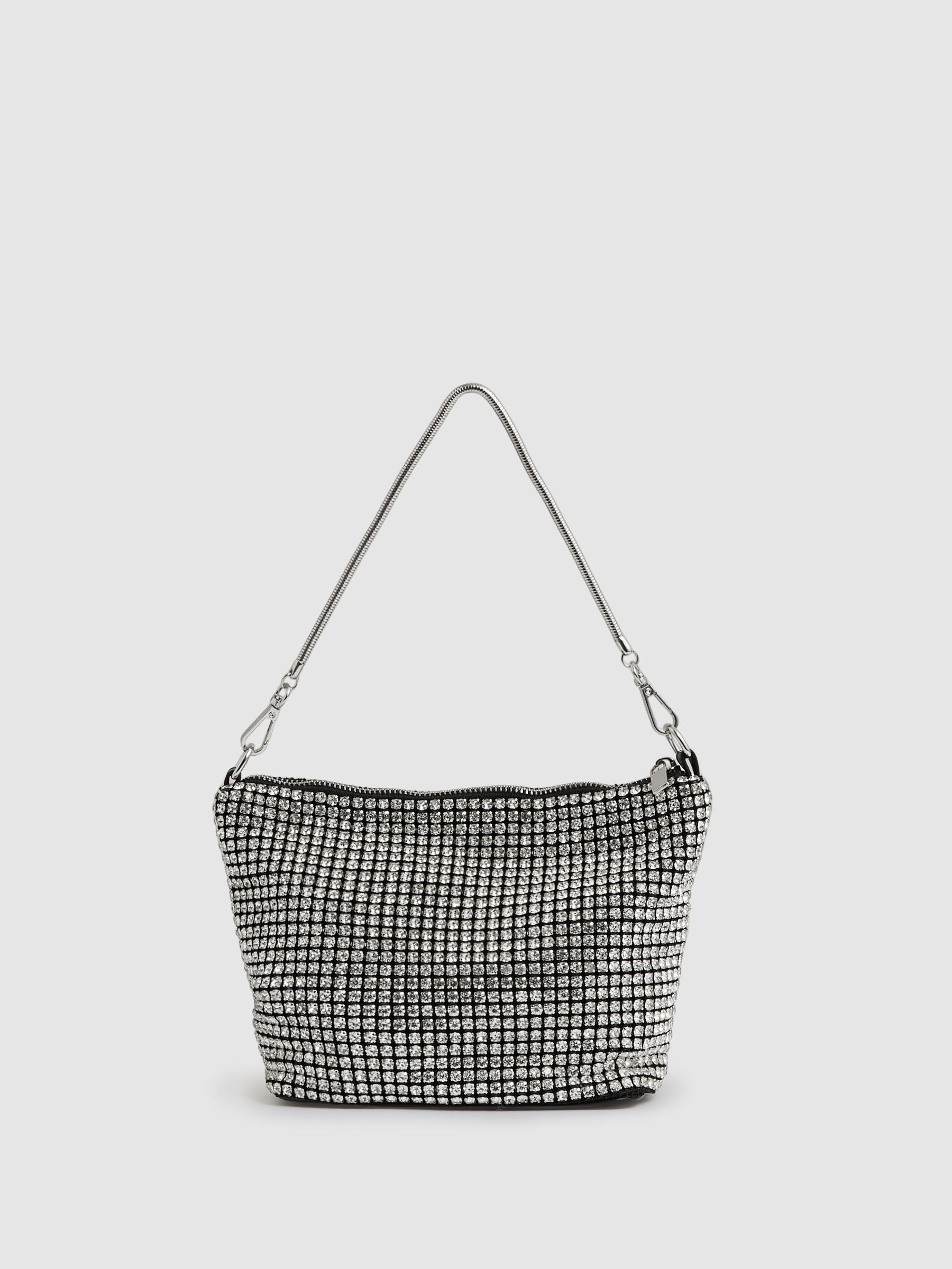 Add a touch of sparkle to evening looks with the Leah pouch bag, adorned with clear crystals that catch the light from every angle. A versatile snake-chain strap can be linked together to form a bracelet, offering both elegance and functionality. Crystal embellishment. Detachable snake-chain strap. Internal slip pocket. Zip fastening.