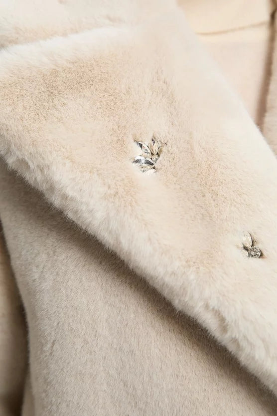 Faux fur main 100% Polyester. Lining 100% Polyester. Dry clean only. Model height 5"9. Model wears Size UK8US4. Item length 115cm