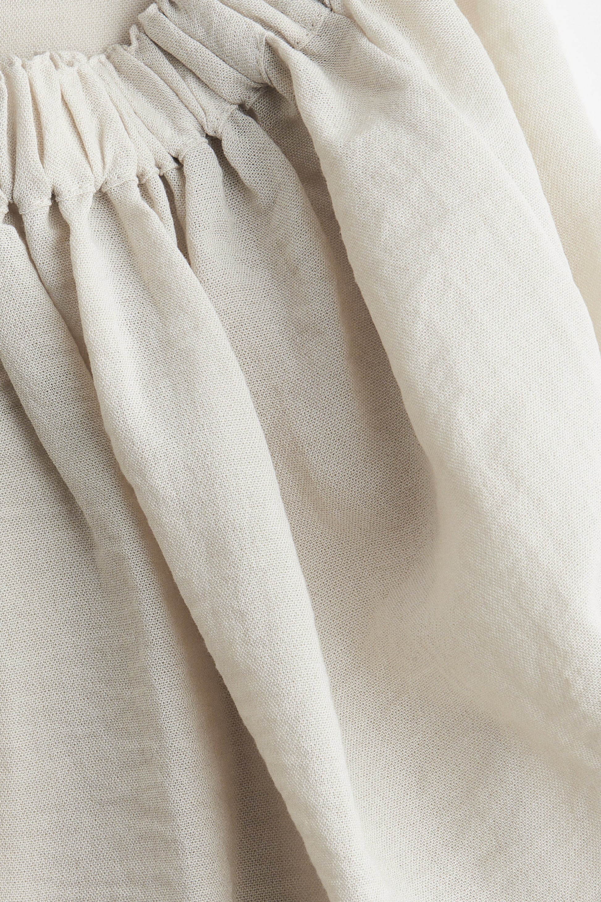 Calf-length dress in an airy weave made from a viscose blend. It features a round neckline and wide, elasticated shoulder straps that cross at the back. Open back and cut-out sections at the sides with covered elastication around the edges, creating gathers at the front and back. Unlined.