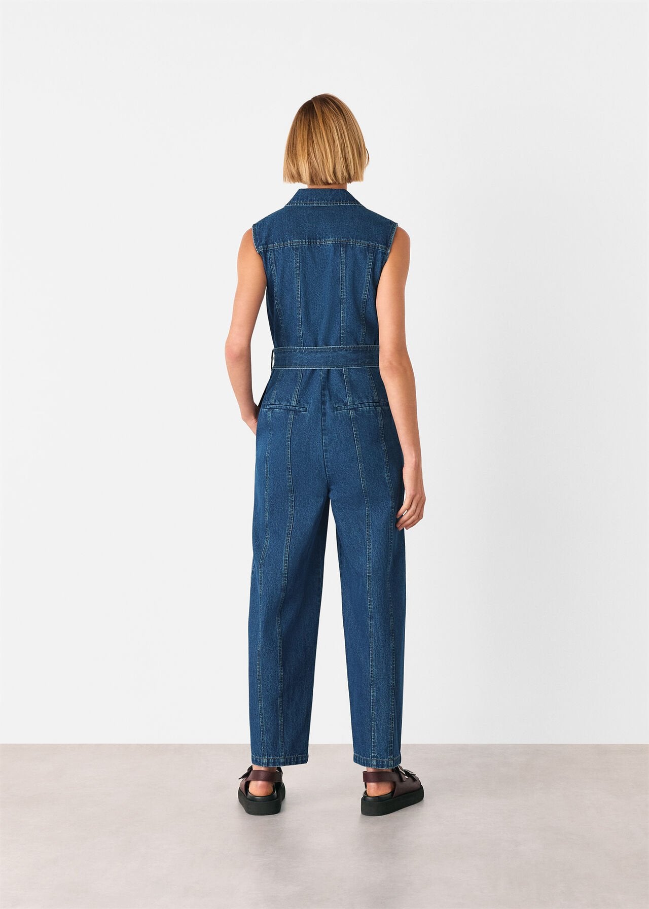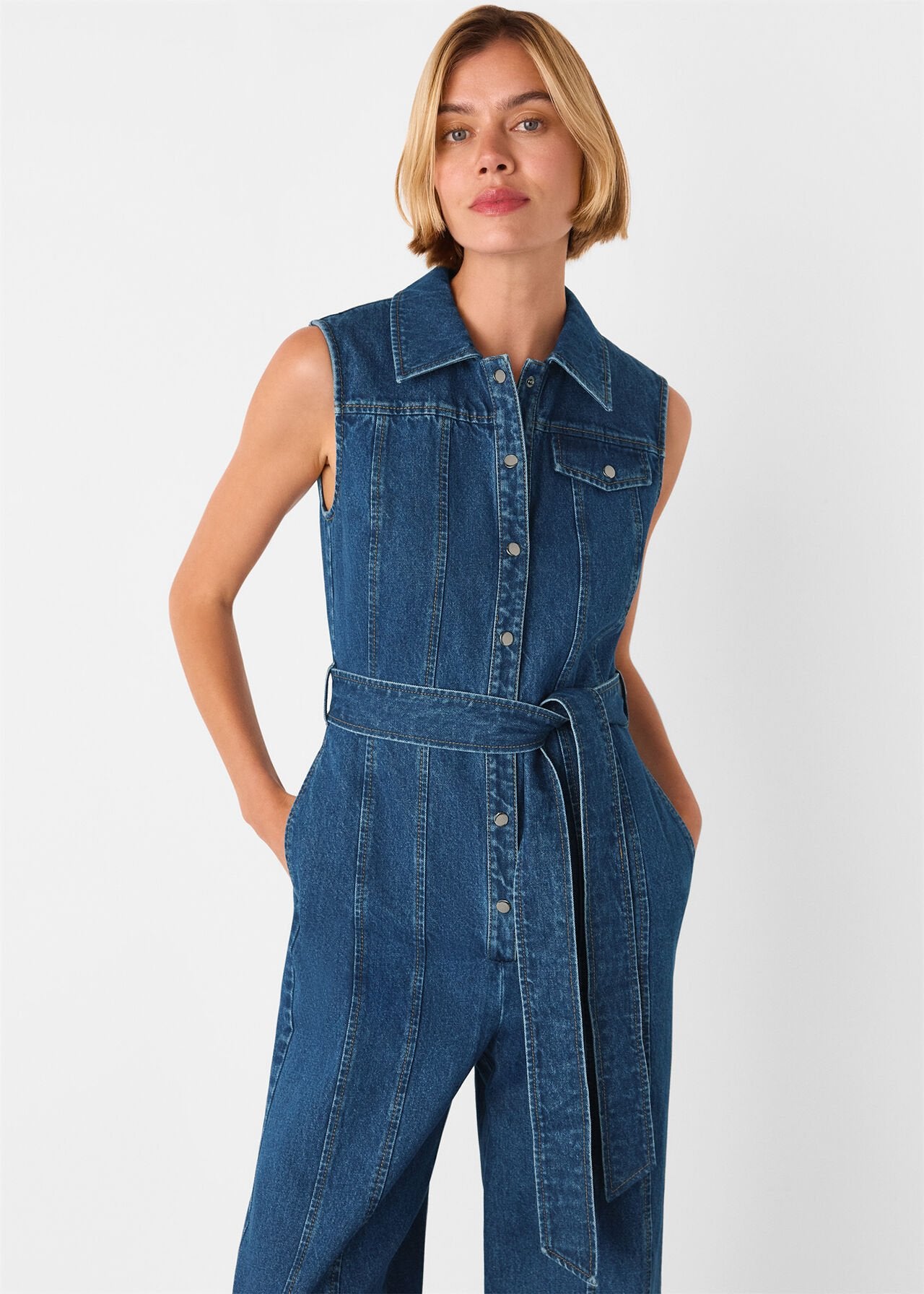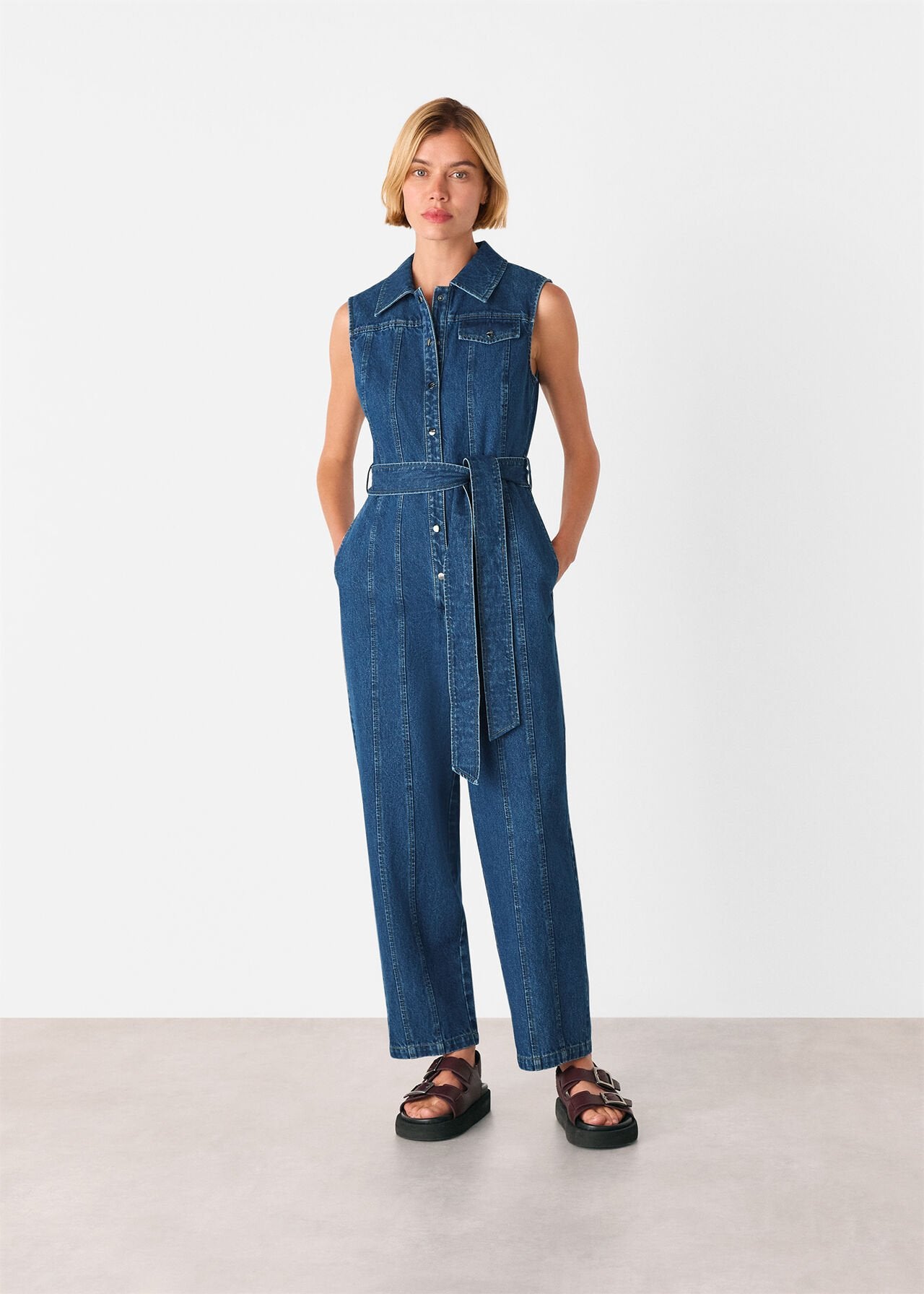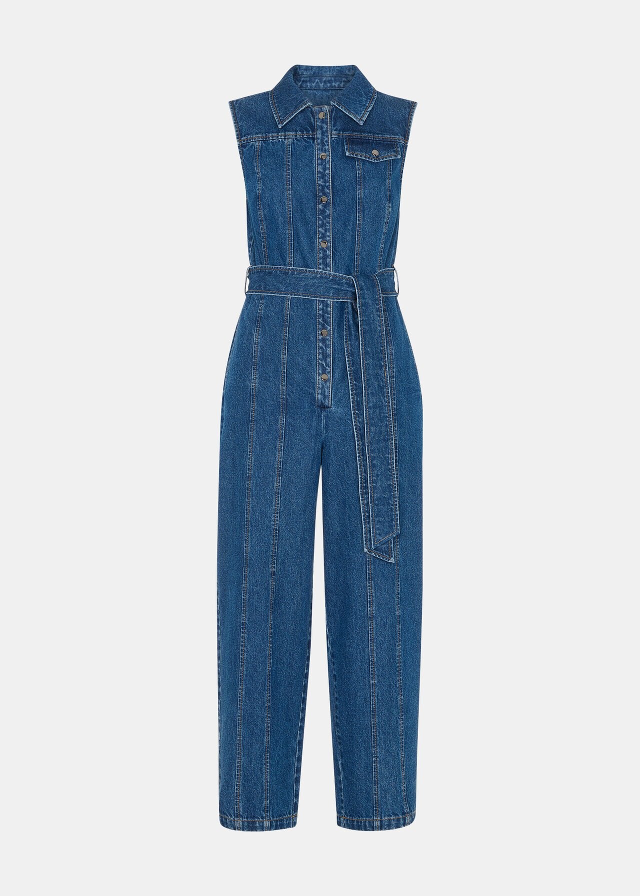 Endlessly versatile, our Barrel Leg Jumpsuit is your all-in-one outfit solution. Its cut to our signature barrel leg shape, fitting looser through the thigh and cropped at the ankle, in an effortless shade of mid-wash denim. The sleeveless silhouette, collar and belted waist further the modern look, making it your go-to choice for laid-back chic this summer.