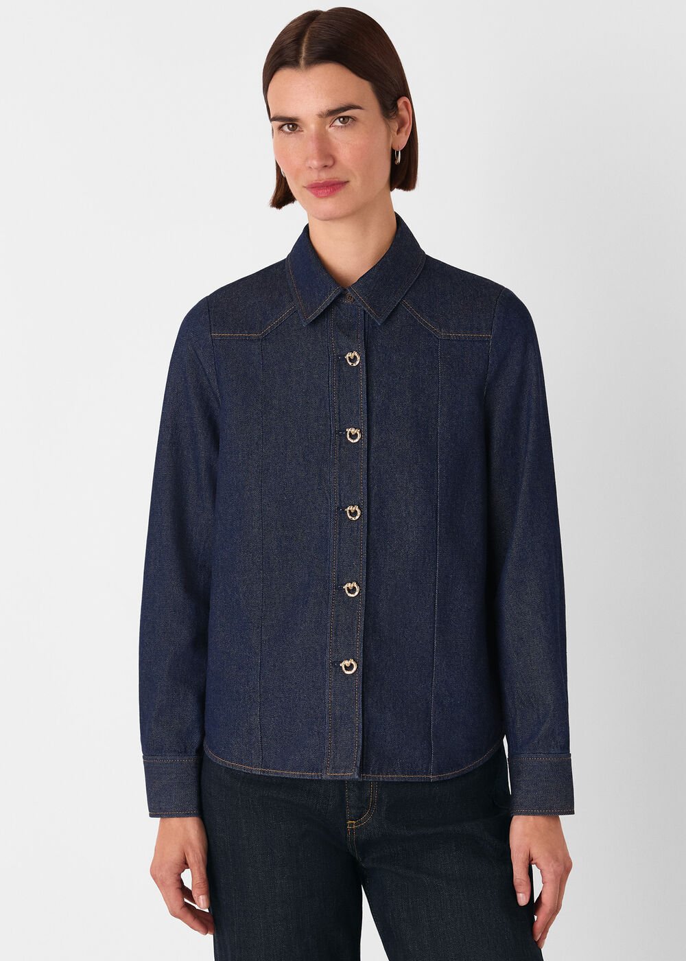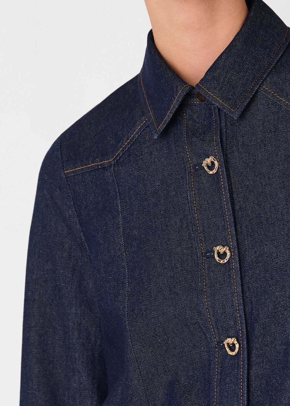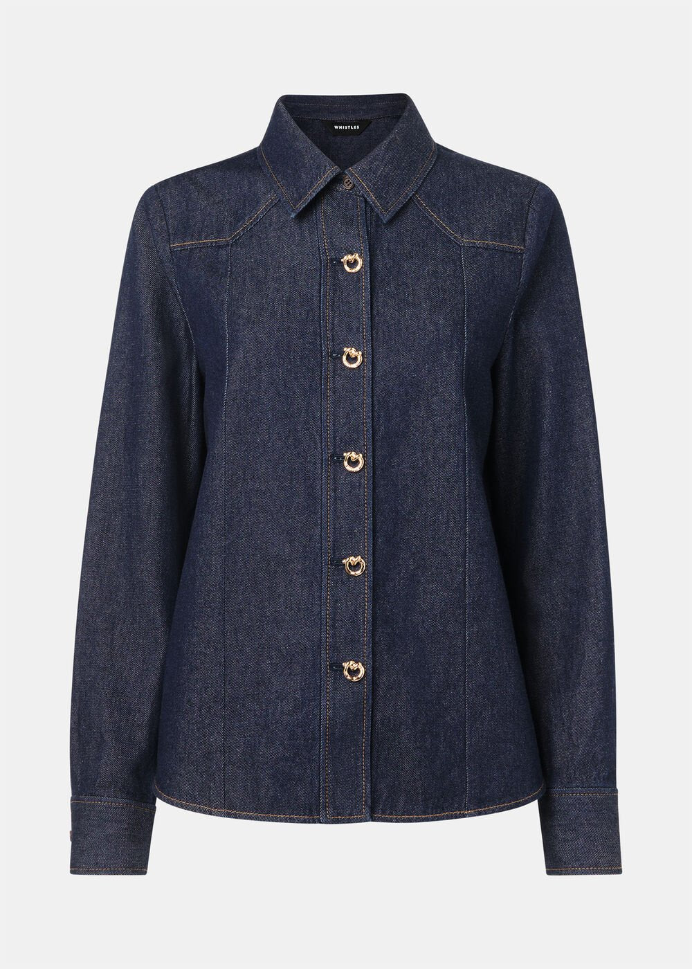 Our Button Detail Cotton Shirt brings a contemporary twist to classic tailoring, reimagined in rich dark denim for a confident, modern feel. Its cut with a straight silhouette and defined by distinctive gold-toned buttons, a sharp collar and contrast topstitching that frames the structure beautifully. The result is a seamless blend of classic and modern perfect for elevating everyday looks or smarter edits with ease.