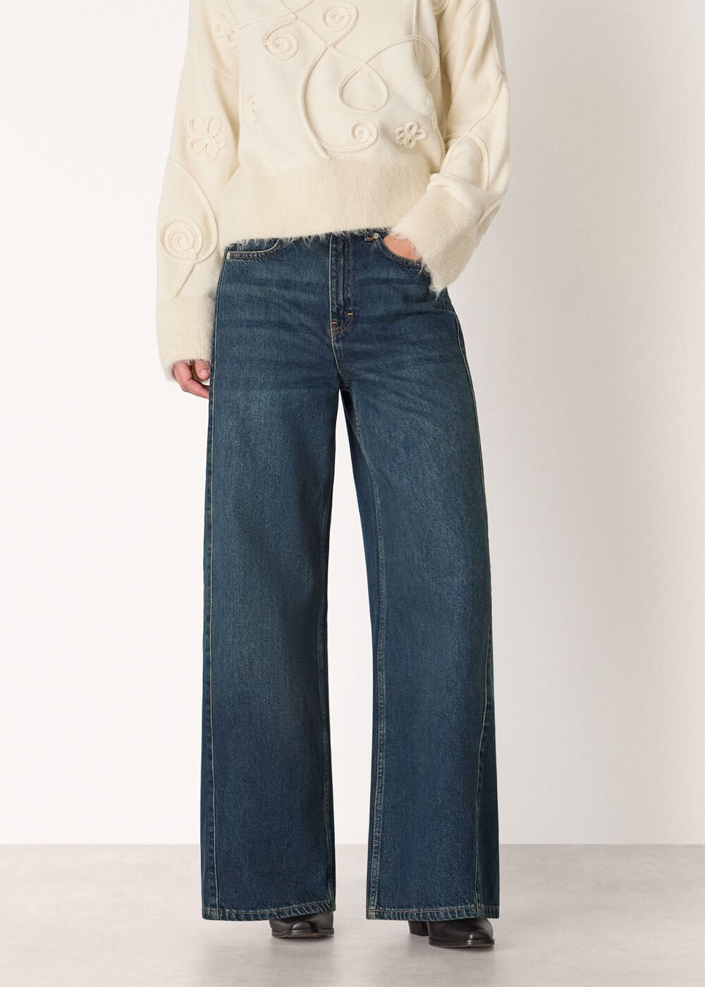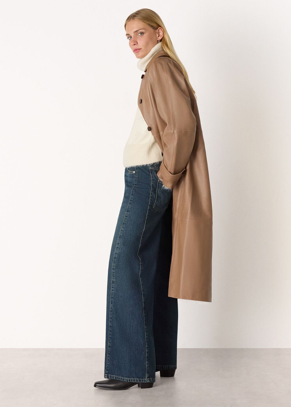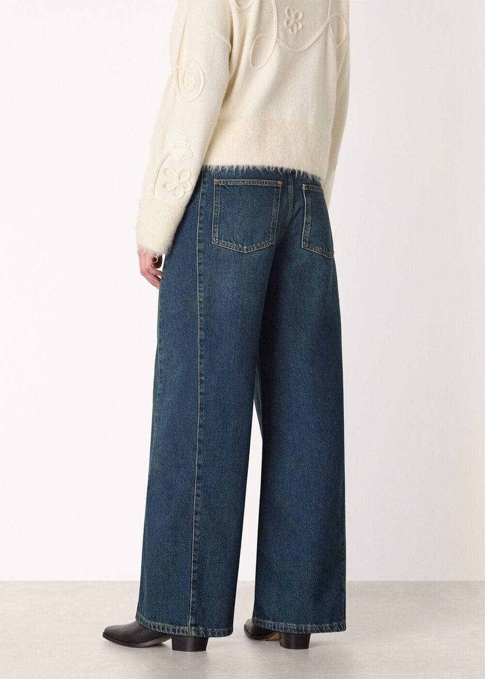 This season, our Design Team takes a modernised approach to classic denim. Our Panel Wide Leg Jeans are the perfect example, cut from dark wash denim to a wide, straight-leg silhouette that gently flares towards the hems, giving a look that’s reminiscent of ‘70s styles. They’re designed to sit high on the waist and feature a full-length cut, as well as detailed with structured side panels to further the contemporary look.