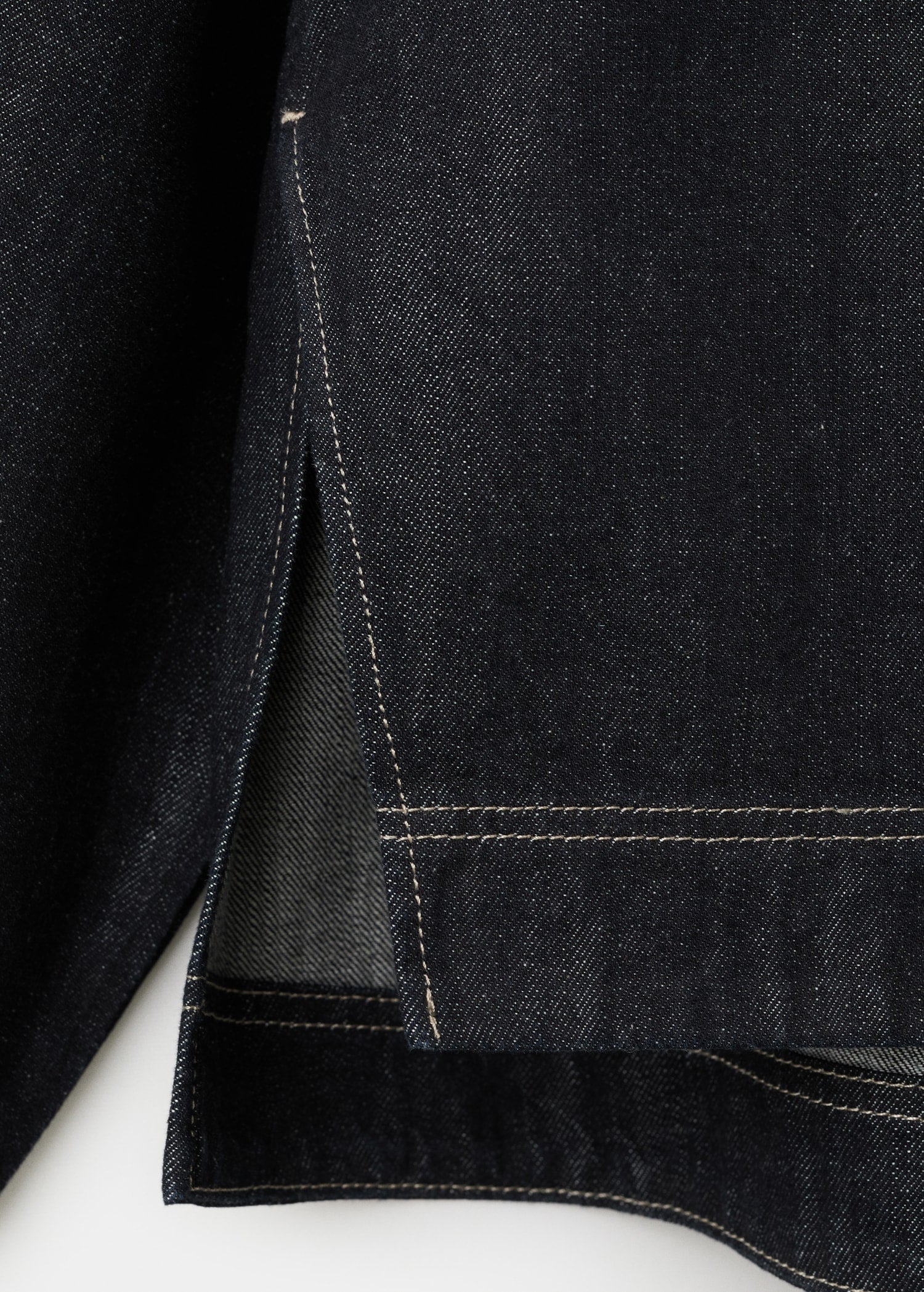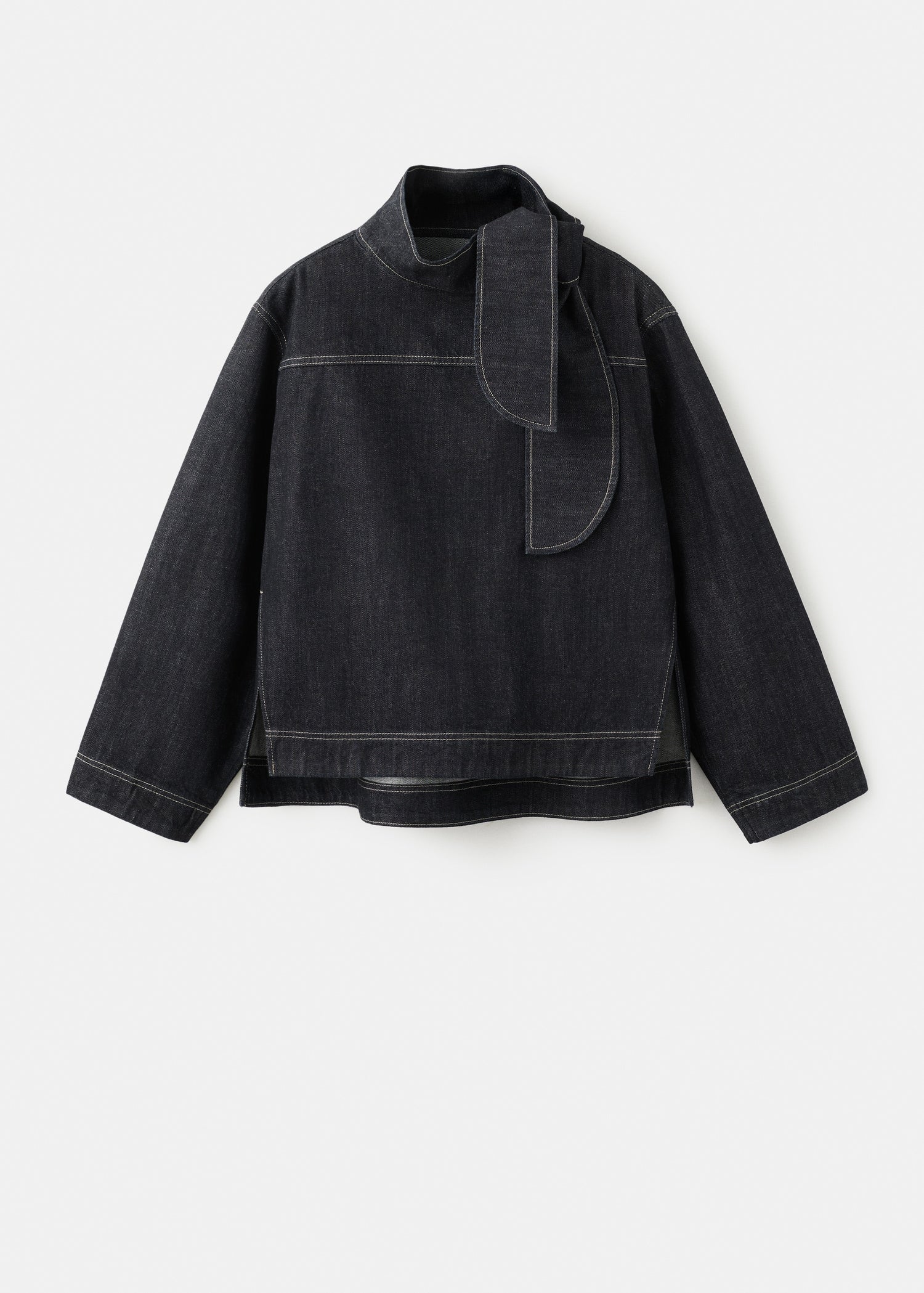 Denim-style cotton fabric. Straight design. Knot on the neck. Long sleeves. Contrasting seams. No Fastening. Side slits. Total look.