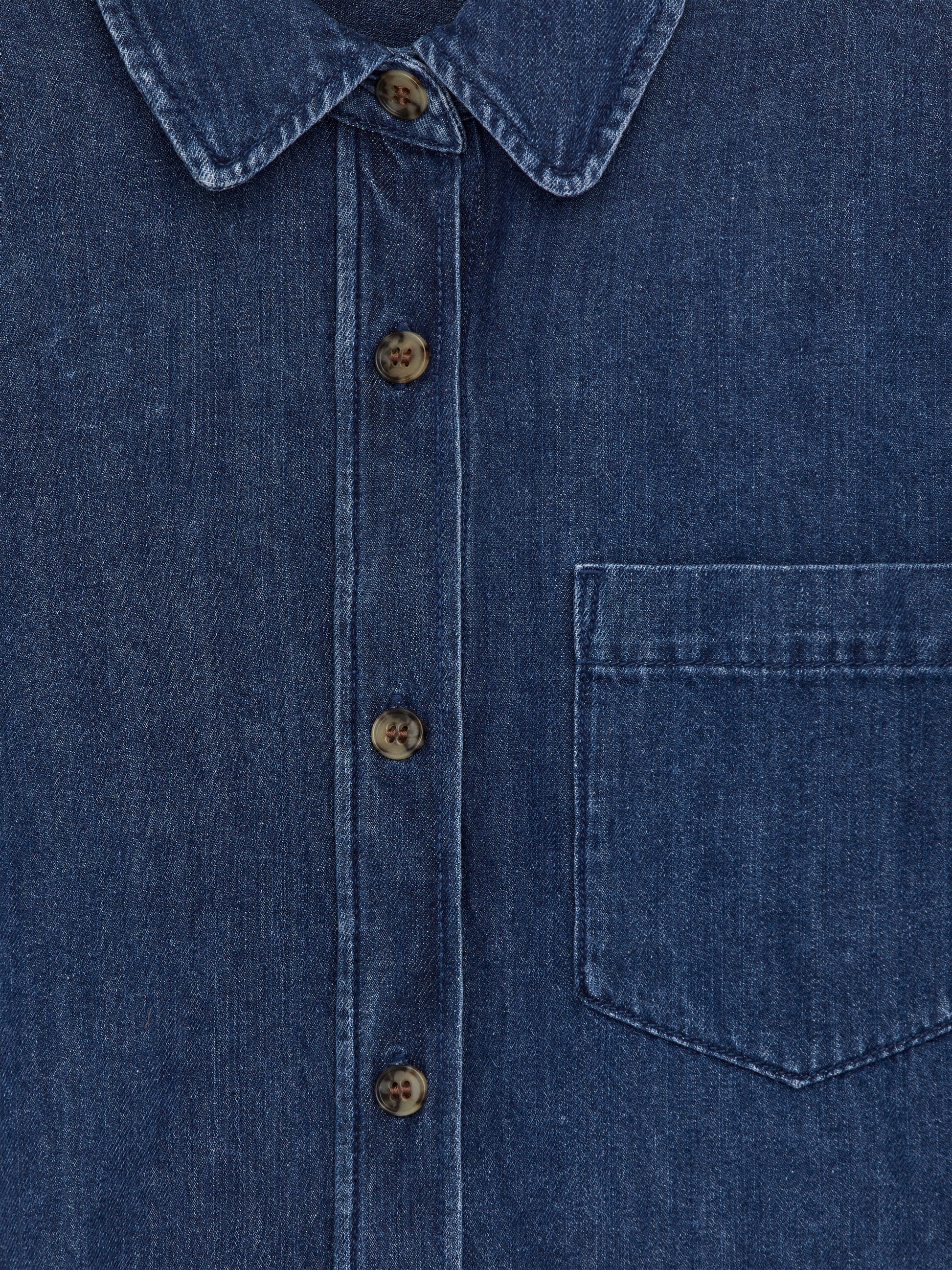 Denim shirt with a rounded collar, designed for a slightly cropped silhouette. Features a chest pocket and a regular fit.