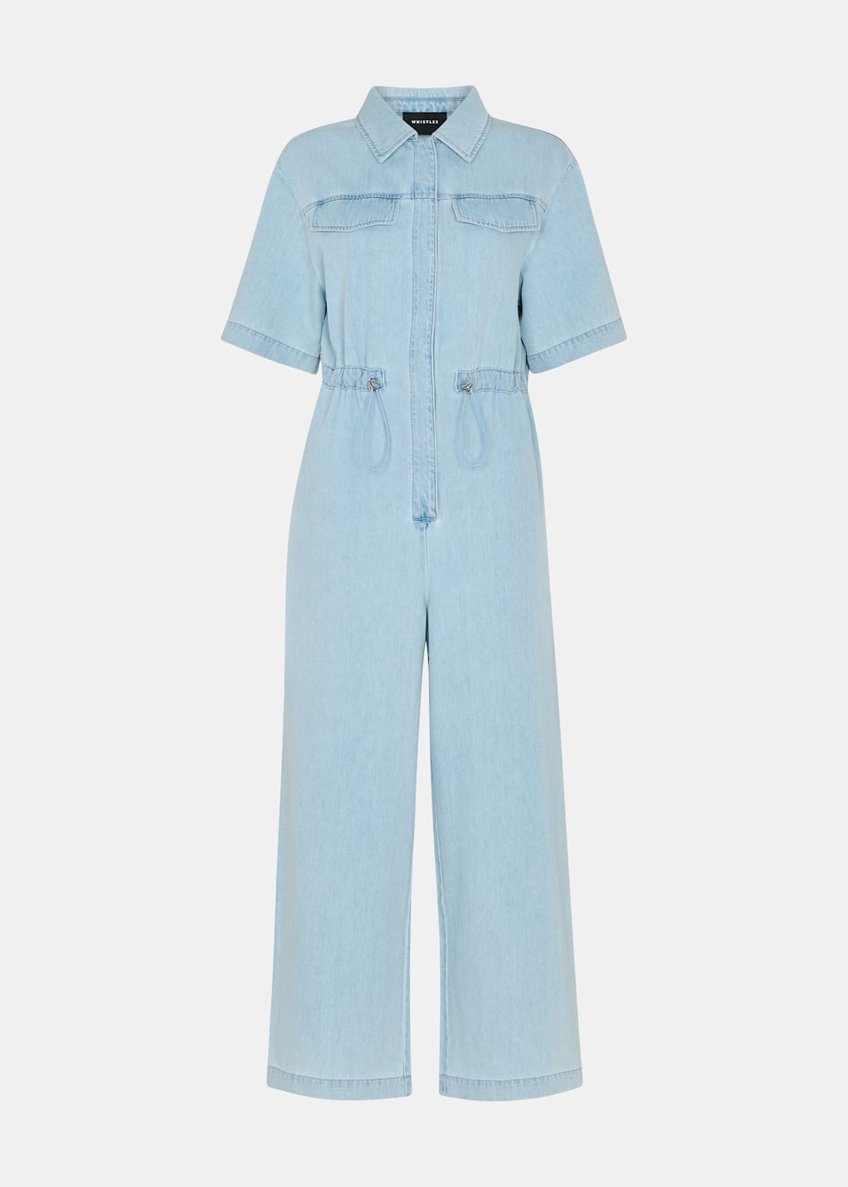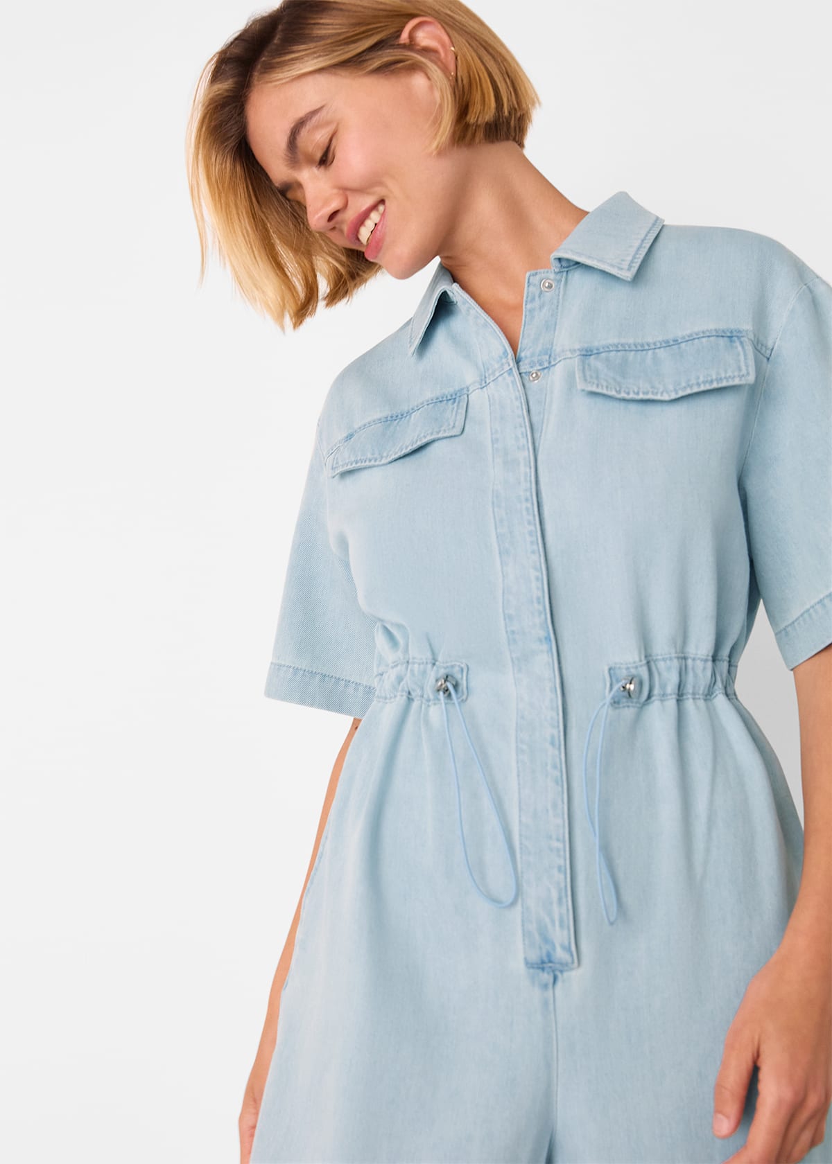 Our Short Sleeved Utility Jumpsuit represents a modern, sophisticated approach to classic style. Its crafted in a light denim wash and detailed with a collared neckline, a drawstring waist and utilitarian-inspired pockets at the chest and lower leg. Whether youre running errands or exploring the city, bring a contemporary, functional touch to your looks.