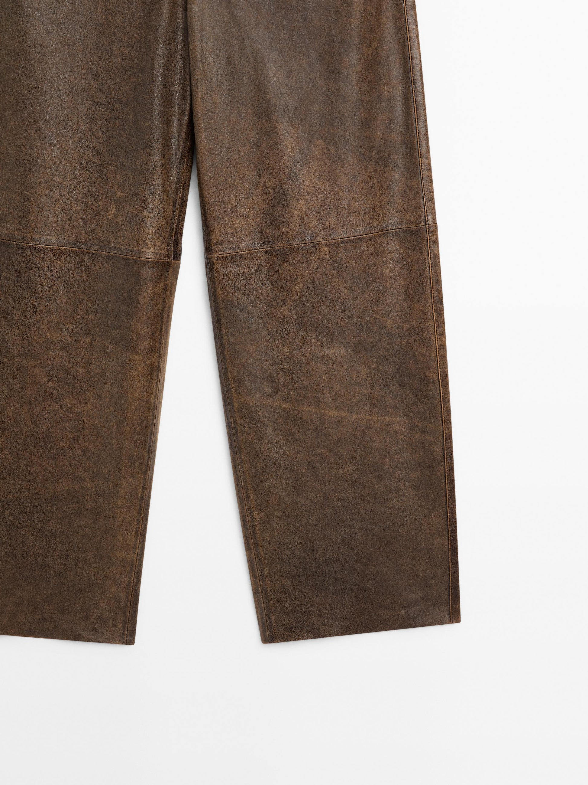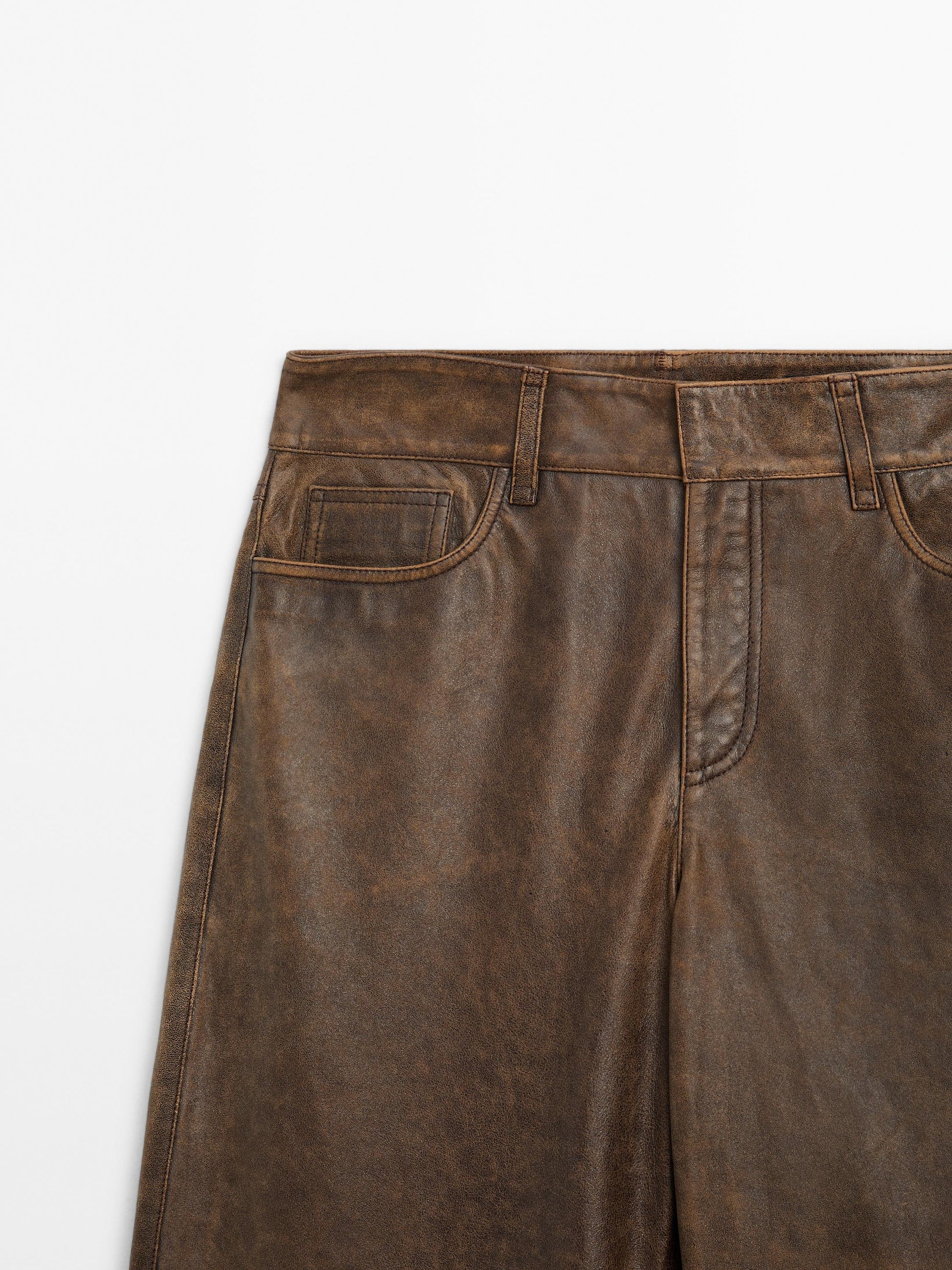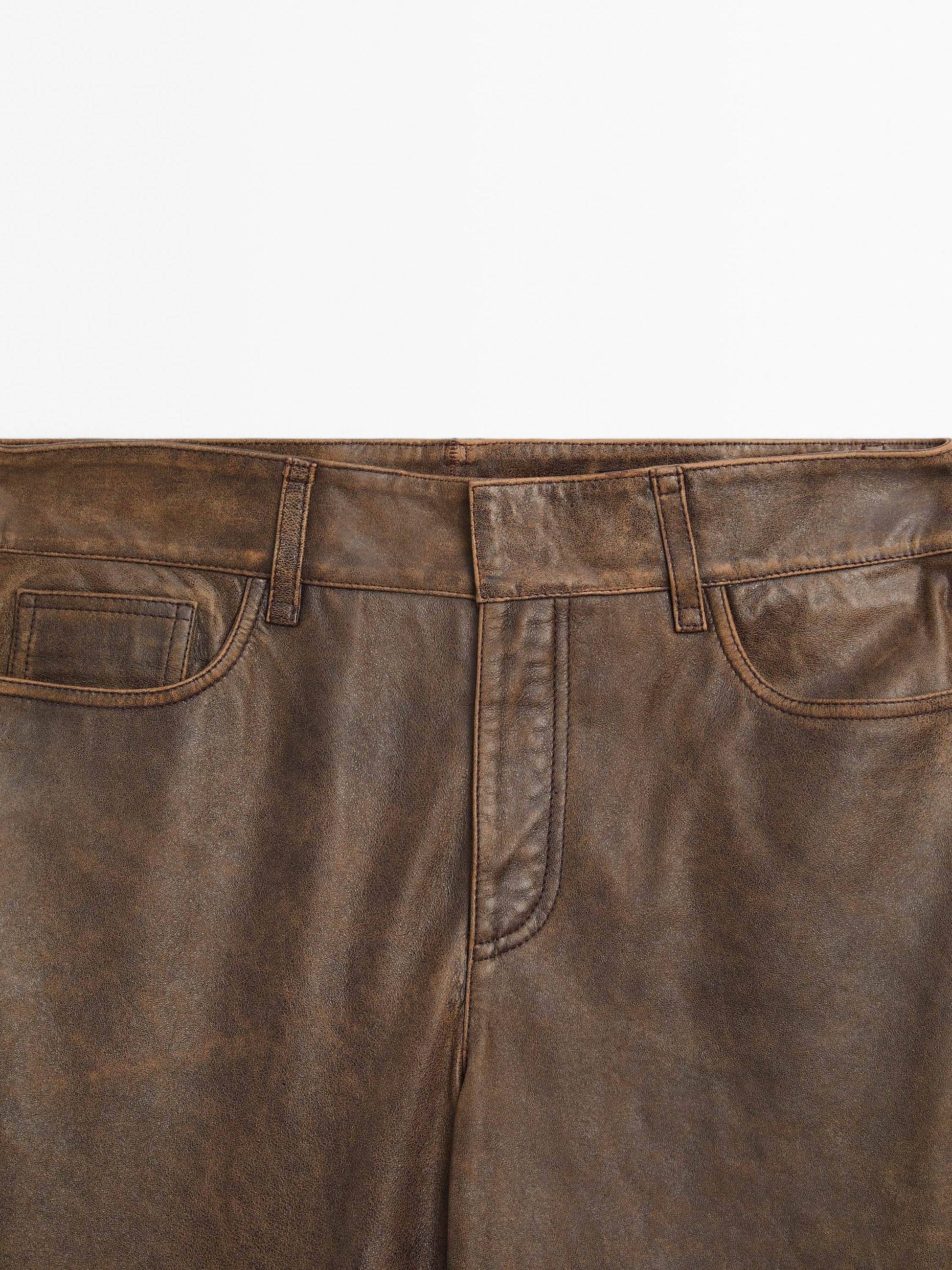 Trousers made of sheepskin with a nappa finish. Zip fastening concealed by a placket, with hook-and-eye clasp and button. Five-pocket design. Seam details . Worn effect.
