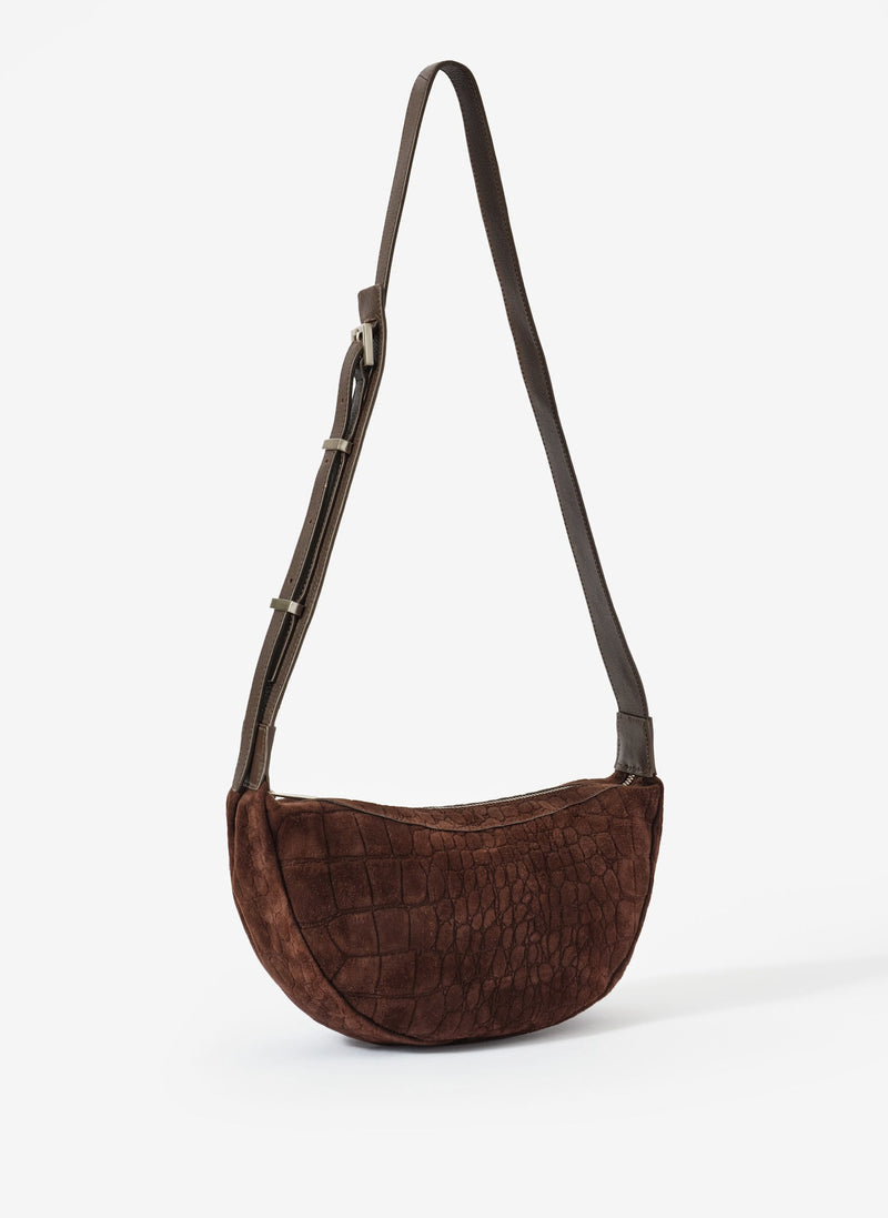 - Brown suede scoop sling bag with snake print detail, a buckled crossbody strap and a zip fastening across the top.