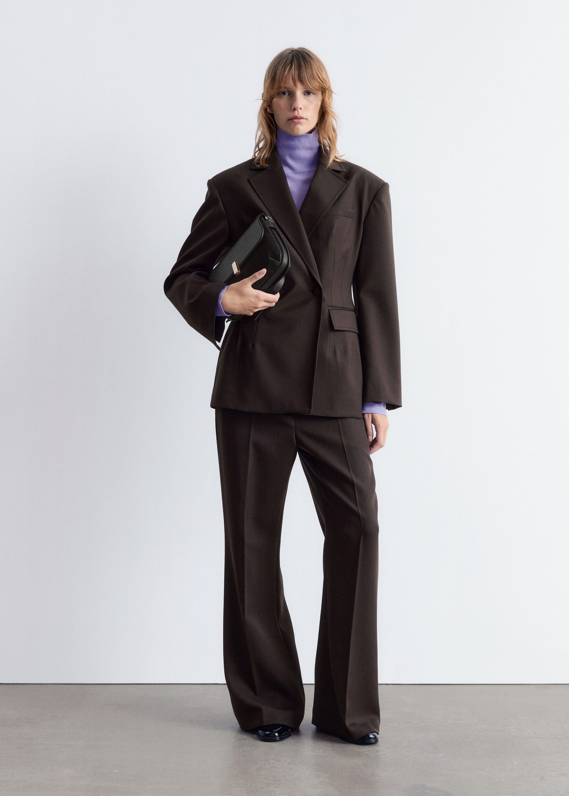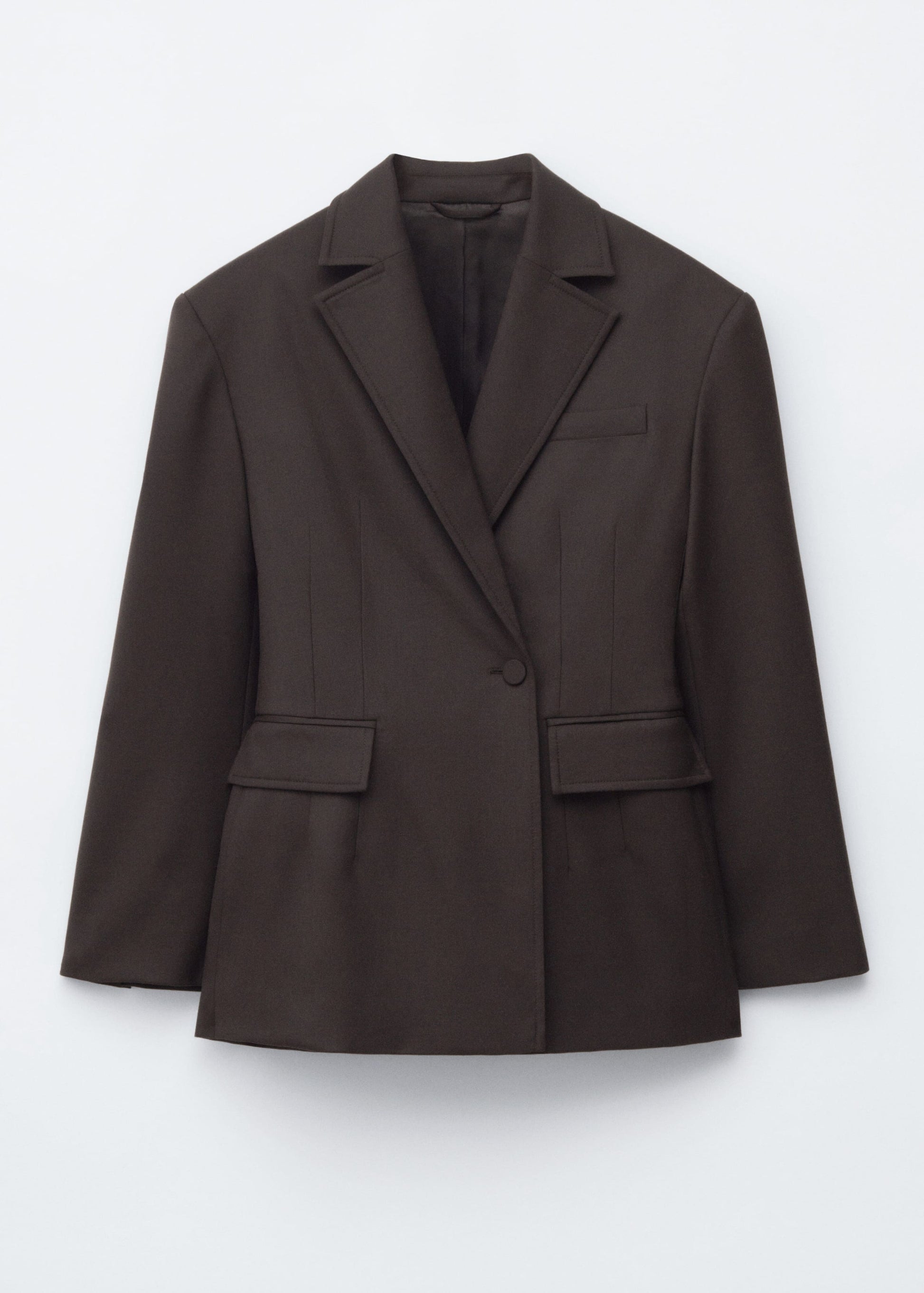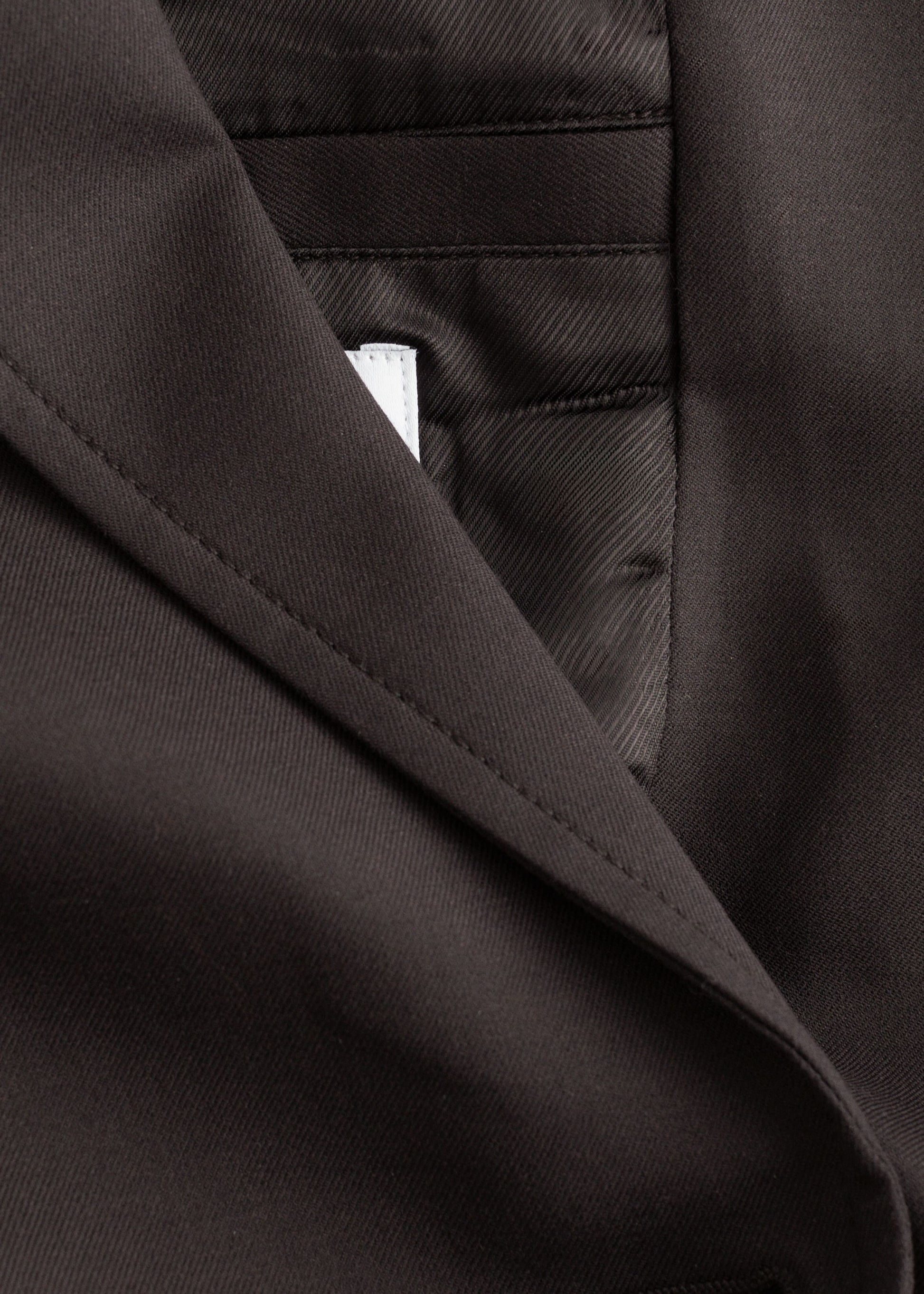 This double-breasted blazer is crafted from a wool blend. Cut in a structured silhouette, it features a pointed collar, a fitted waist, and broad shoulder pads for added definition. Finished with subtle vents at the hem and cuffs, a single welt chest pocket, and two flap pockets at the front.