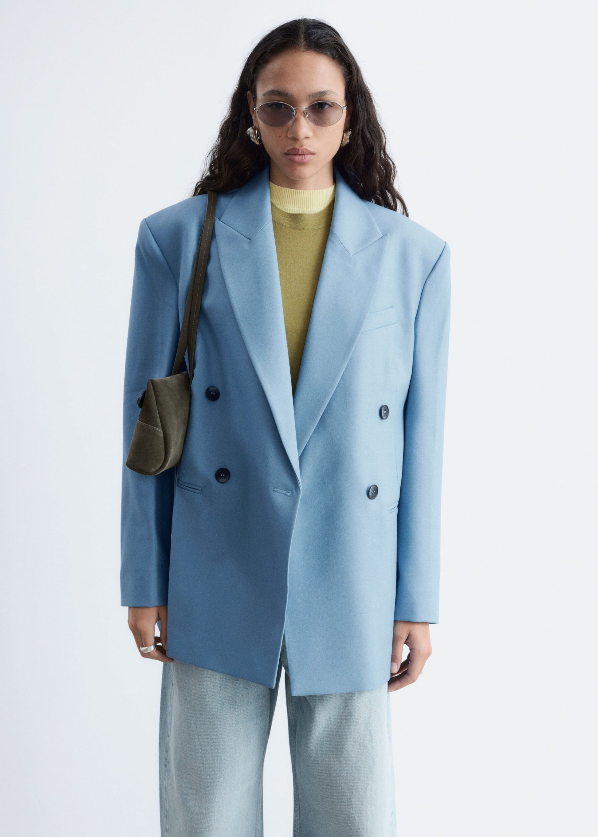 A nod to 80s tailoring, this double-breasted blazer is crafted from a wool blend and is cut in a structured silhouette detailed with shoulder pads and a peak lapel collar for extra definition. Style it over supple jersey layers.