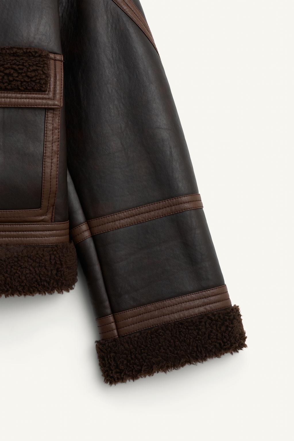 Lapel collar long sleeve jacket. Patch pockets with flaps on the front. Features visible topstitching. Tonal faux shearling inner lining. Front button fastening.