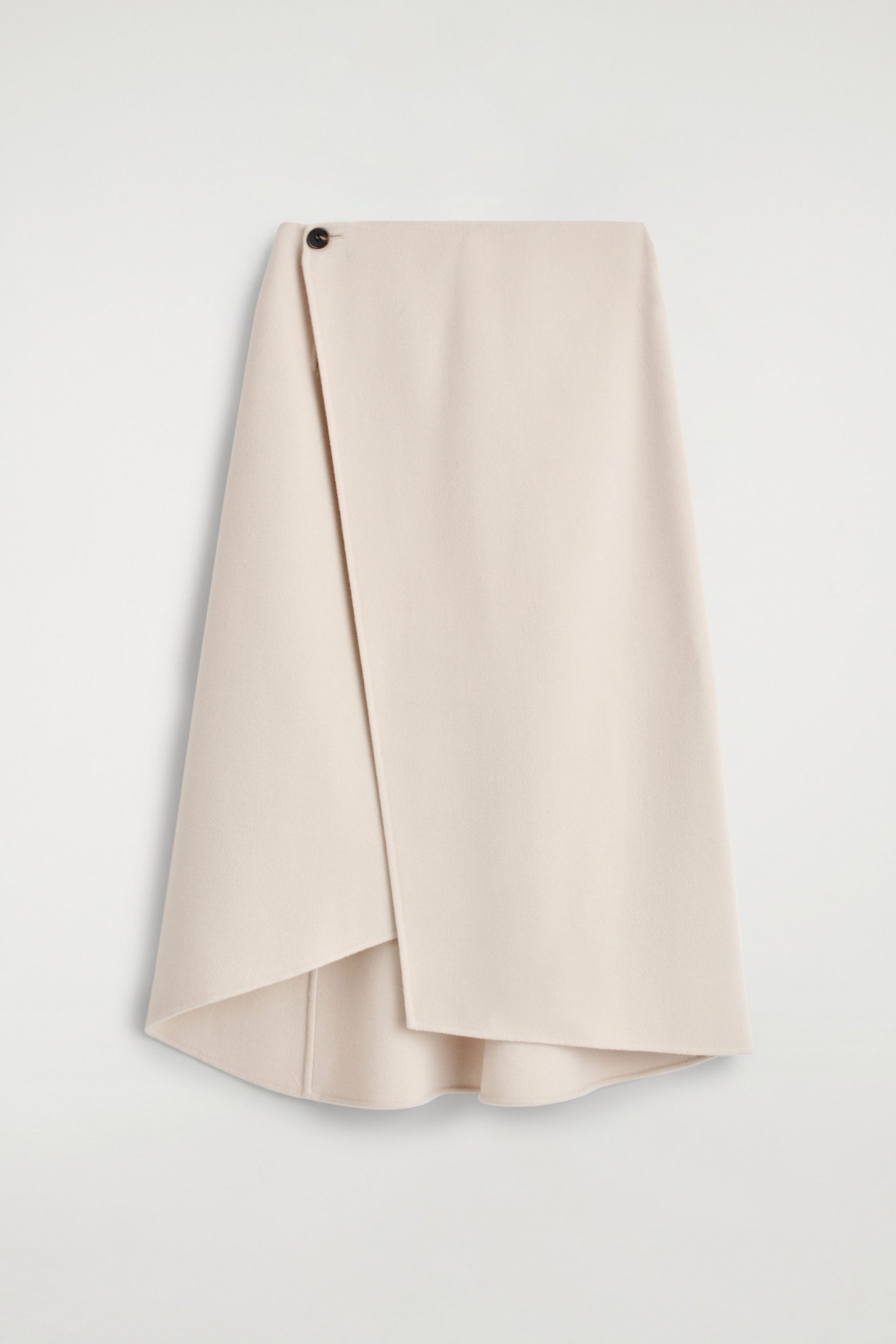 Clean lines and modern details bring refinement to this midi skirt. Rendered in neutral cream, it's crafted from RWS wool that's double-faced for a premium hand feel and shaped in a wrap-over silhouette that buttons neatly at the waist. Style it with knee-high boots.
