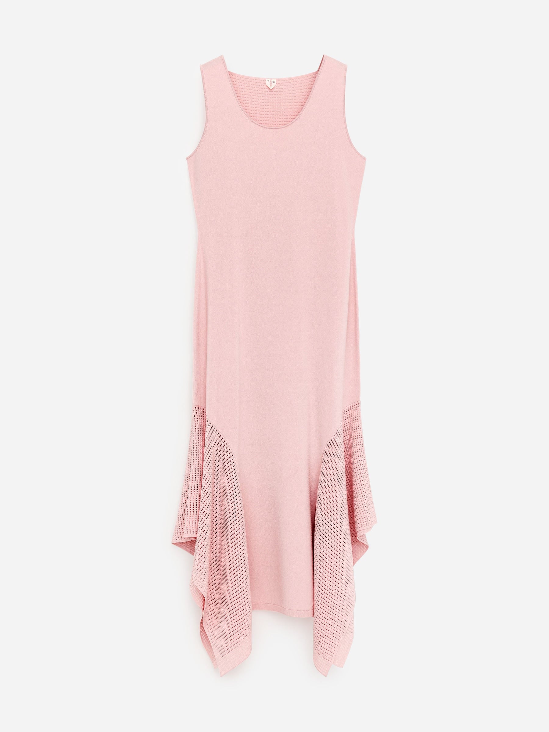 In our new women’s collection, soft silhouettes, contrasting textures and reworked essentials explore freedom through movement, sensuality and ease. This sleeveless knitted dress features an asymmetric hem shaped by draped pointelle panels. Detailed with a scoop neck. Slim fit.