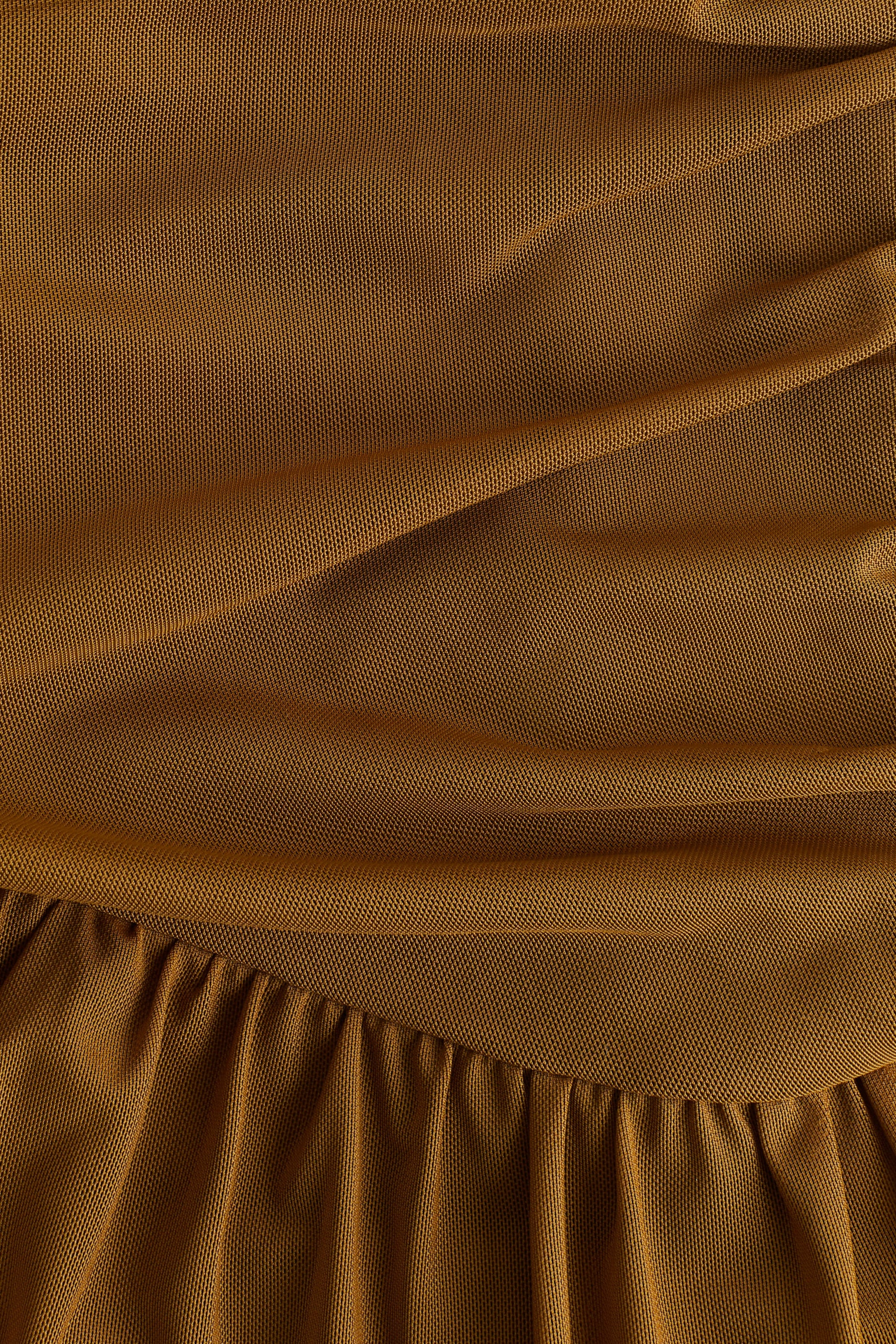 Ankle-length dress in sheer mesh with a round neckline and long sleeves. Fitted bodice with gathers at the sides to create a draped effect, diagonal seam with gathers at the waist and a flared skirt. Partly lined.
