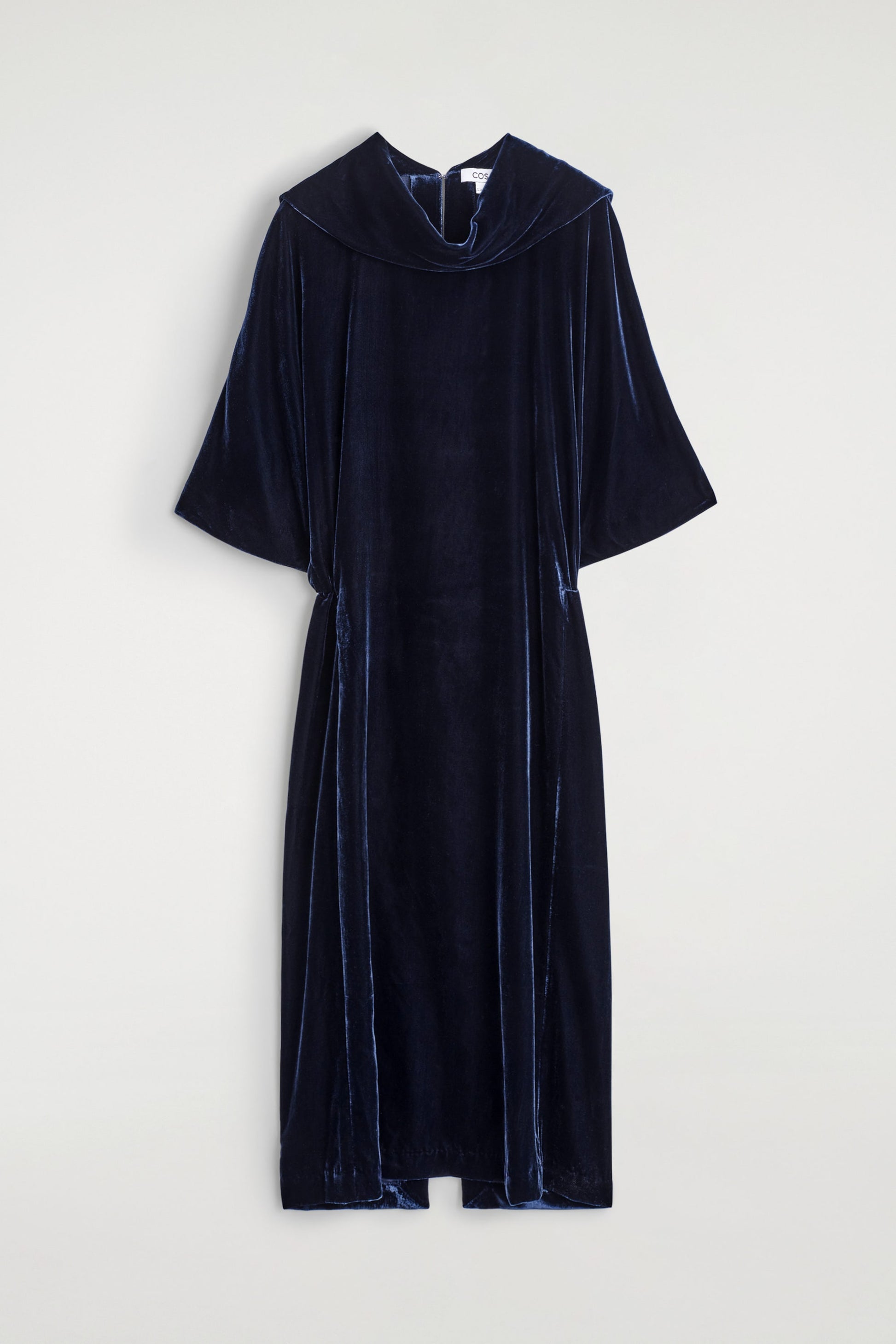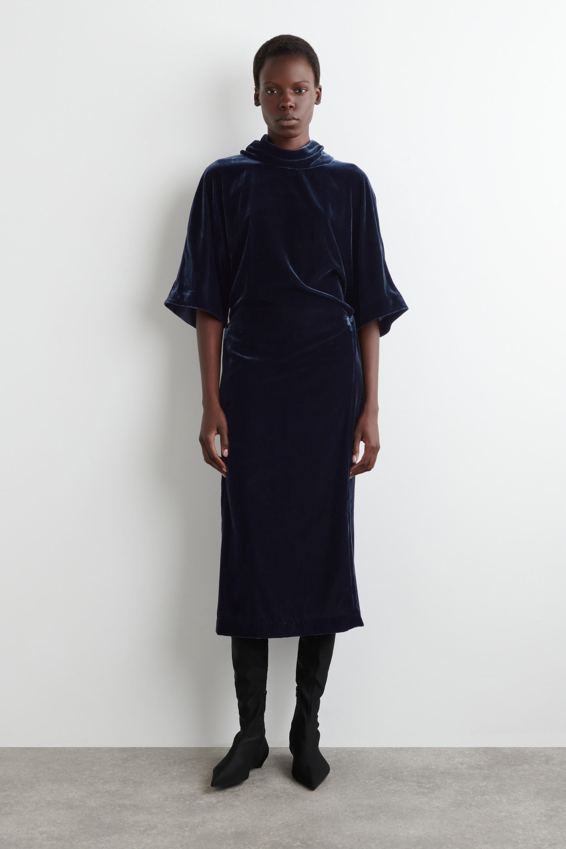 Magnetic silhouettes lead the Autumn Winter 2025 collection for soirée season. Made from sumptuous velvet, this refined midi dress is designed with a draped funnel neck, elasticated blouson waist and batwing sleeves. Style it with kitten heels.