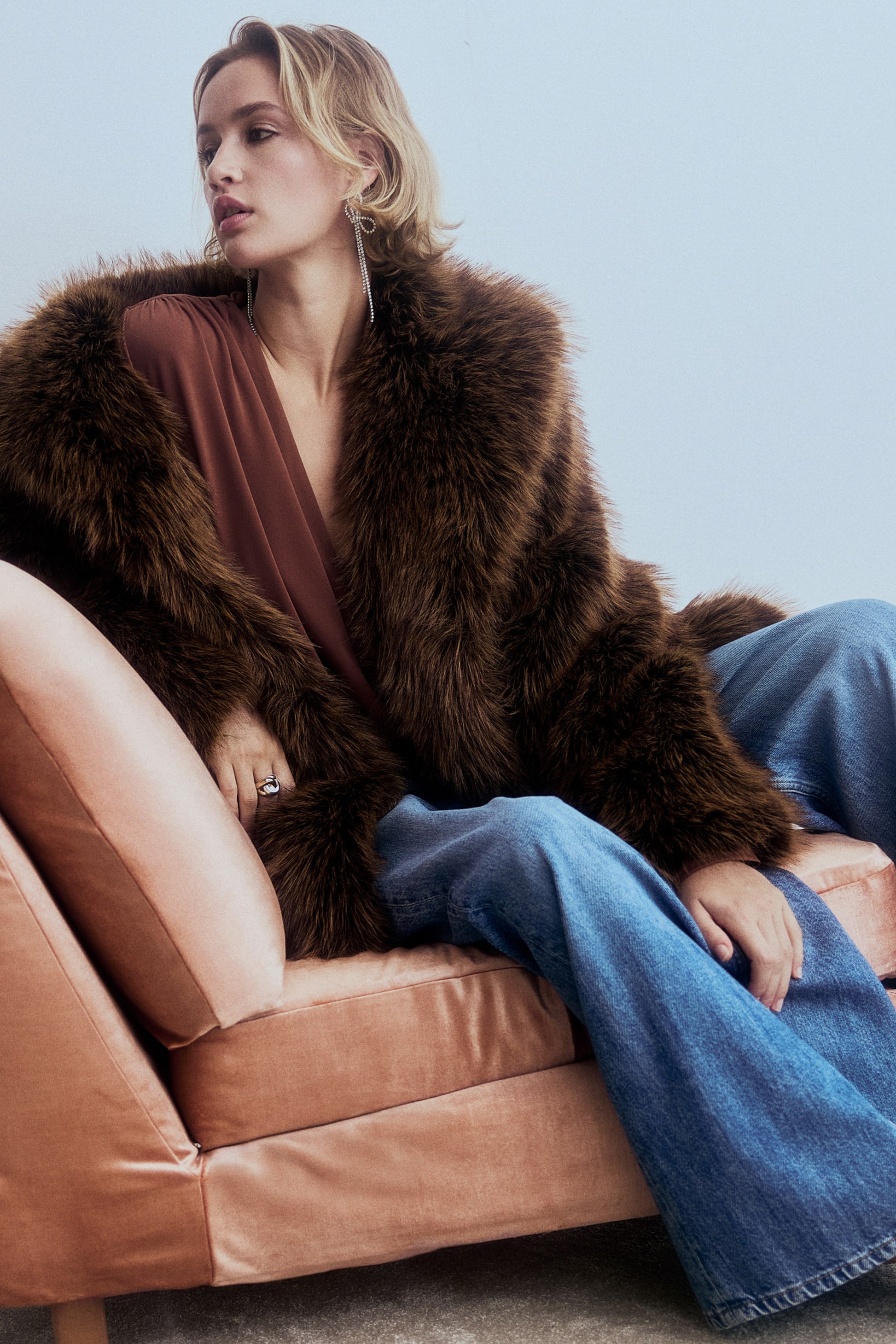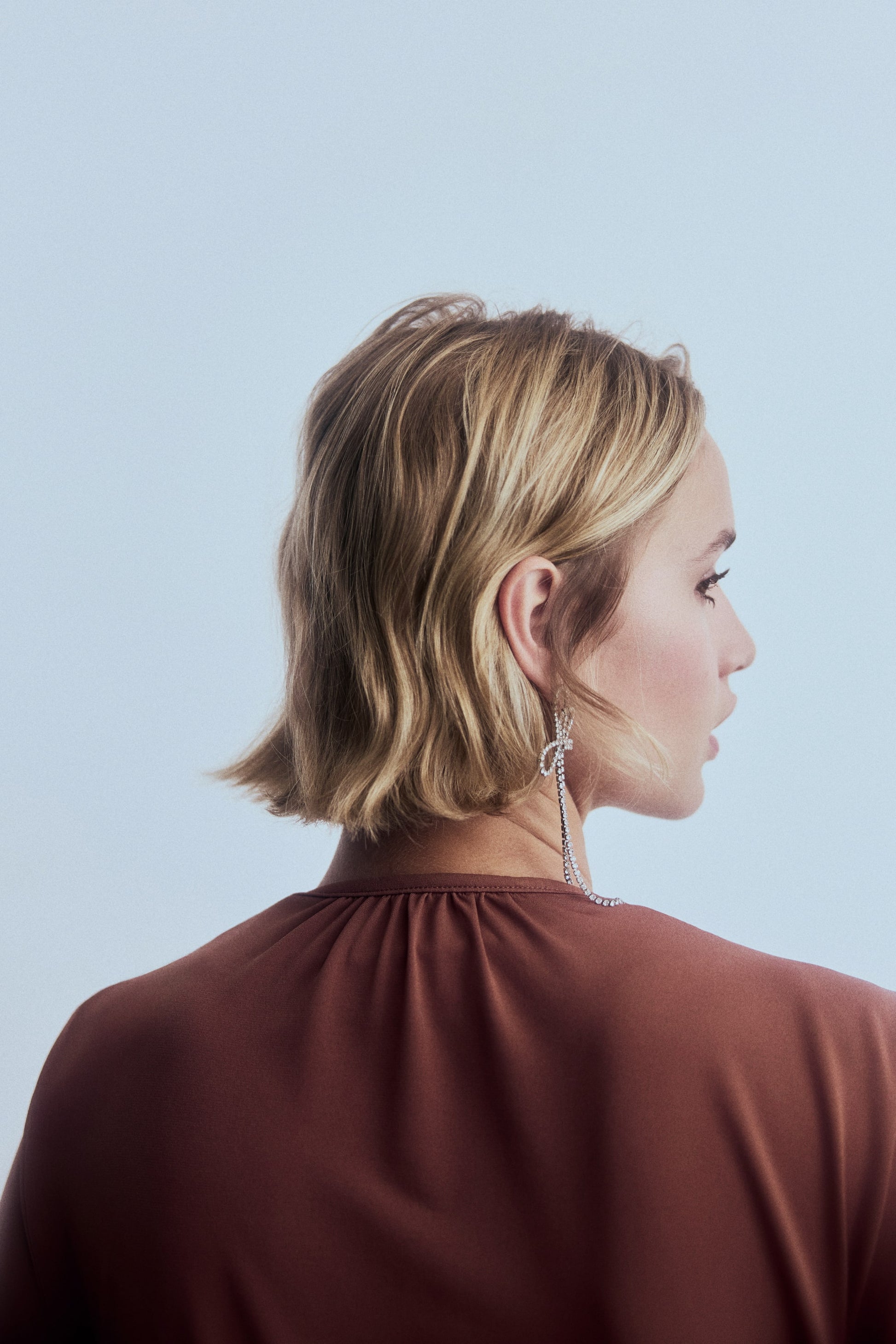- Deep neckline, V-neck