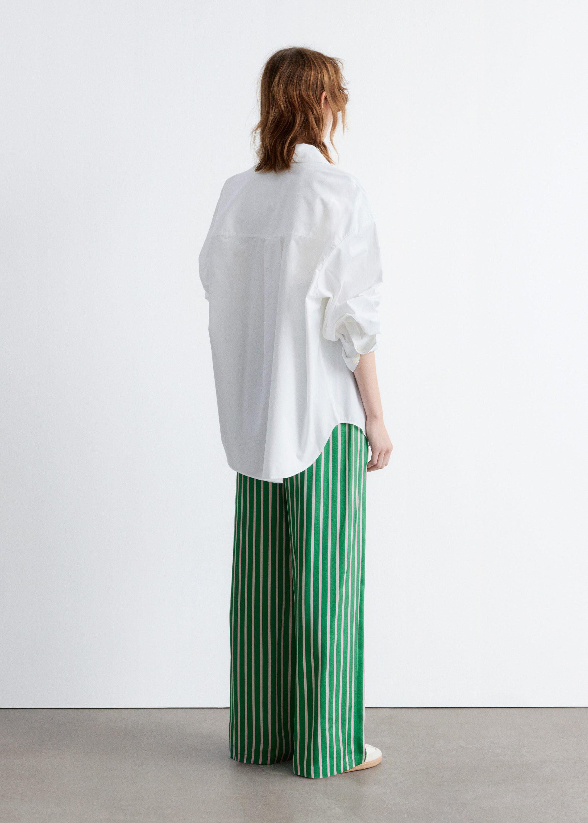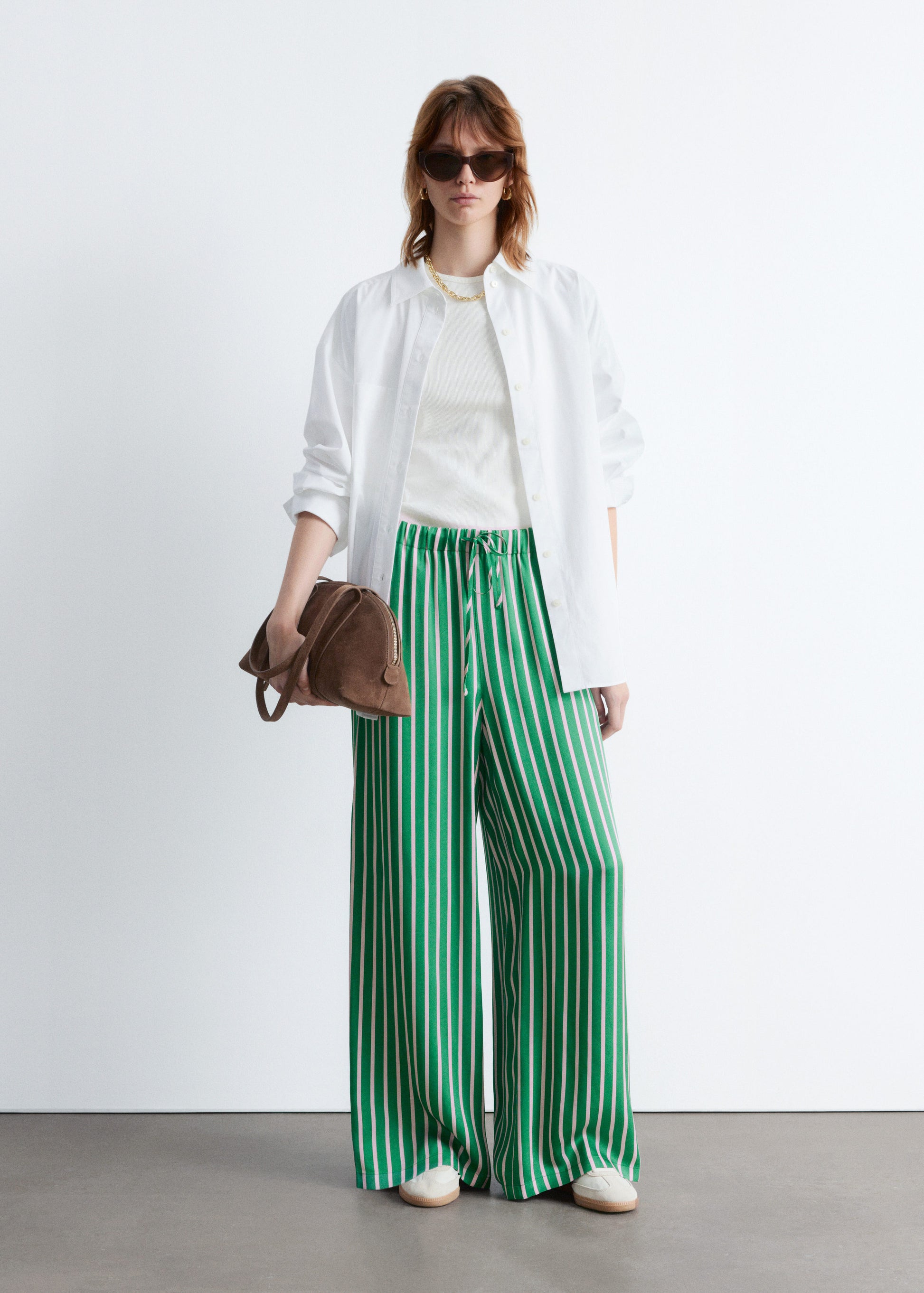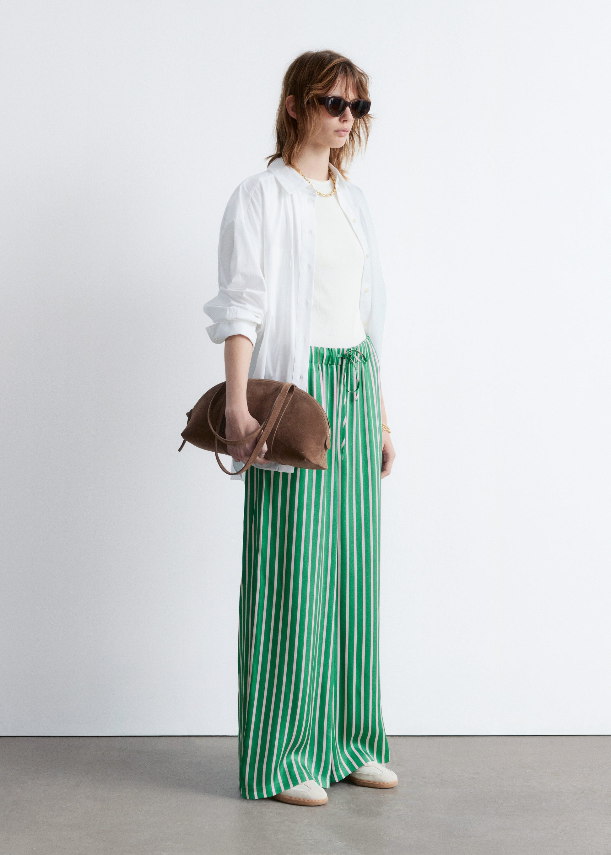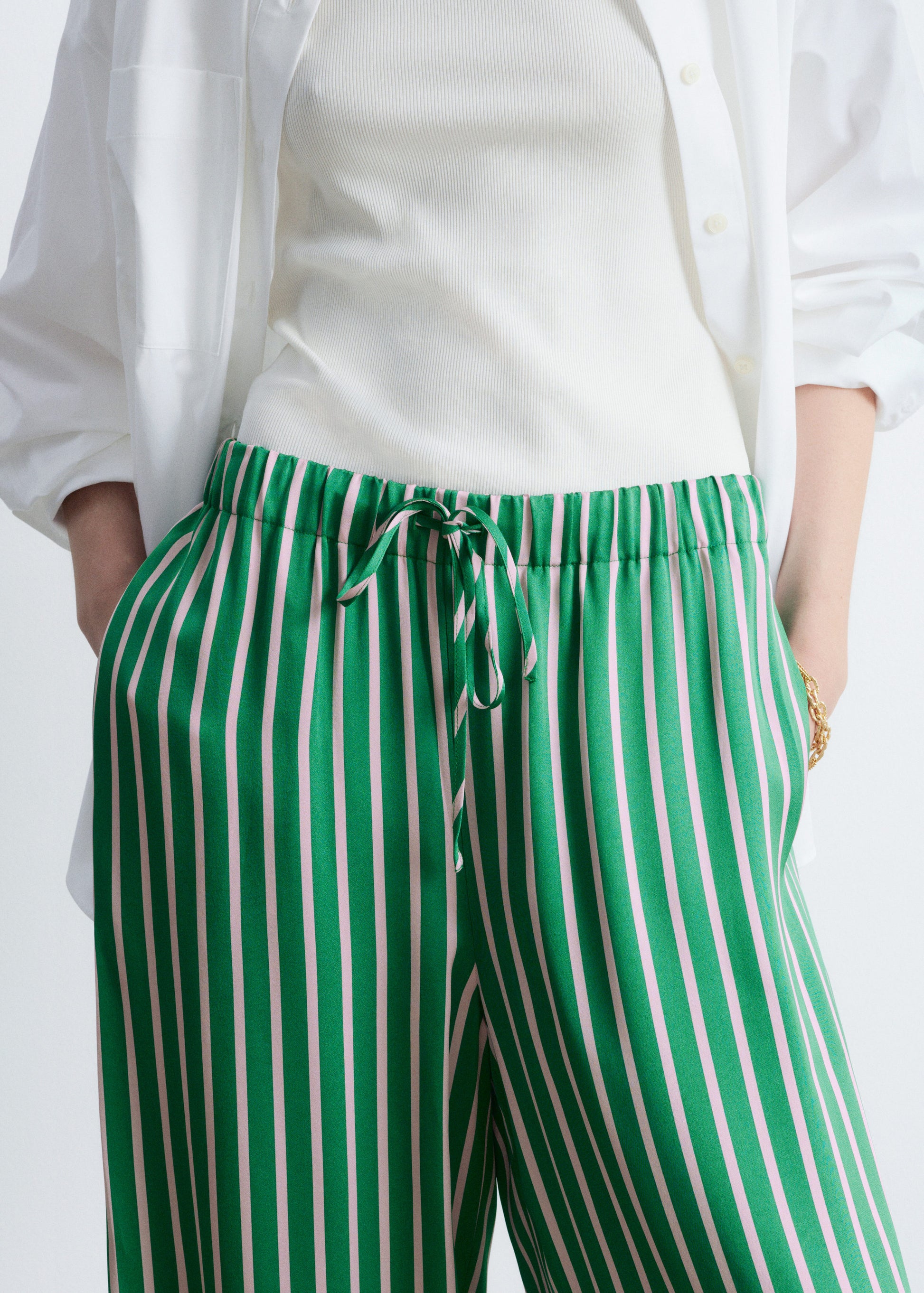These trousers are crafted from a lightweight satin fabric offering a soft-to-skin feel. Designed in a loose silhouette, they feature an elastic drawstring waist with thin, adjustable tie-bands for a comfortable pull-on fit. Finished with subtle side seam pockets.