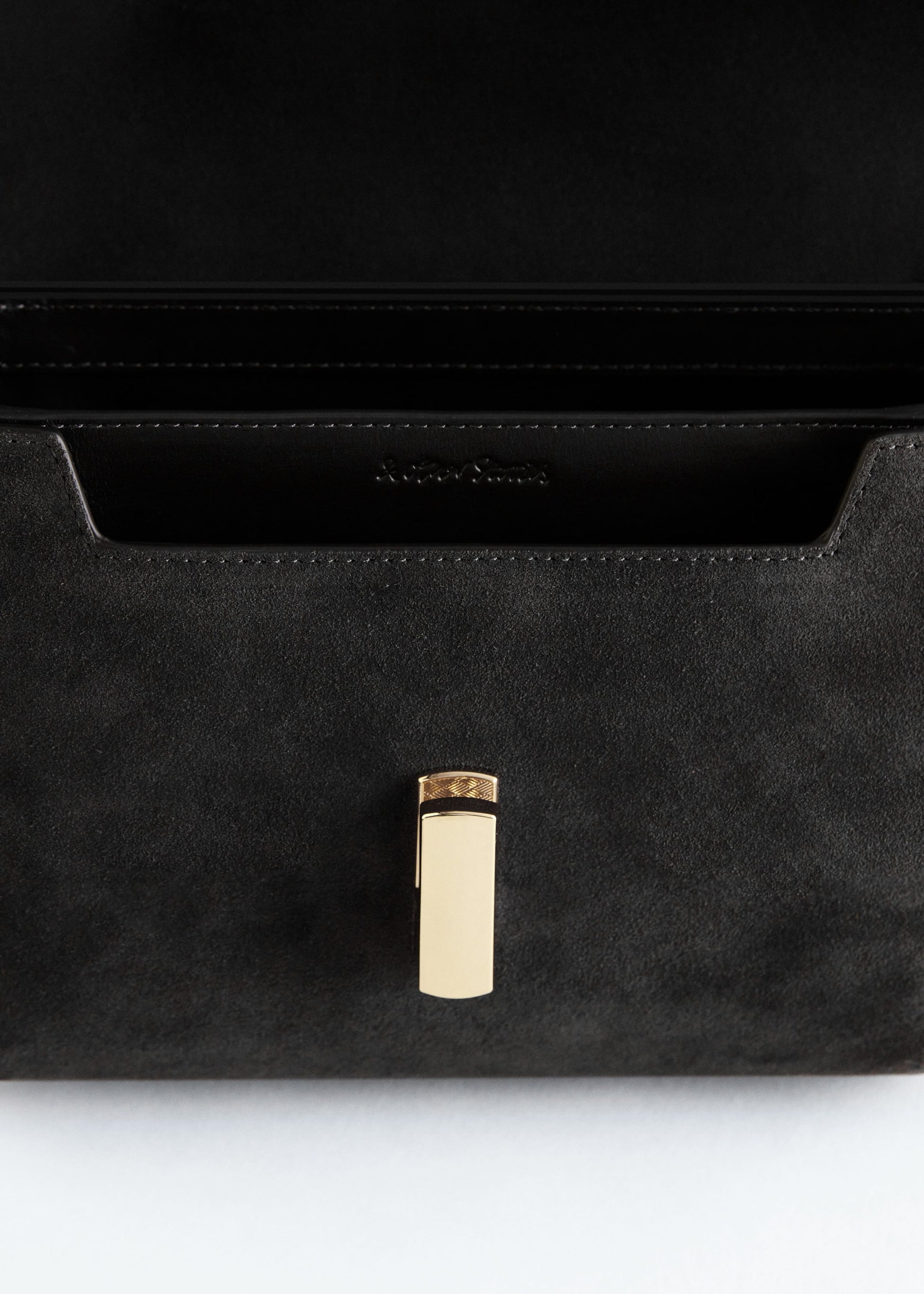 This crossbody bag, crafted in India, features a suede front base paired with a leather back and flap, creating an interesting play of textures. It includes a flap buckle, an adjustable shoulder strap, and an internal patch pocket to keep smaller belongings secure.