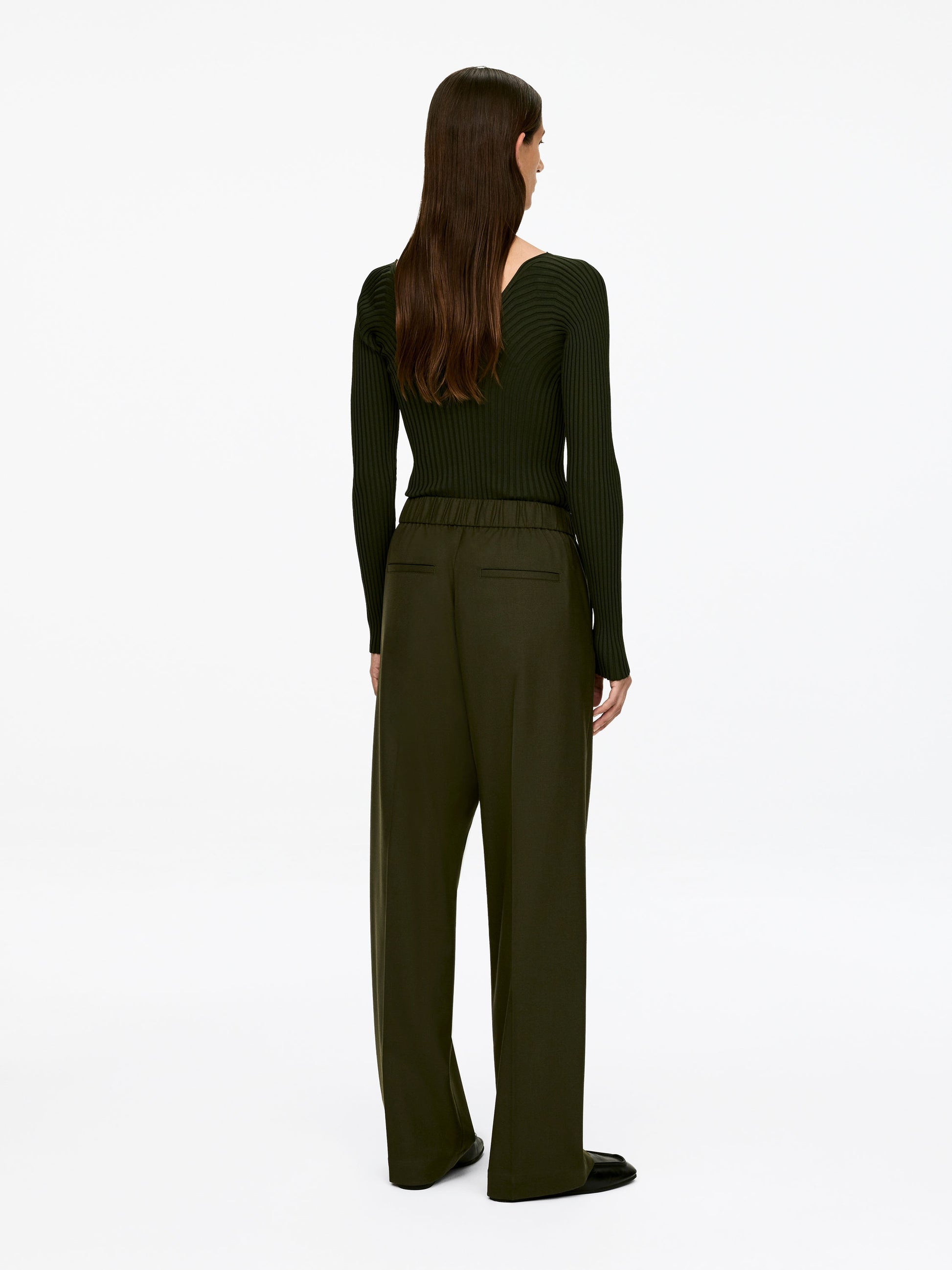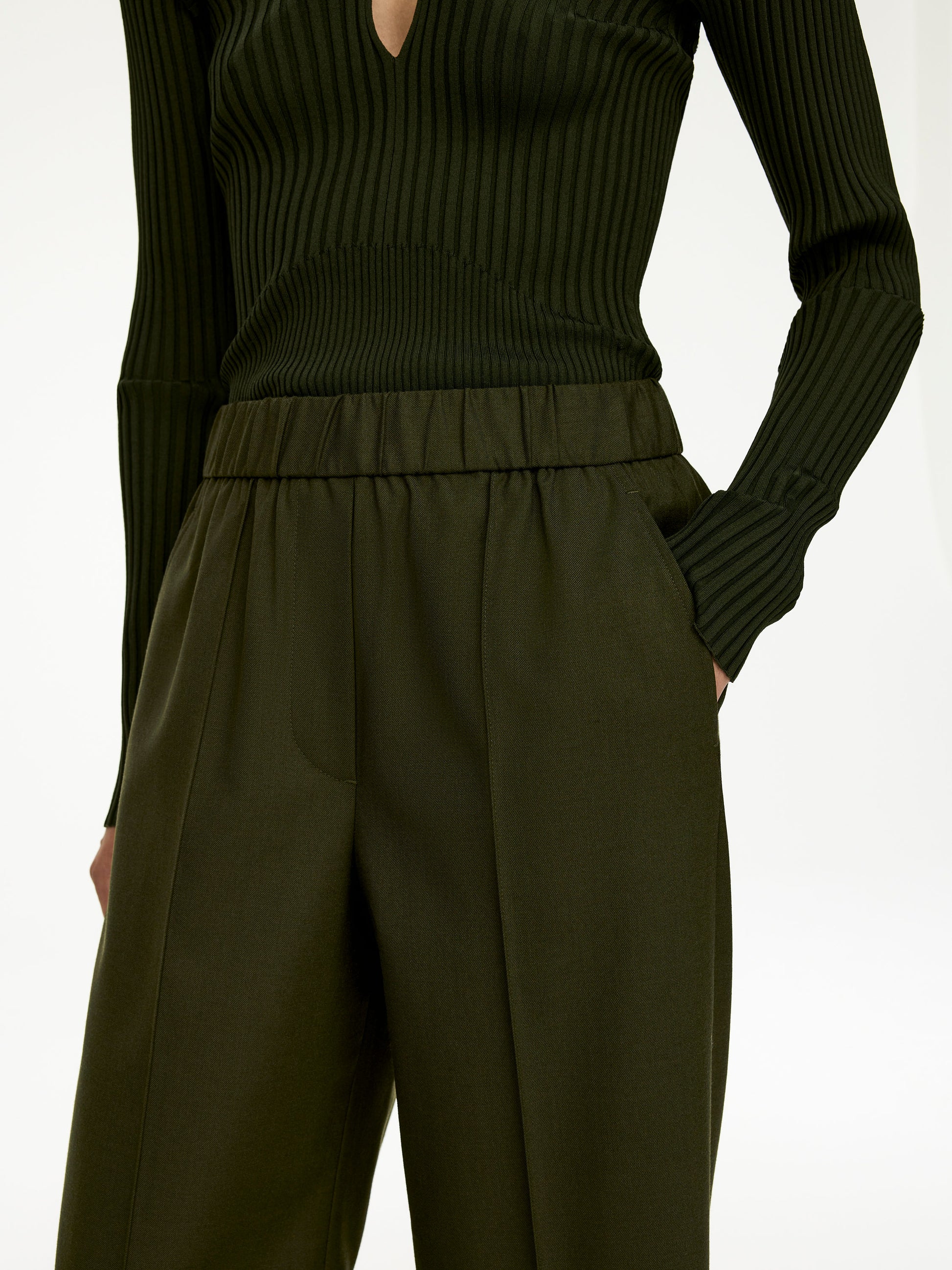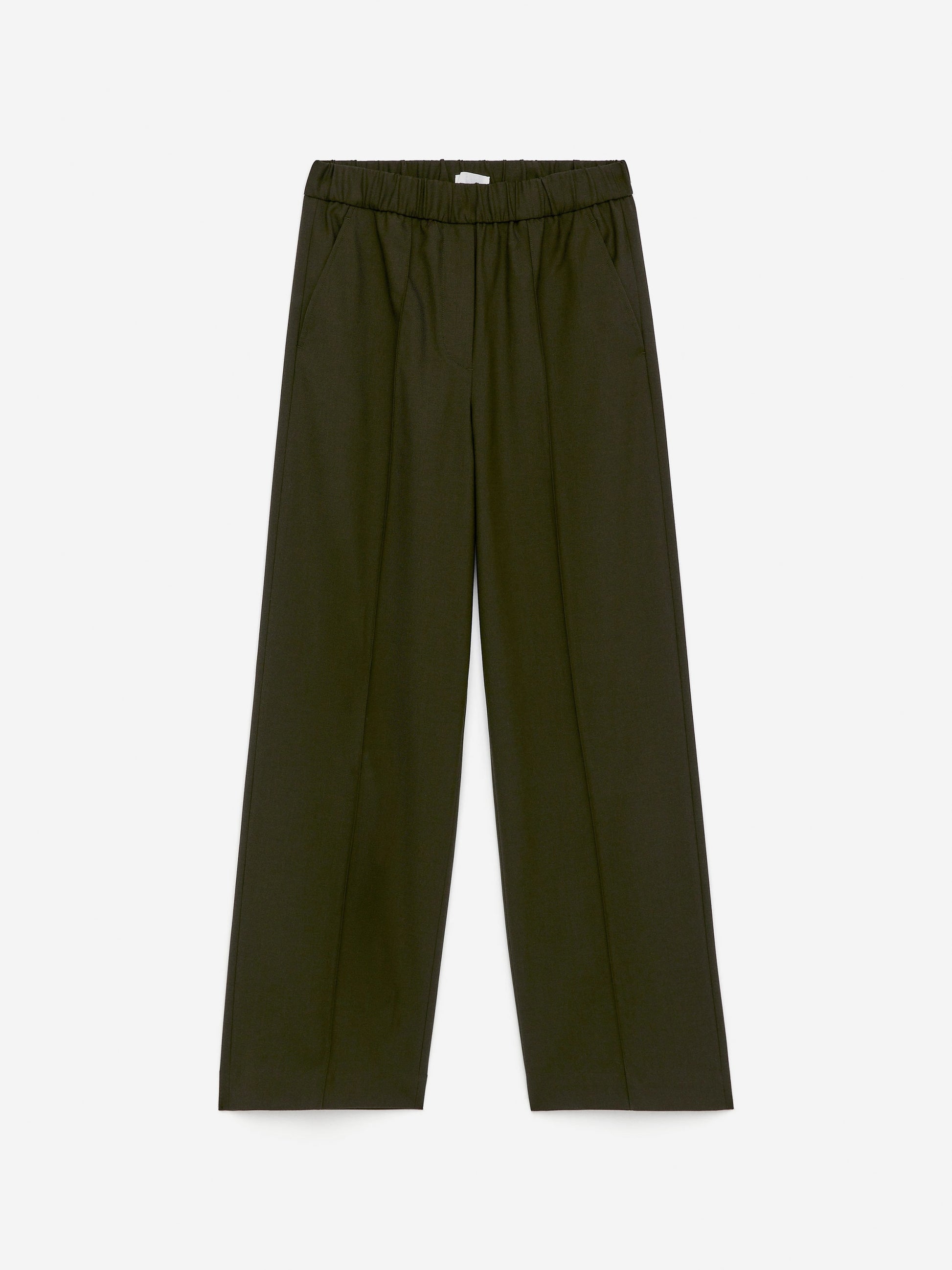 Trousers with an elasticated waist and straight legs. This casual style features sewn creases at the front and pressed creases at the back. Finished with a mock fly, side pockets, and a single welt back pocket.