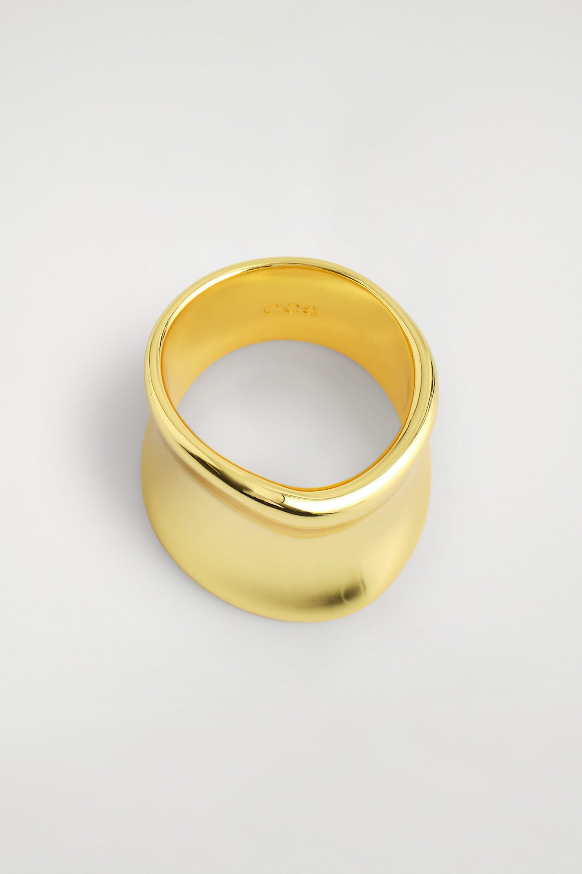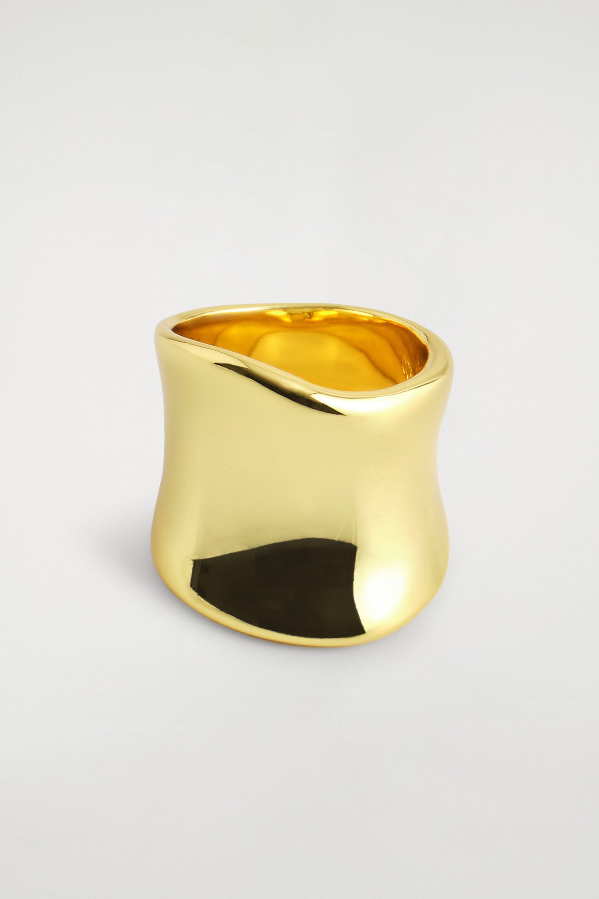 The striking simplicity of this ring is captured in its clean, sculpted silhouette. It's crafted from gold-plated recycled brass that's polished to a high shine and has a curved, elongated shape.
